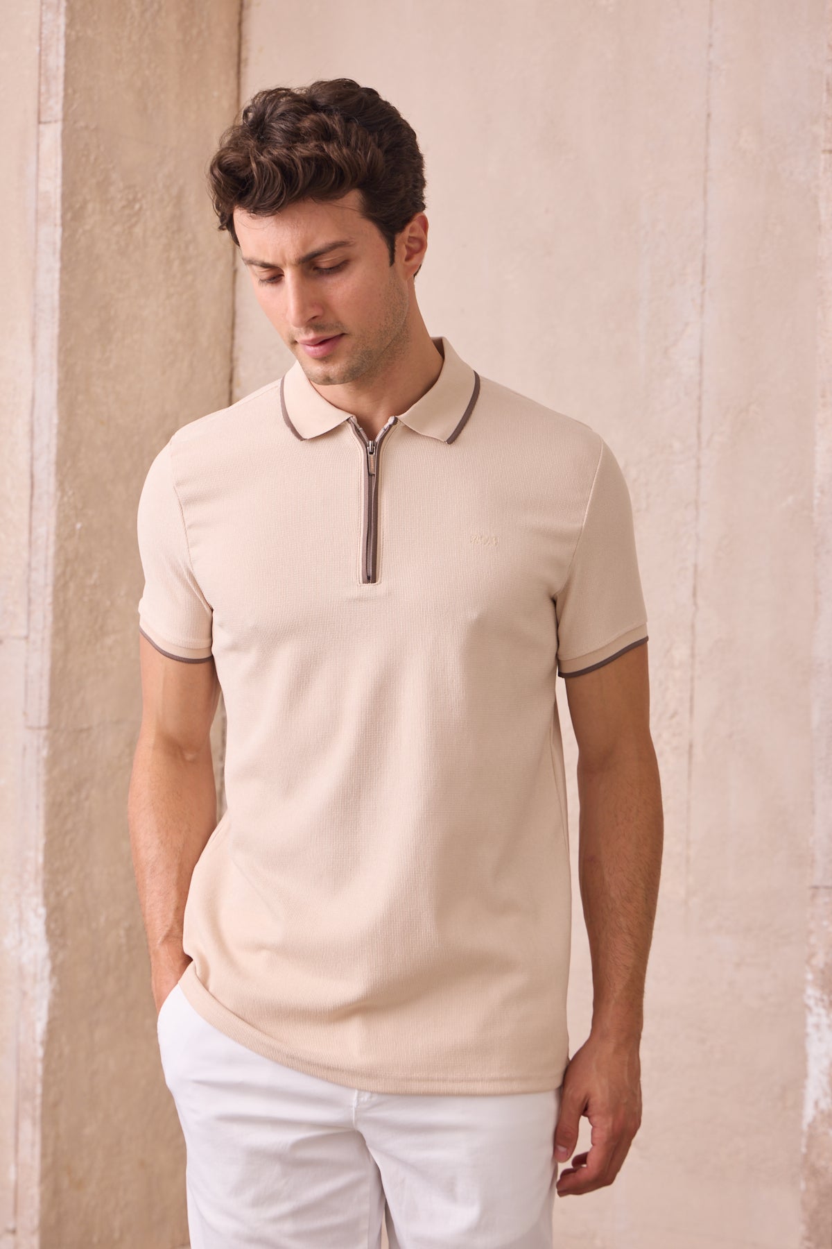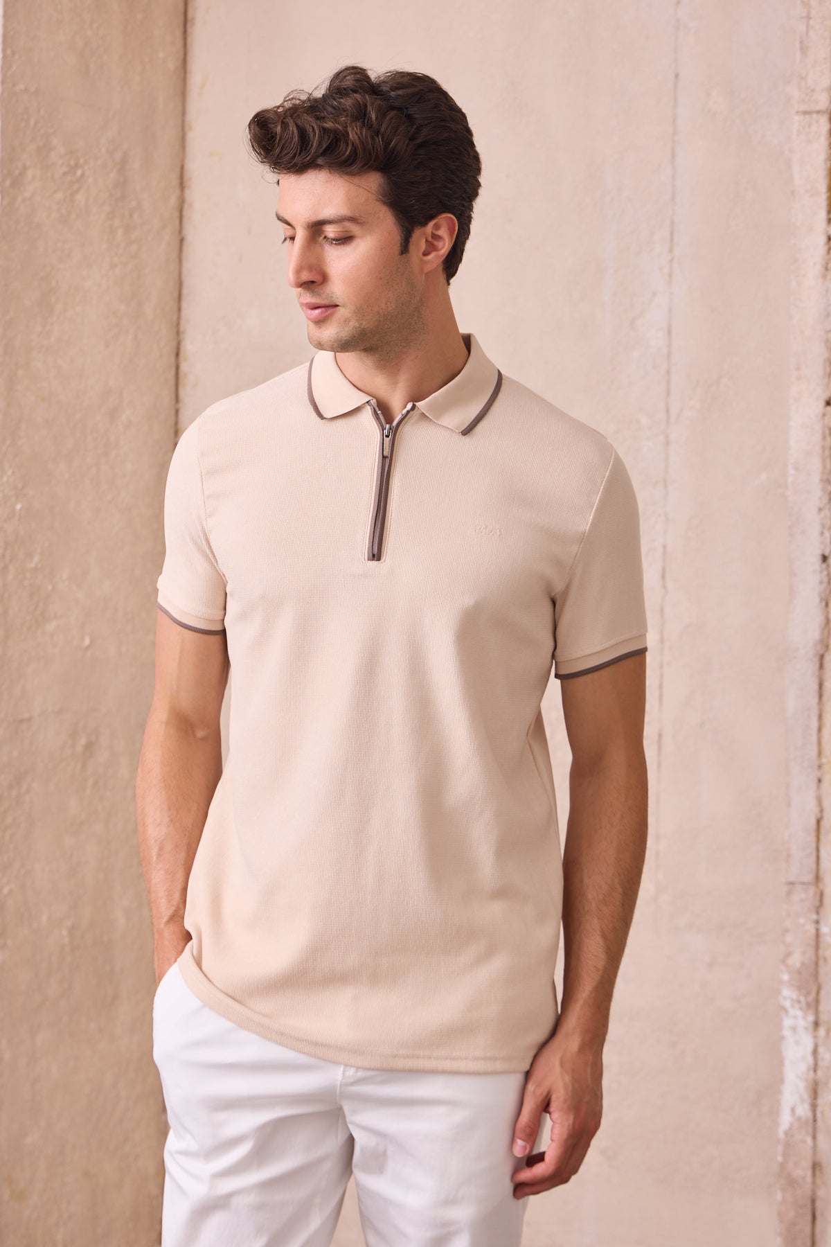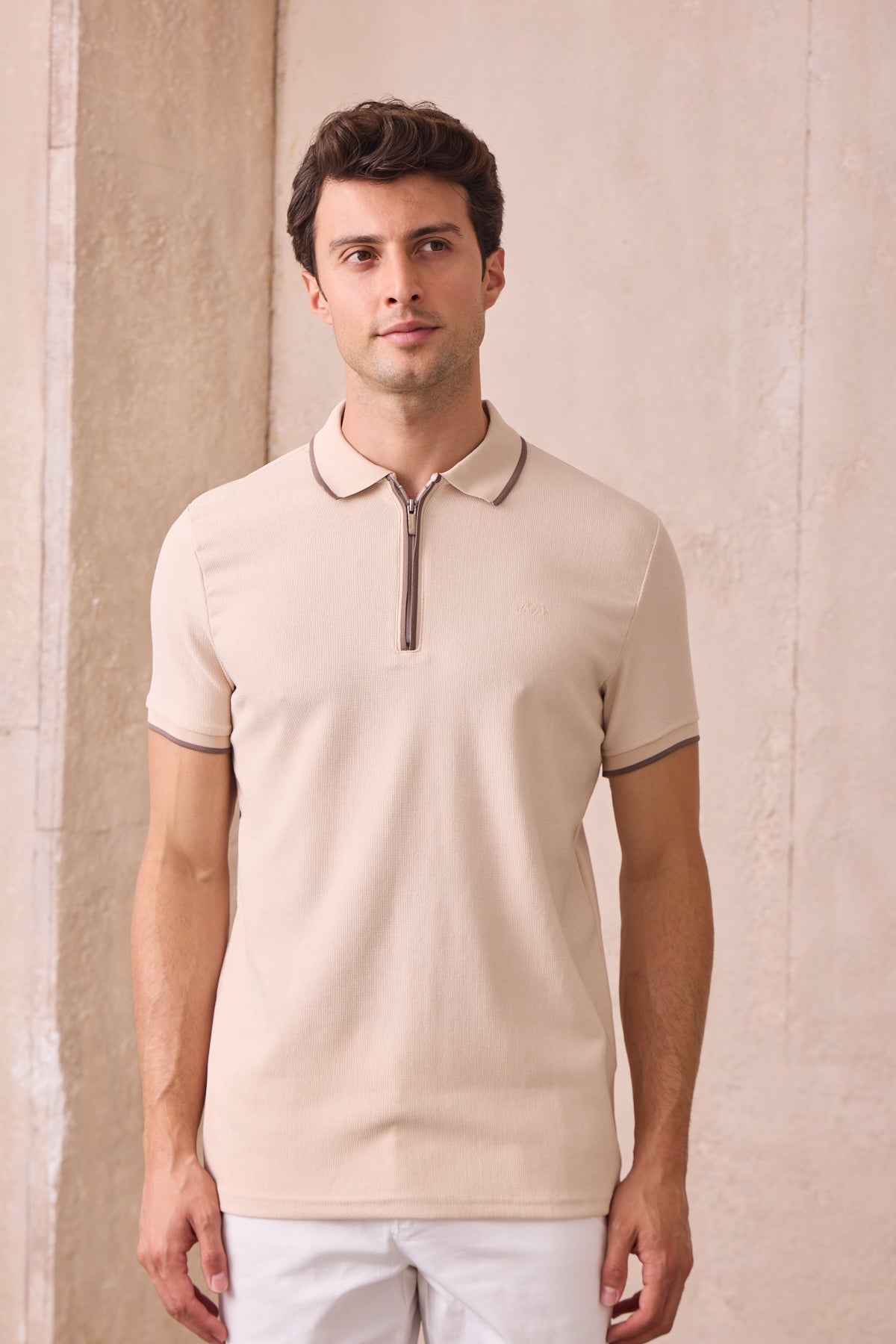 Kısa Kollu Örme Slim Fit Fermuarlı Bej Erkek Polo Tişört