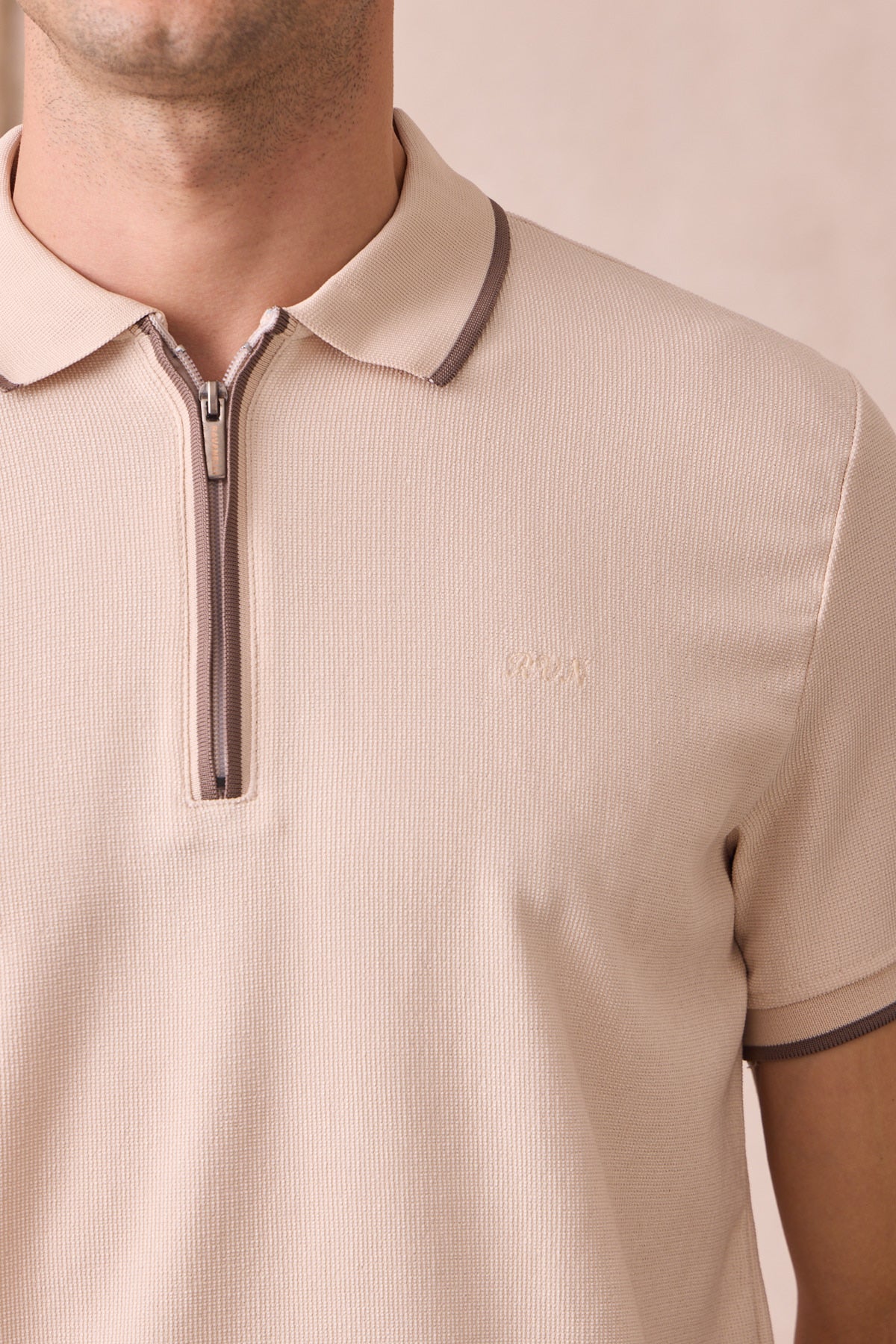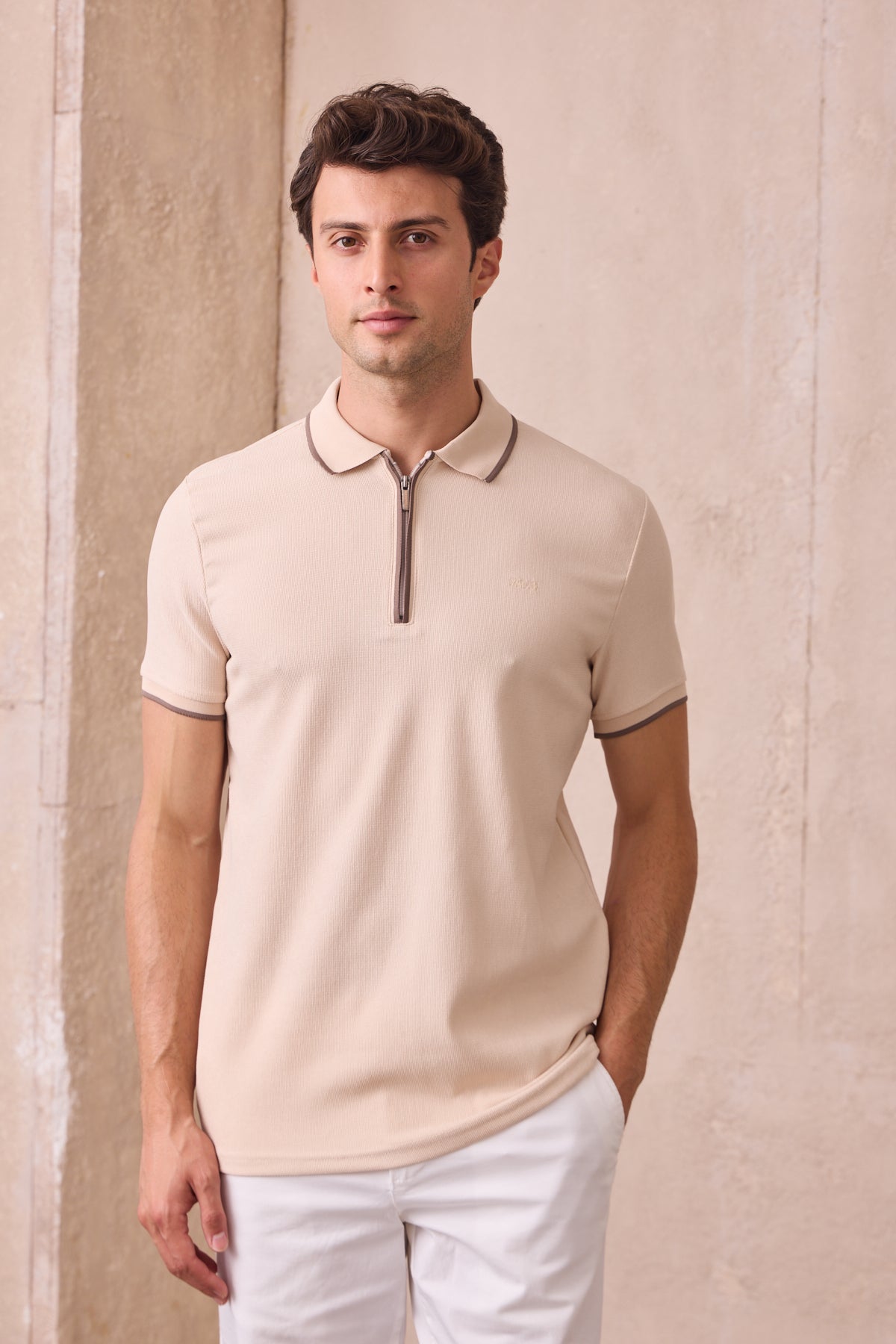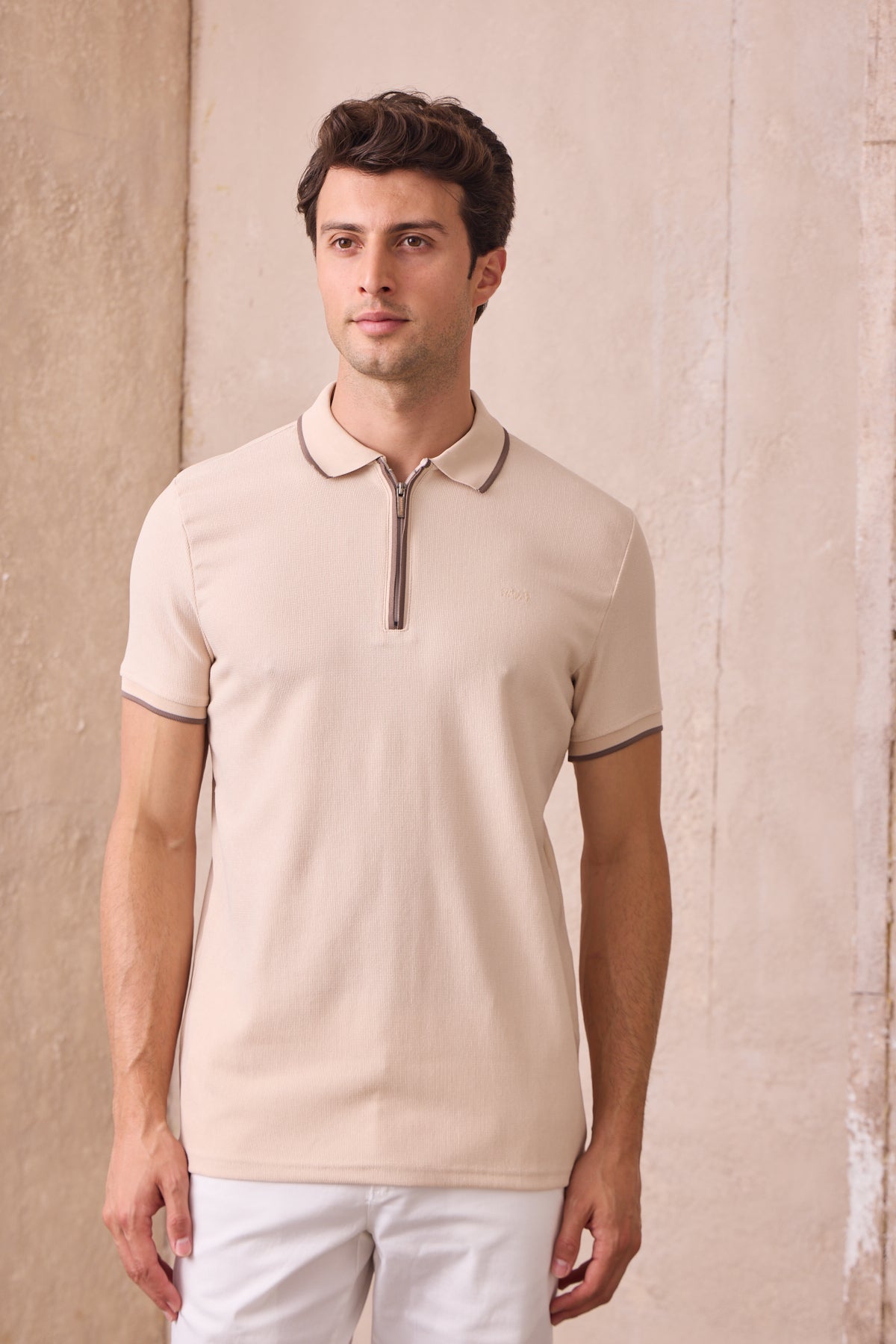 Kısa Kollu Örme Slim Fit Fermuarlı Bej Erkek Polo Tişört