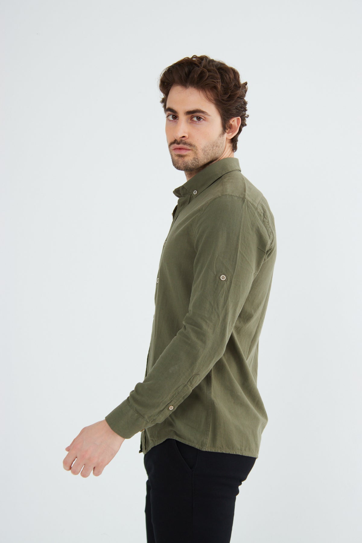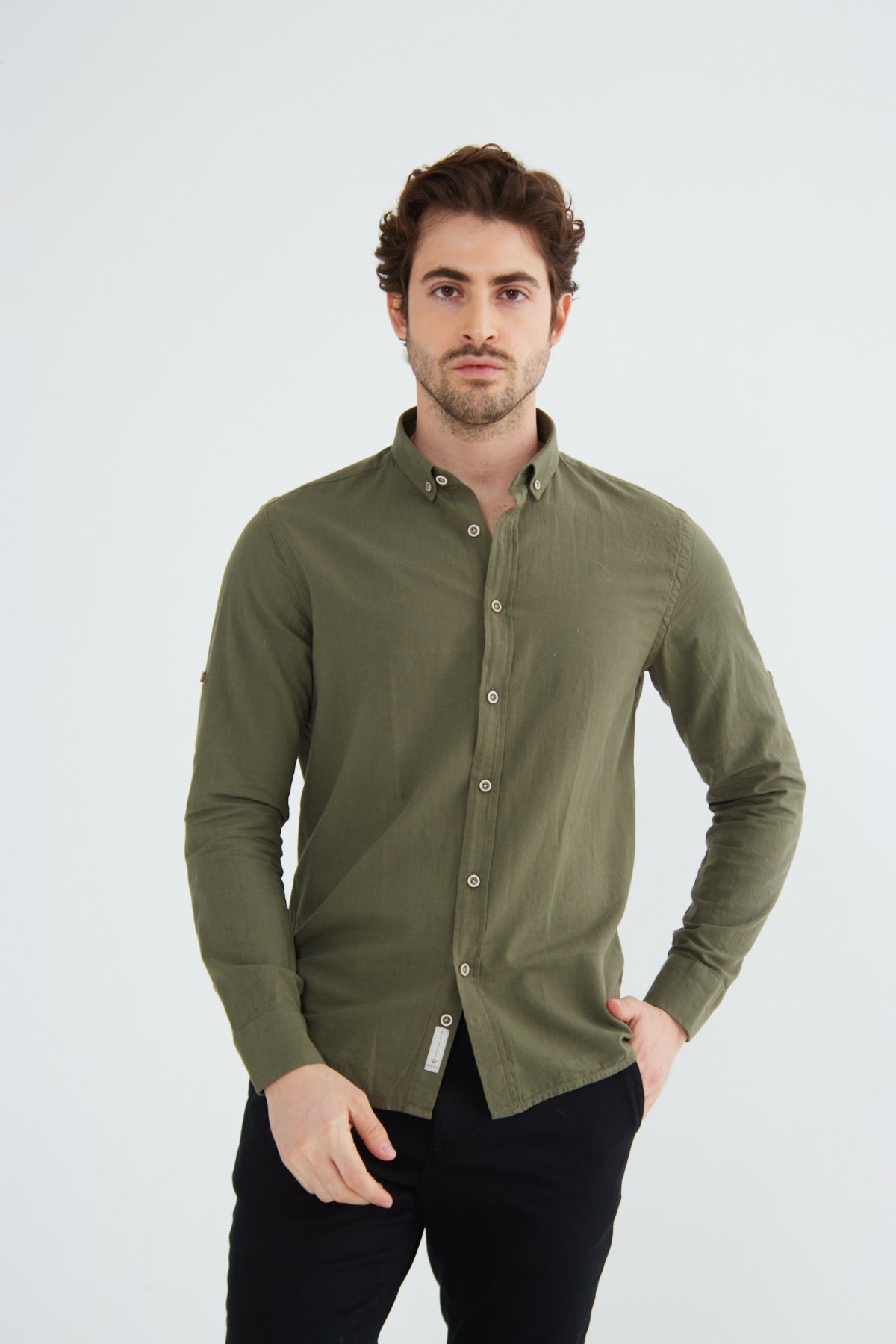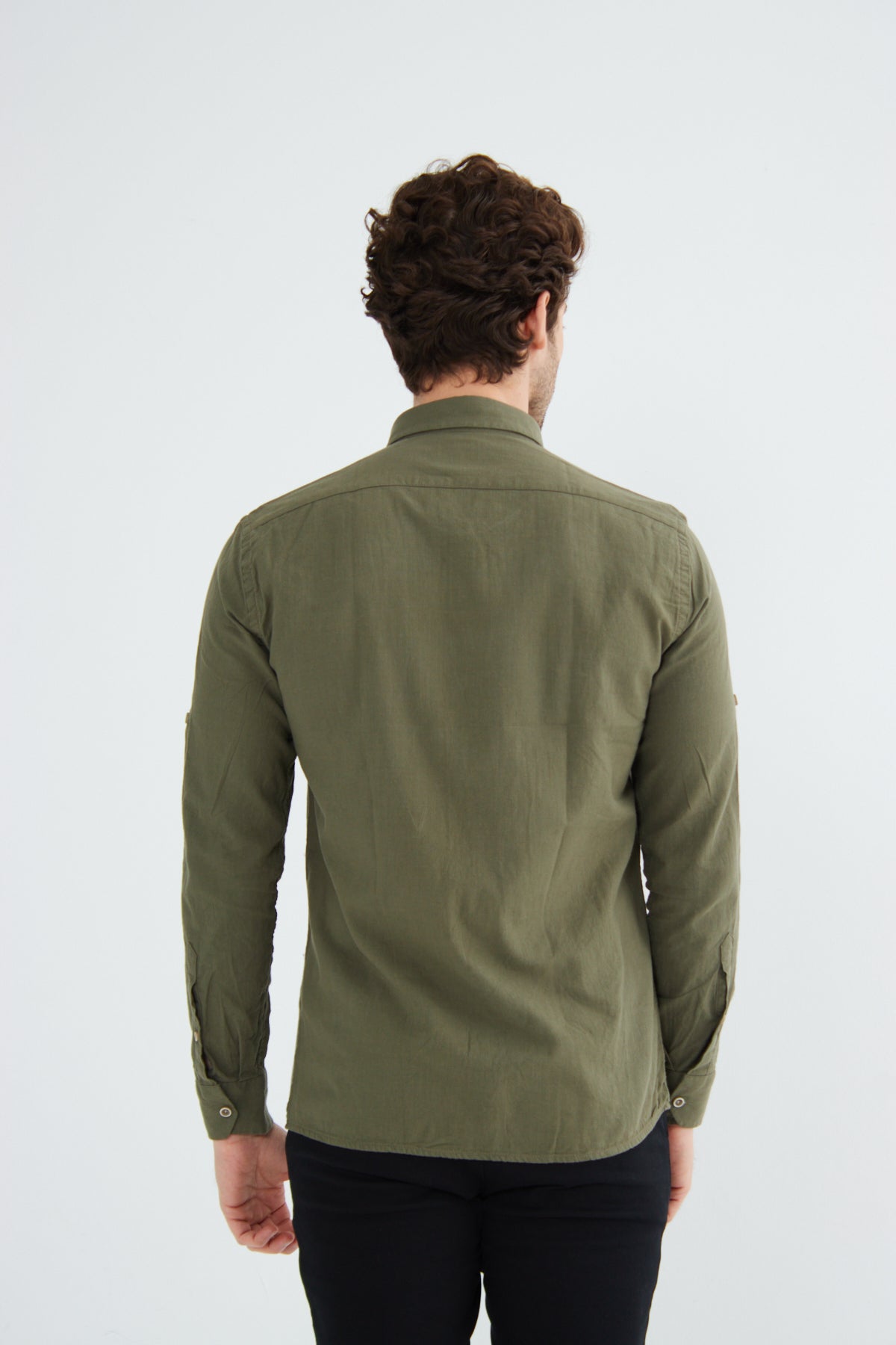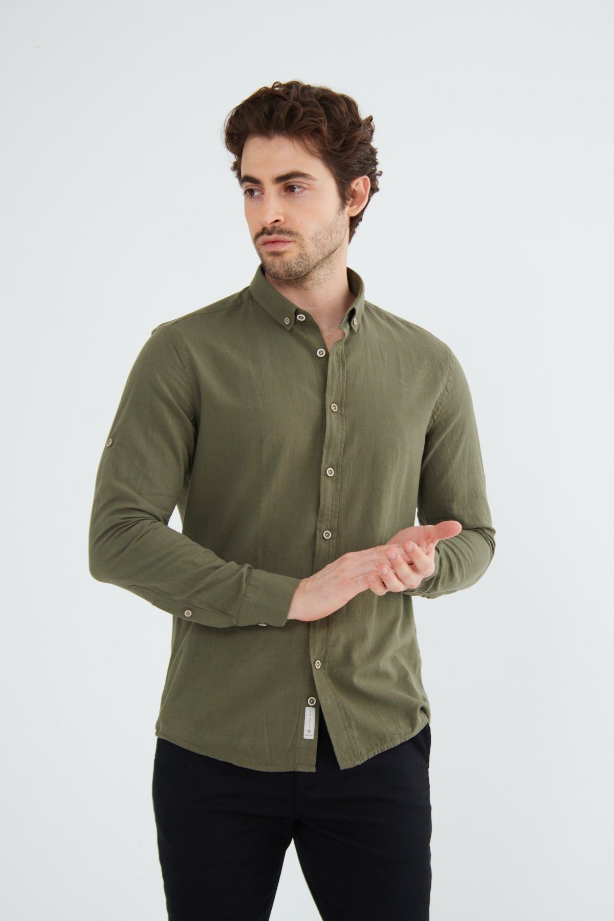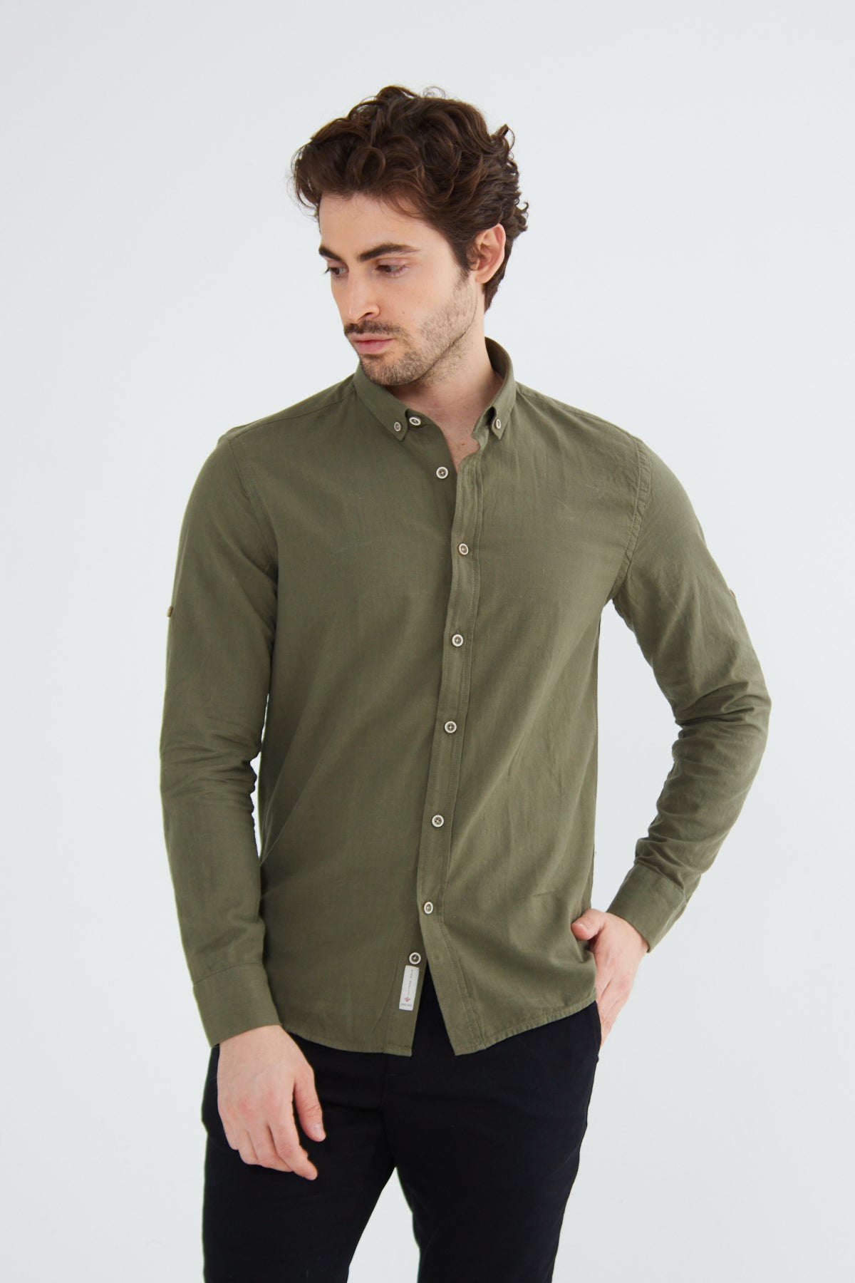 %100 Pamuk Keten Görünümlü Slim Fit Flam Koyu Haki Erkek Gömlek