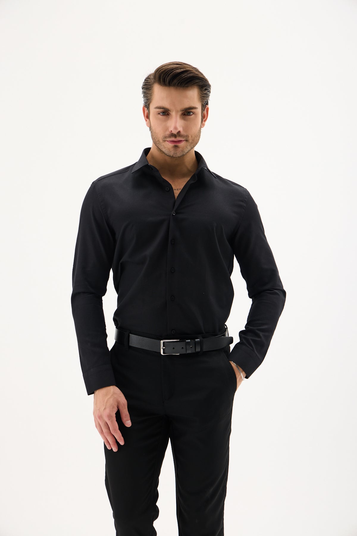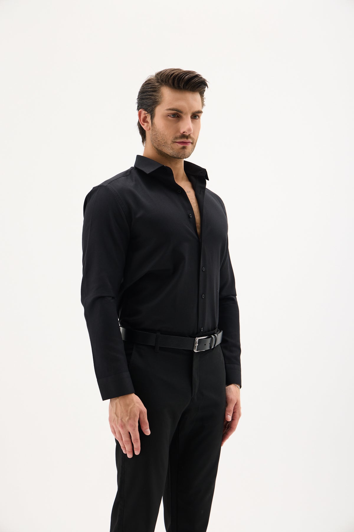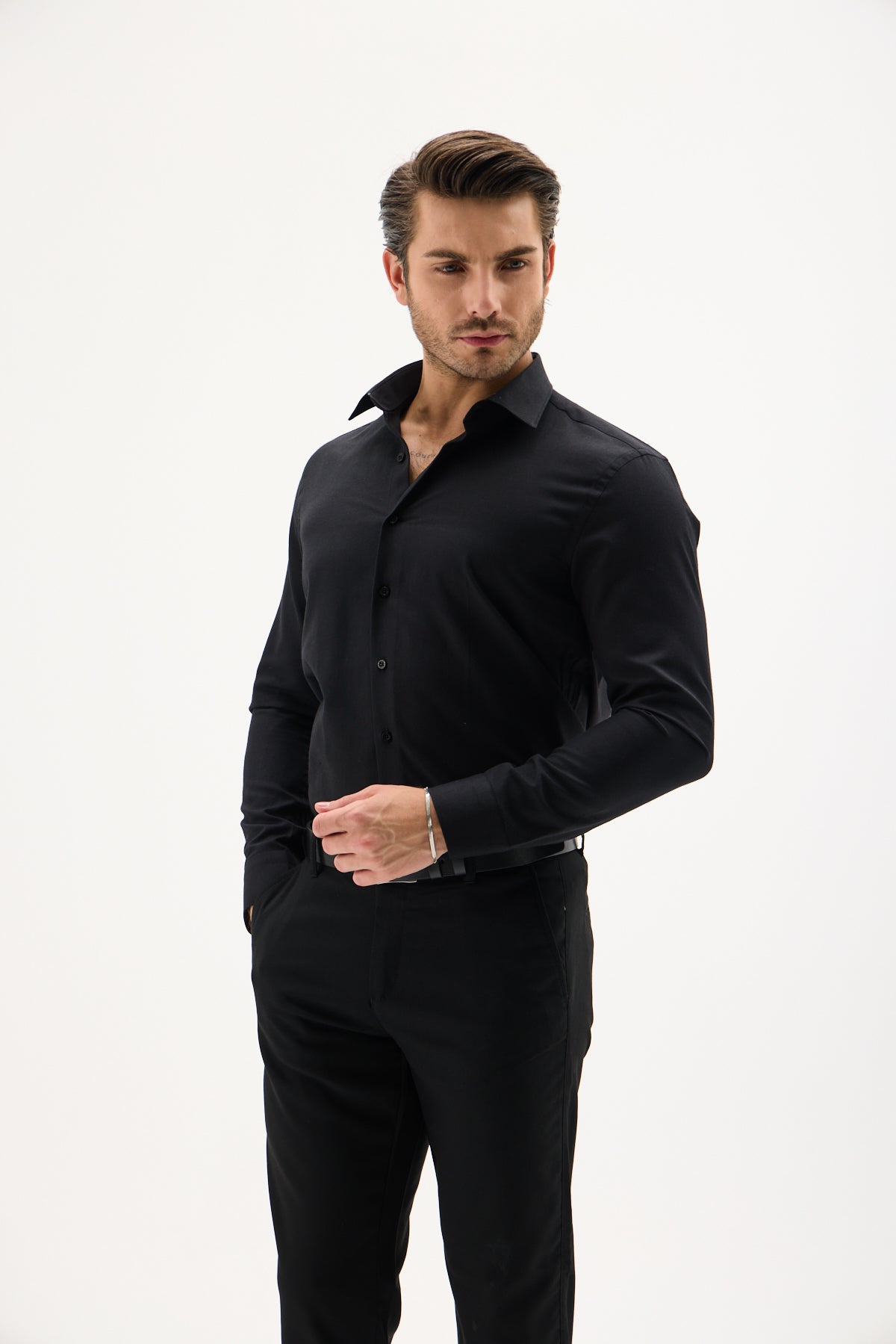 Saten Likra Slim Fit Siyah Erkek Gömlek
