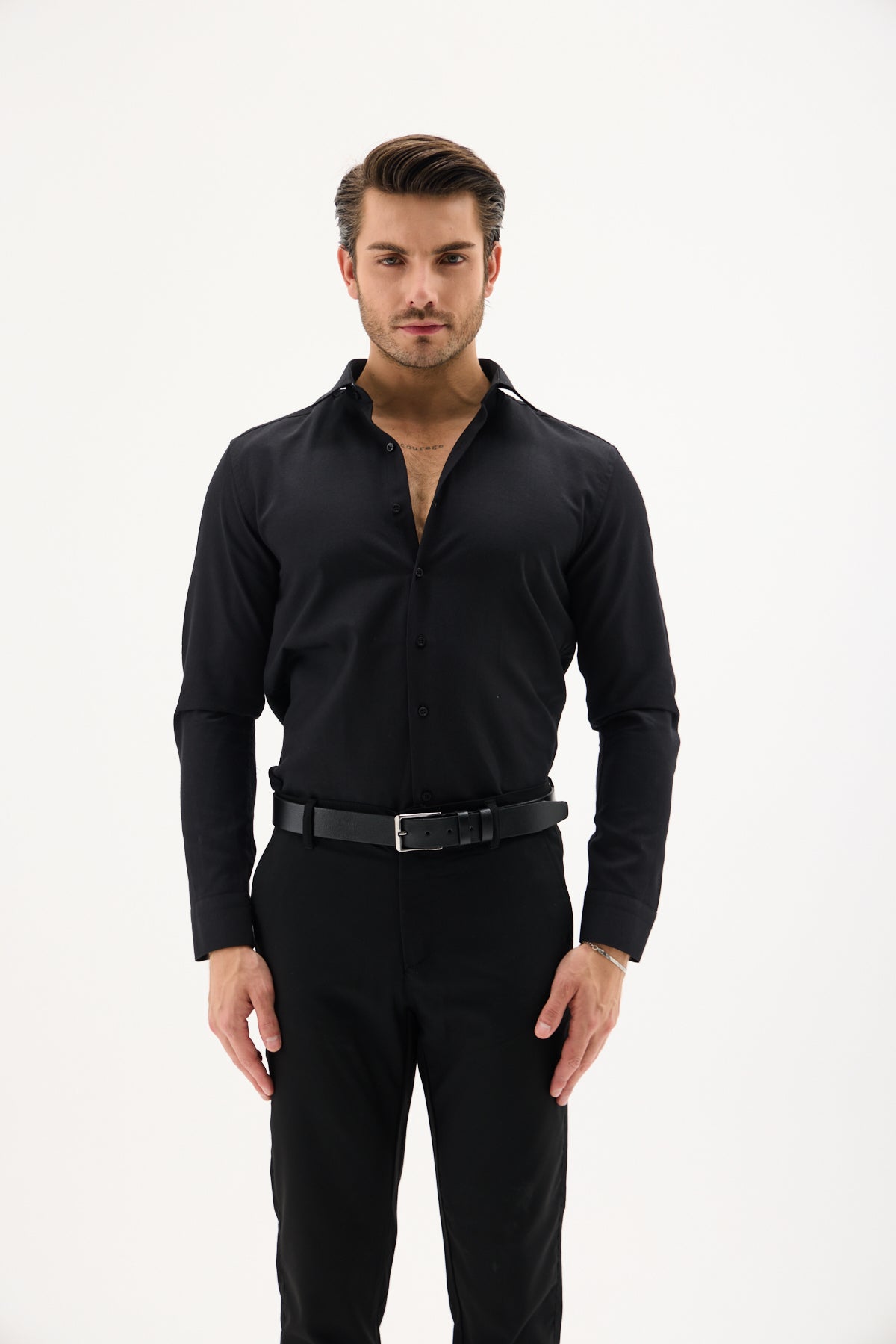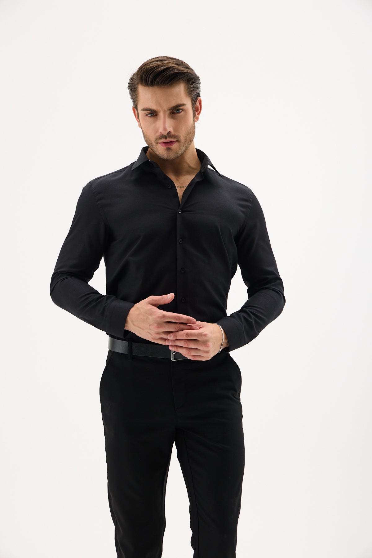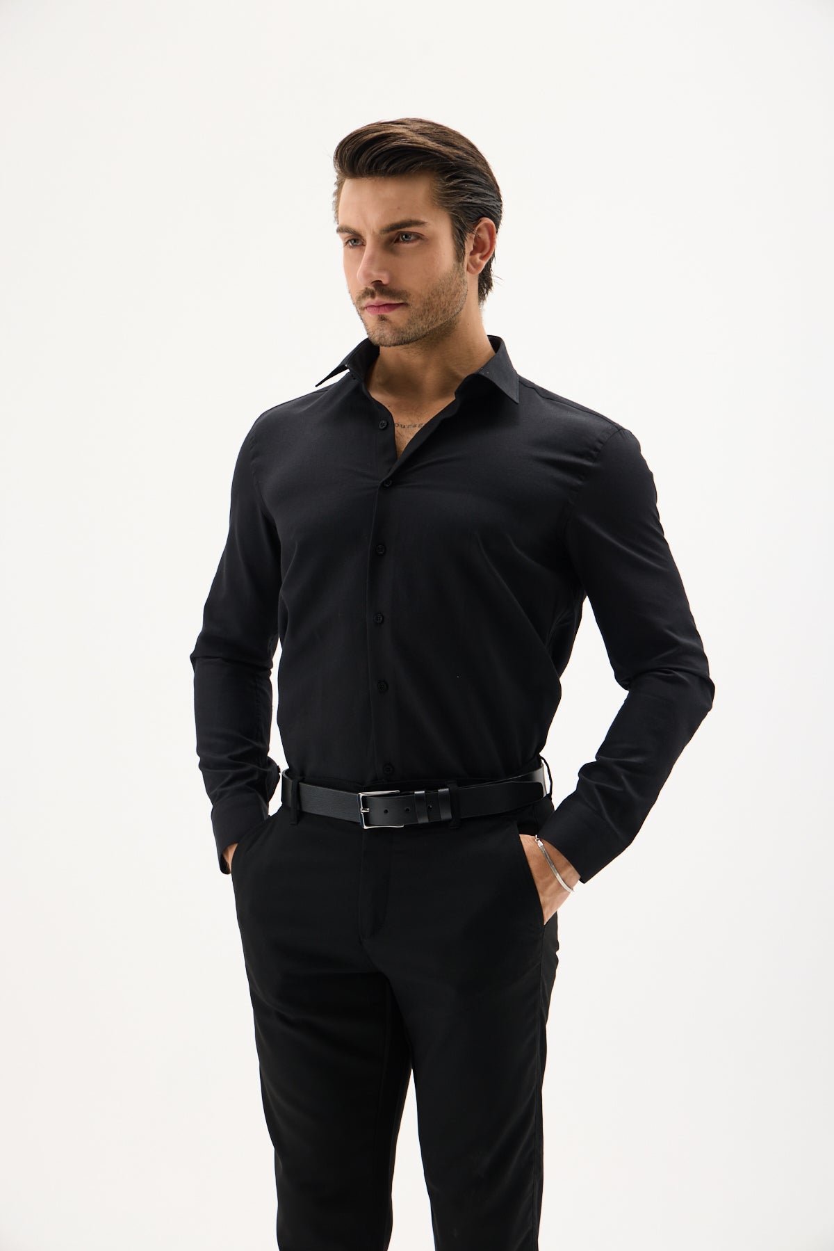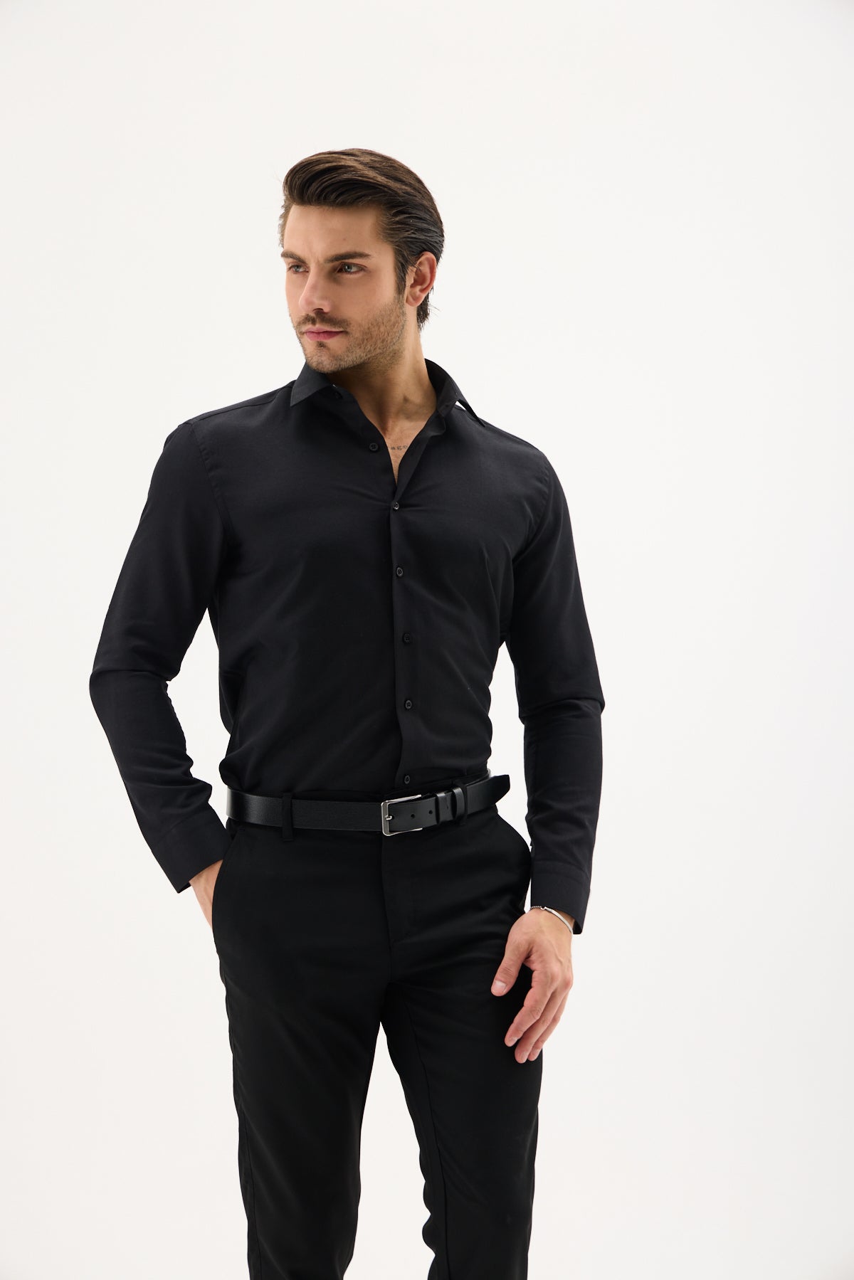 Saten Likra Slim Fit Siyah Erkek Gömlek