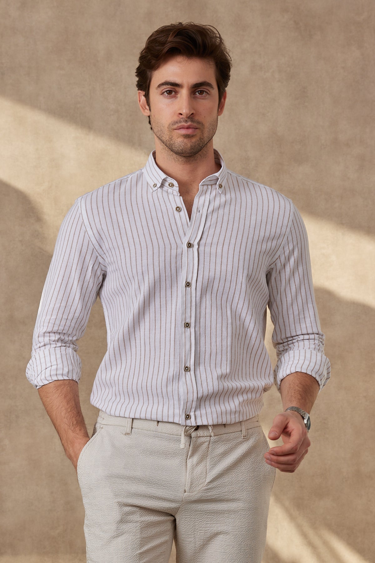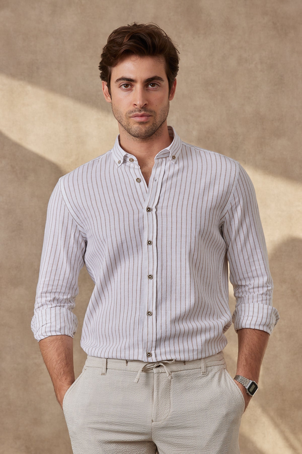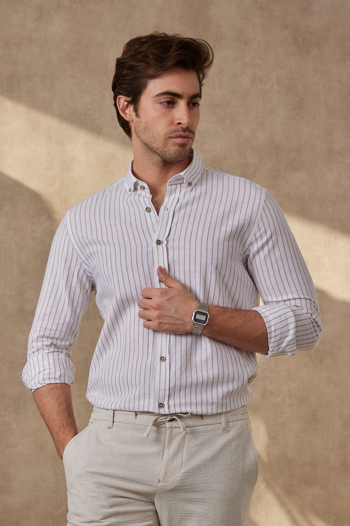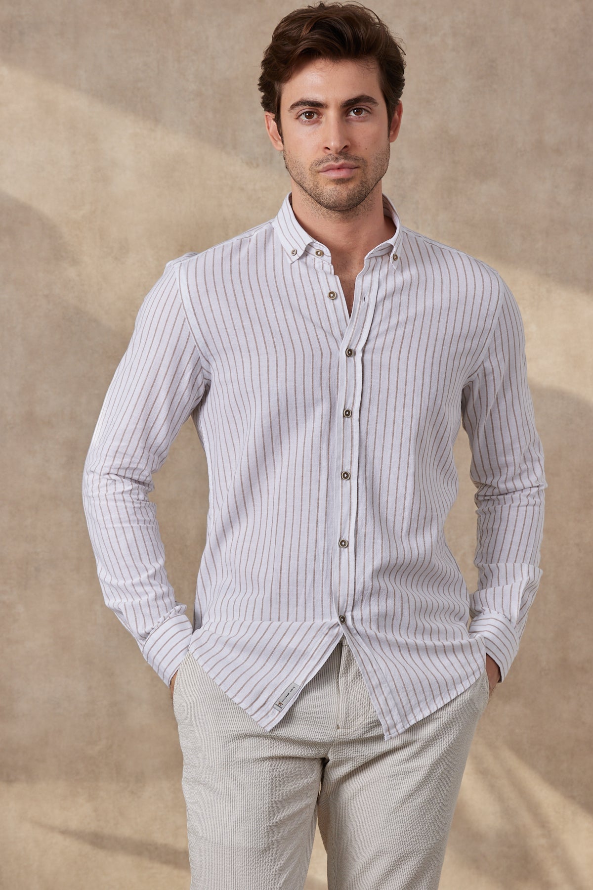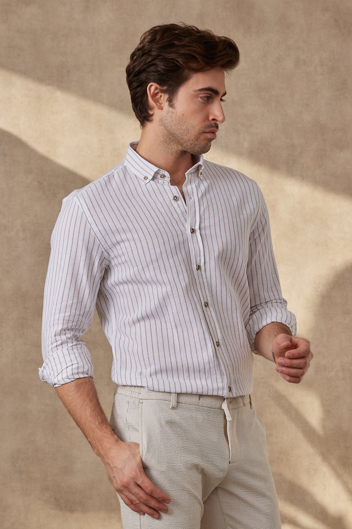 %100 Pamuk Keten Görünümlü Slim Fit Krem Çizgili Erkek Gömlek