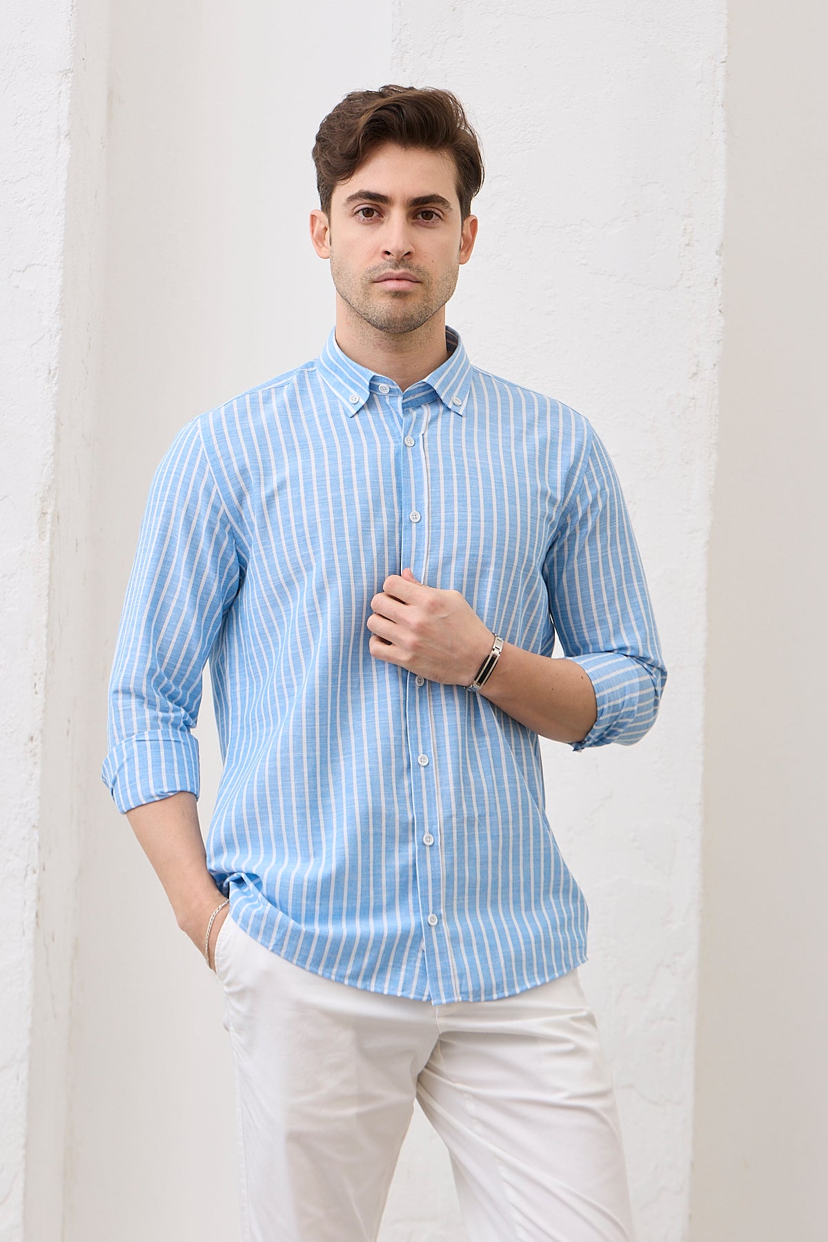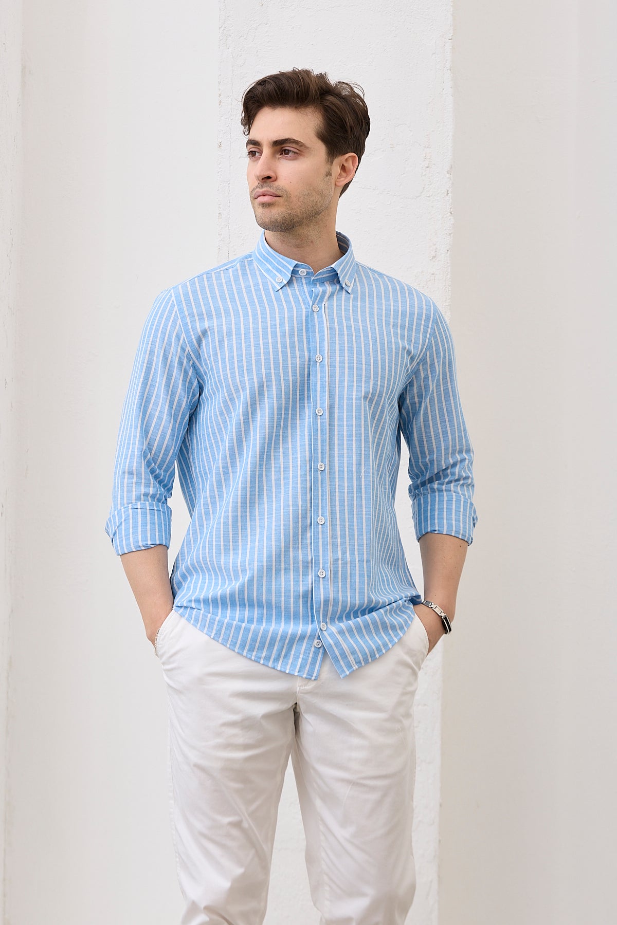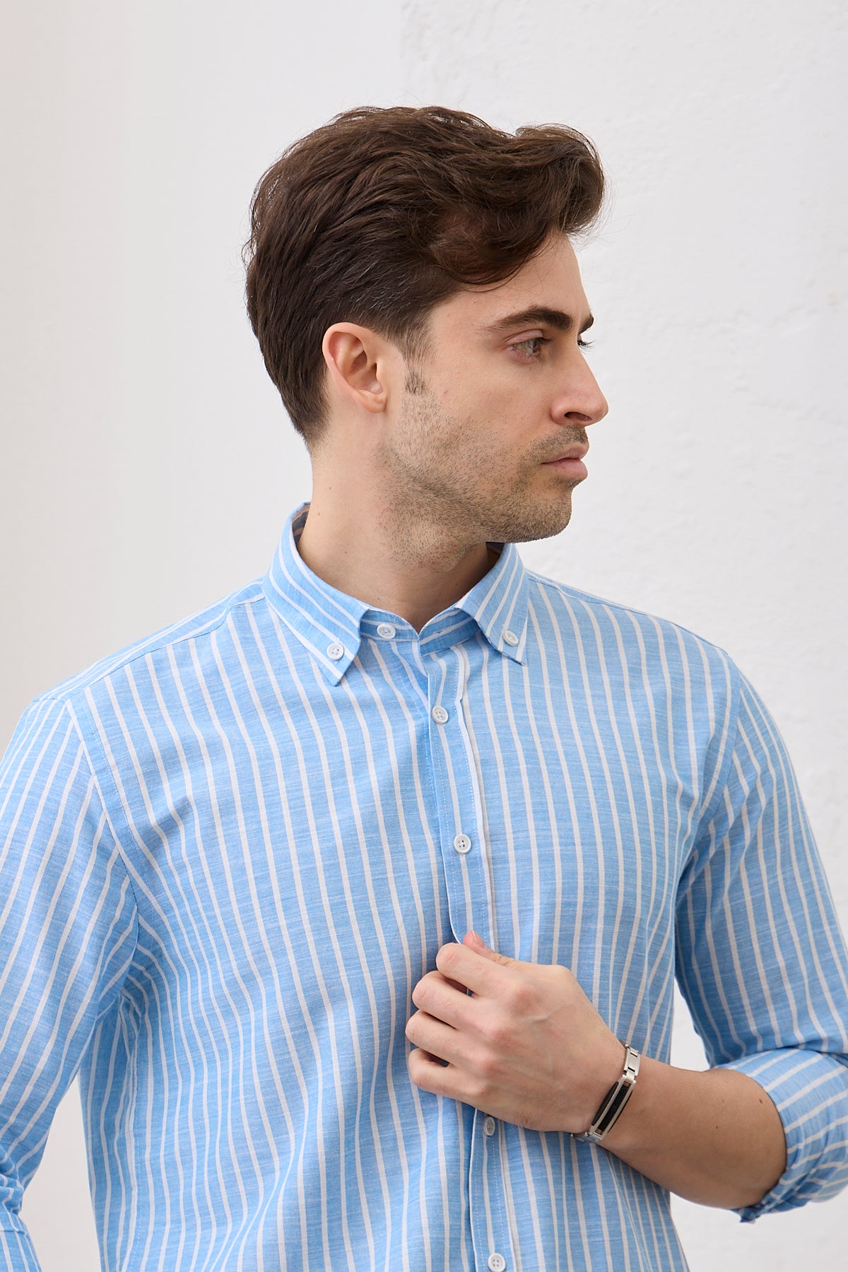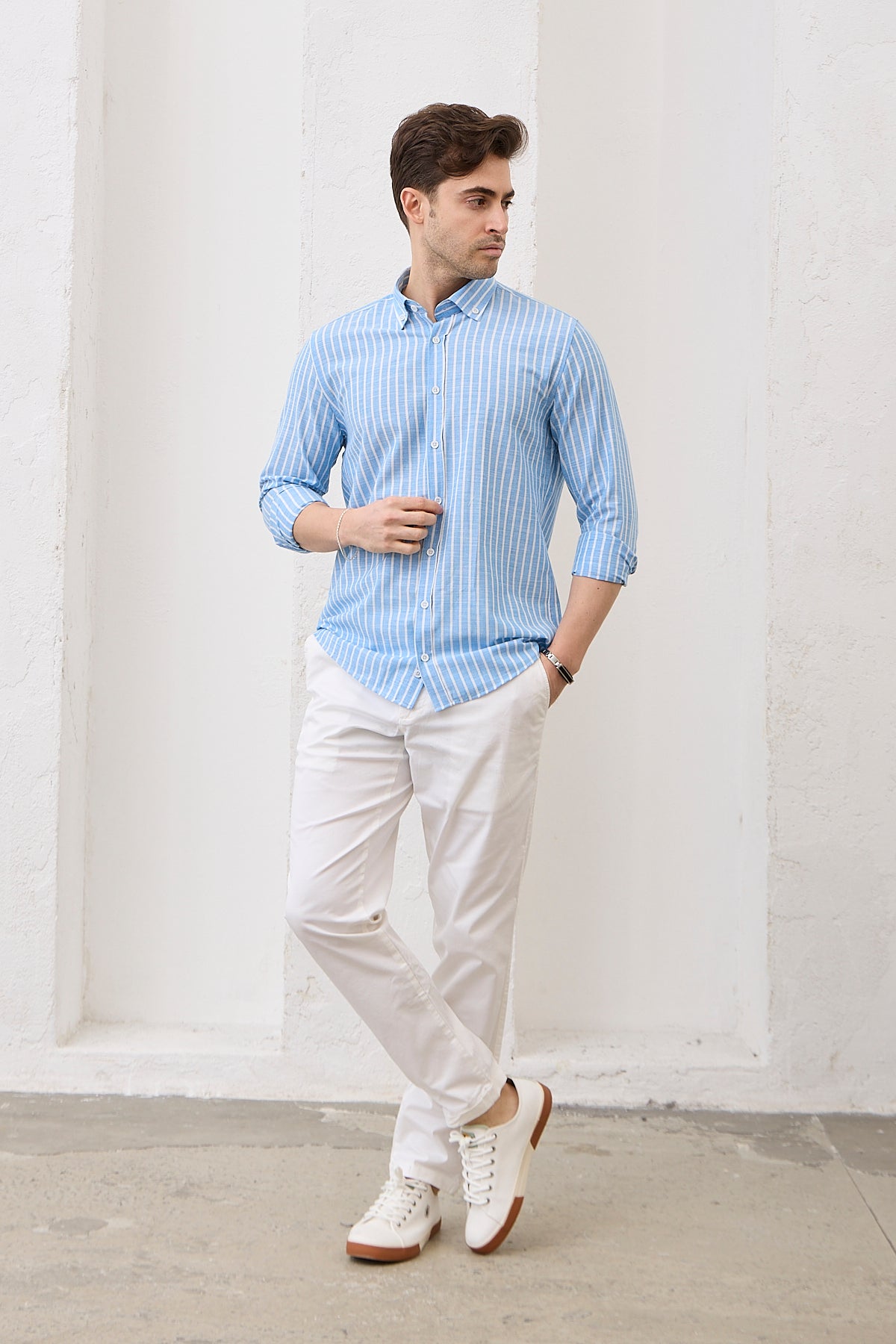 %100 Pamuk Keten Görünümlü Slim Fit Turkuaz İnce Çizgili Erkek Gömlek