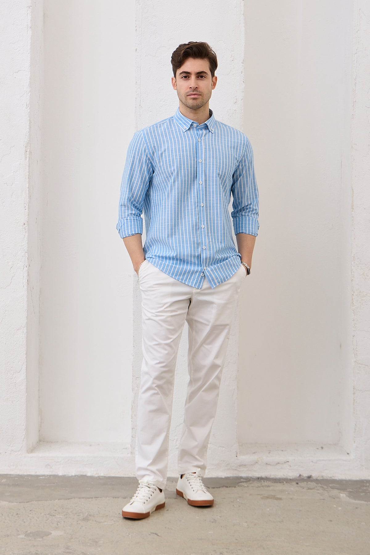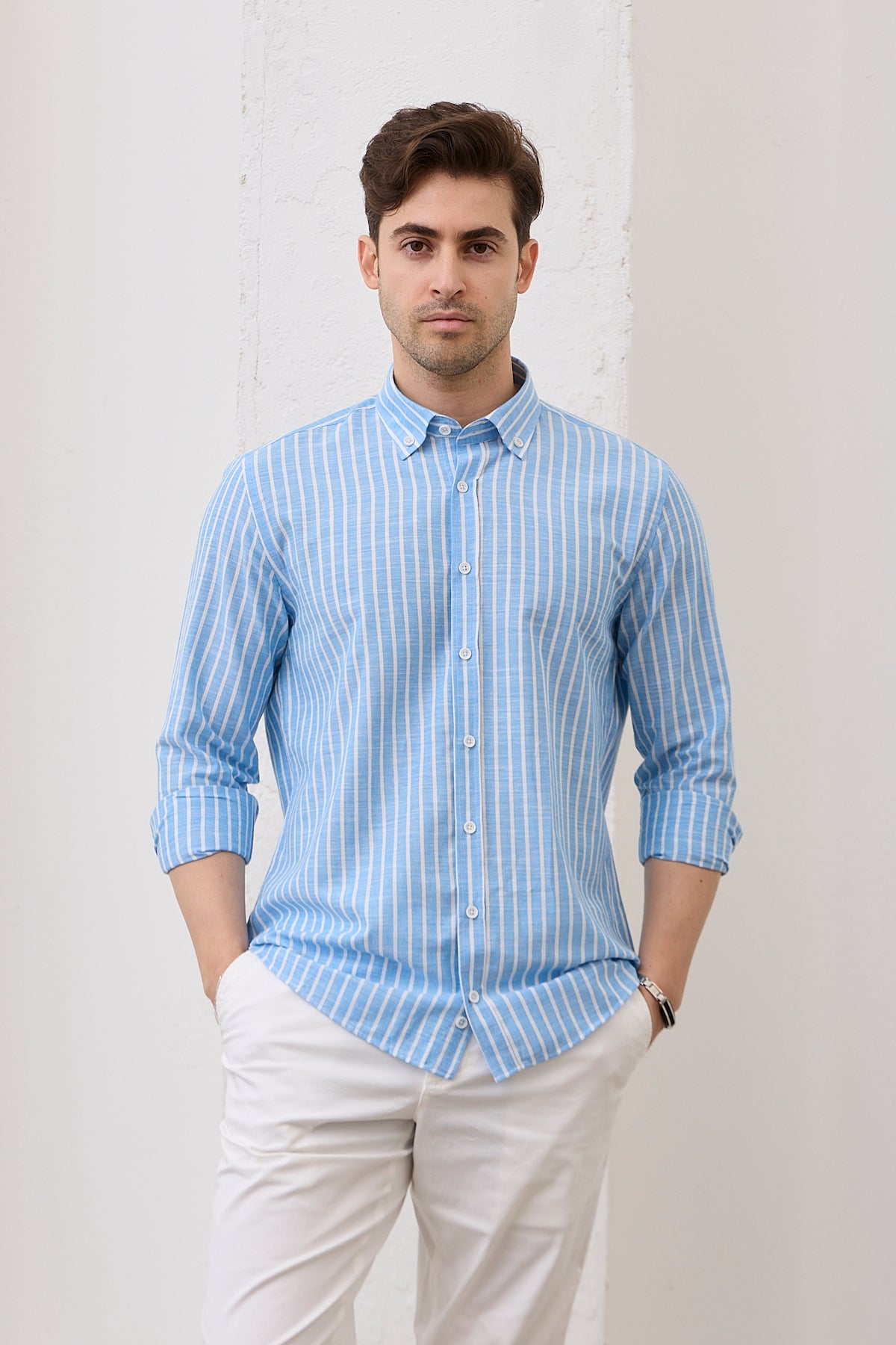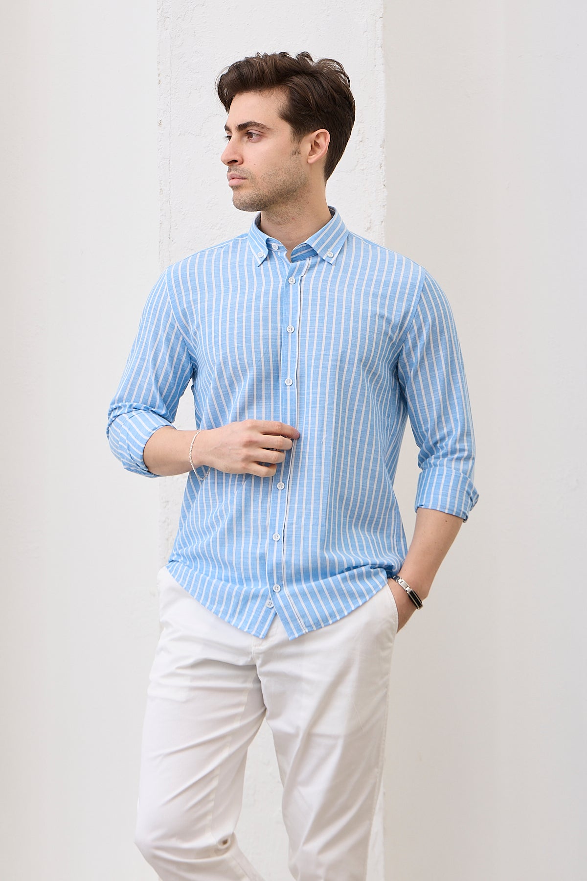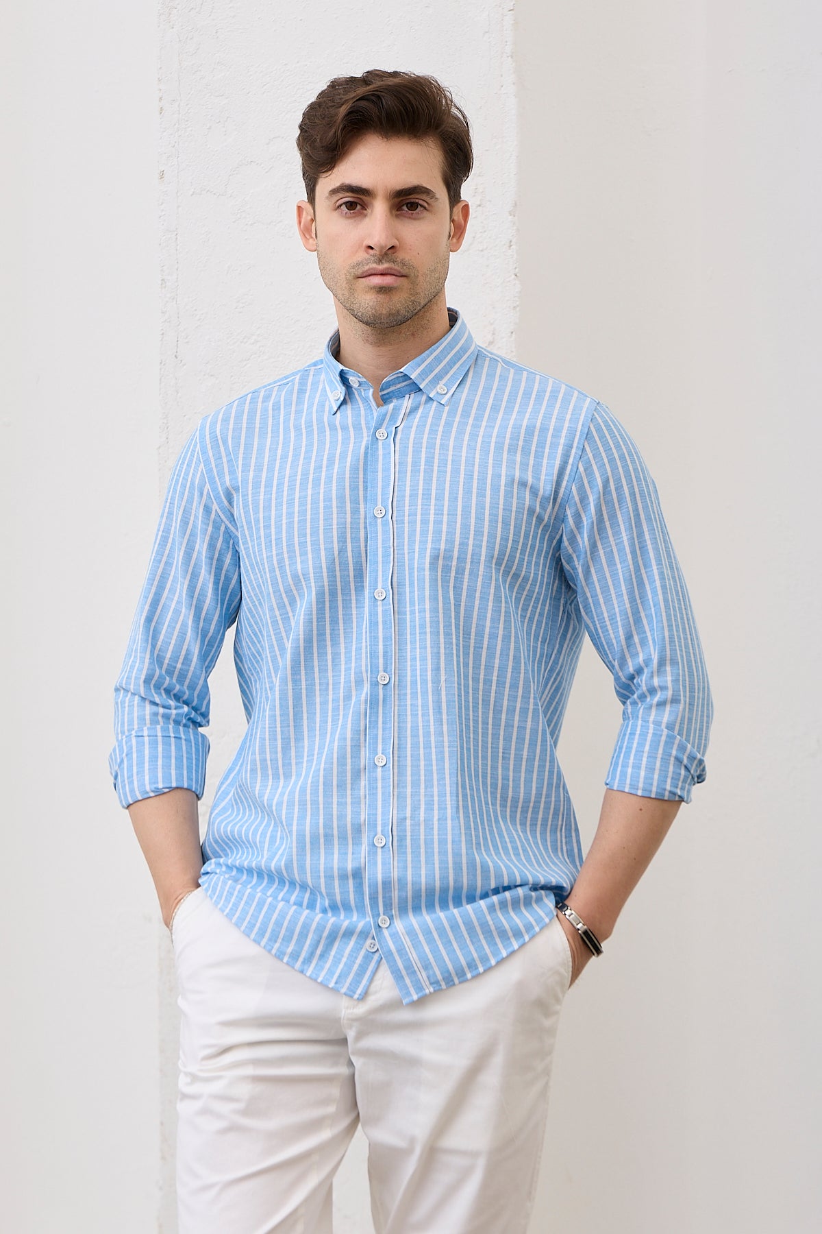 %100 Pamuk Keten Görünümlü Slim Fit Turkuaz İnce Çizgili Erkek Gömlek