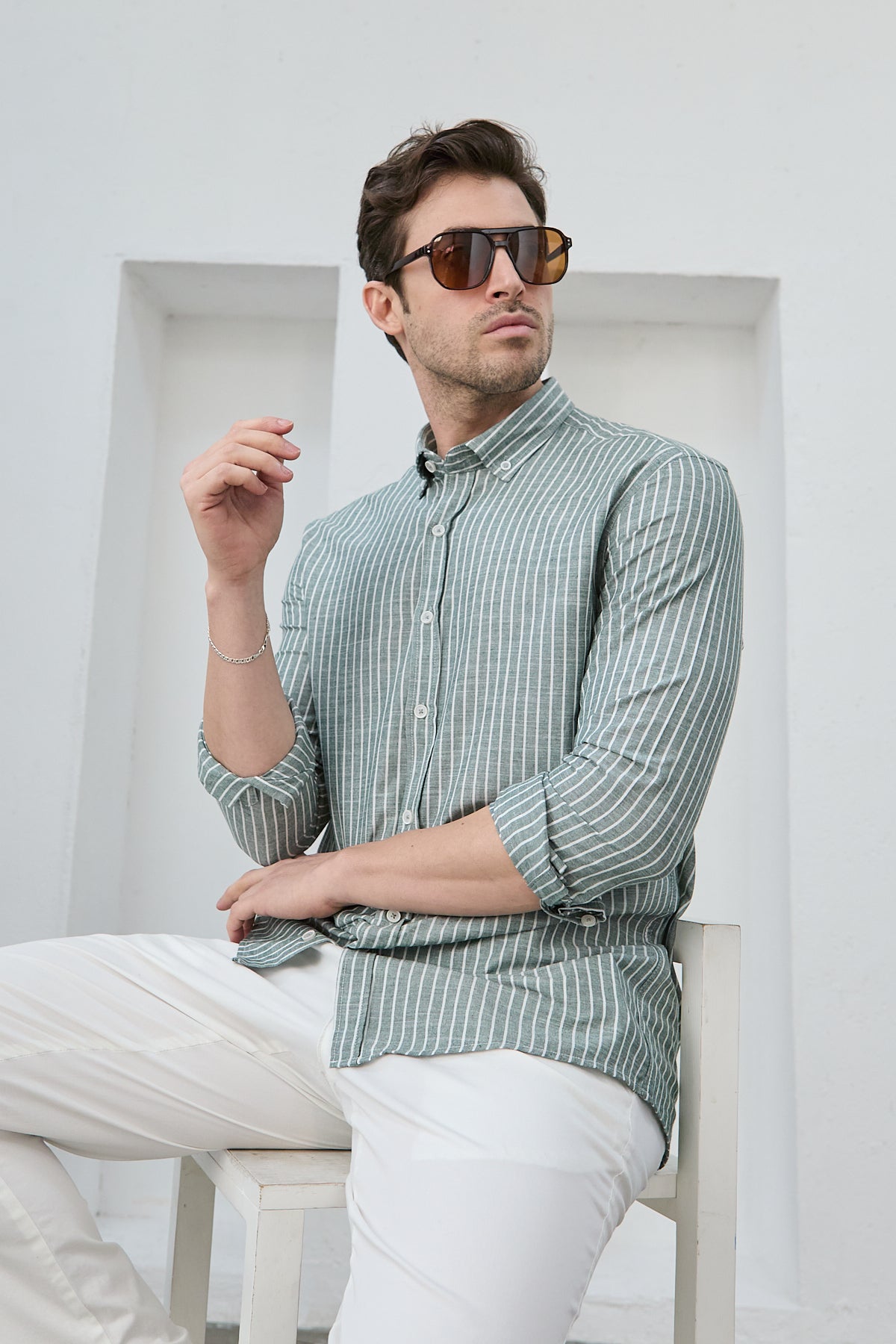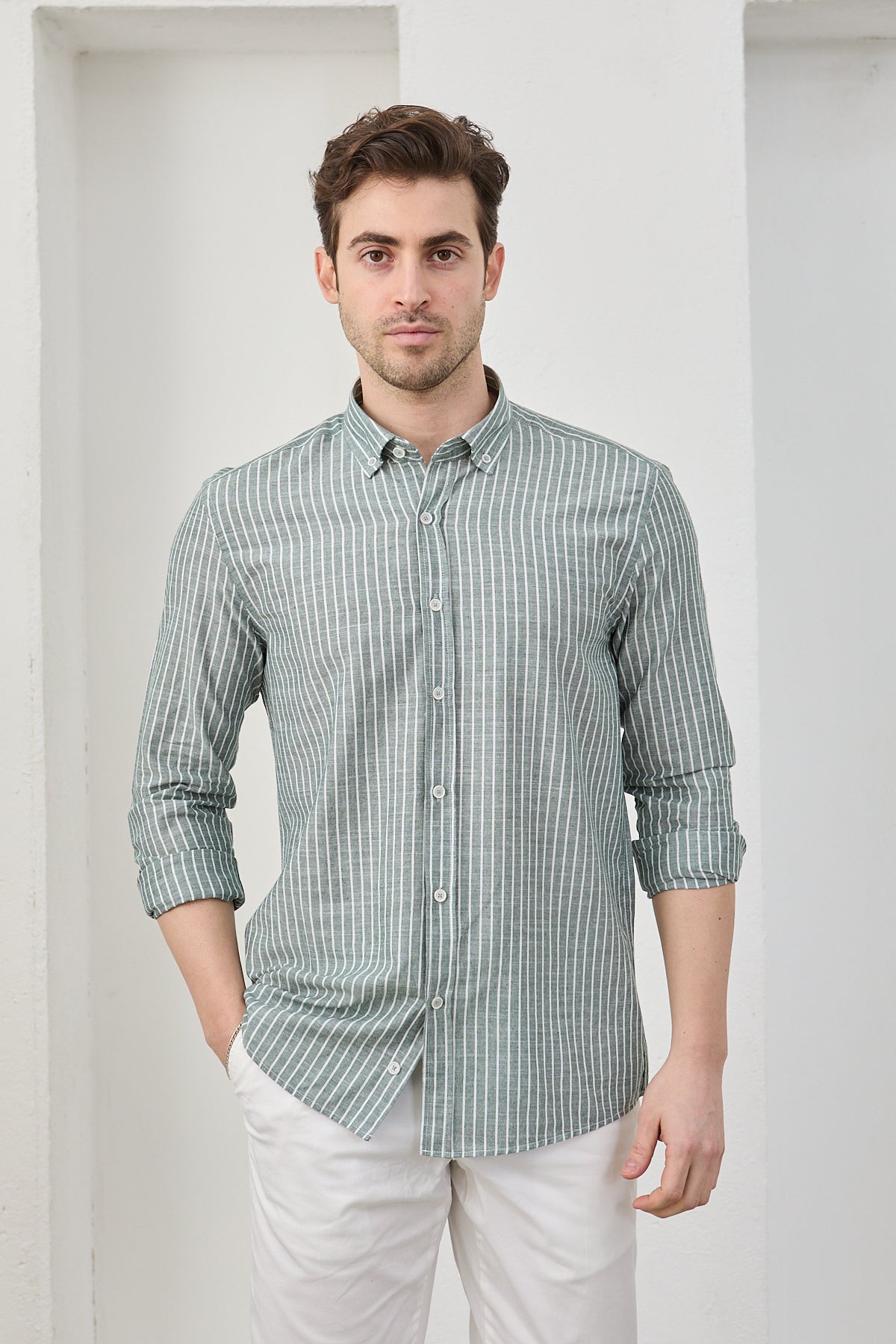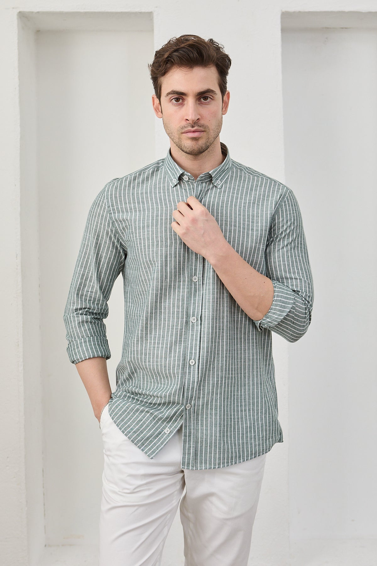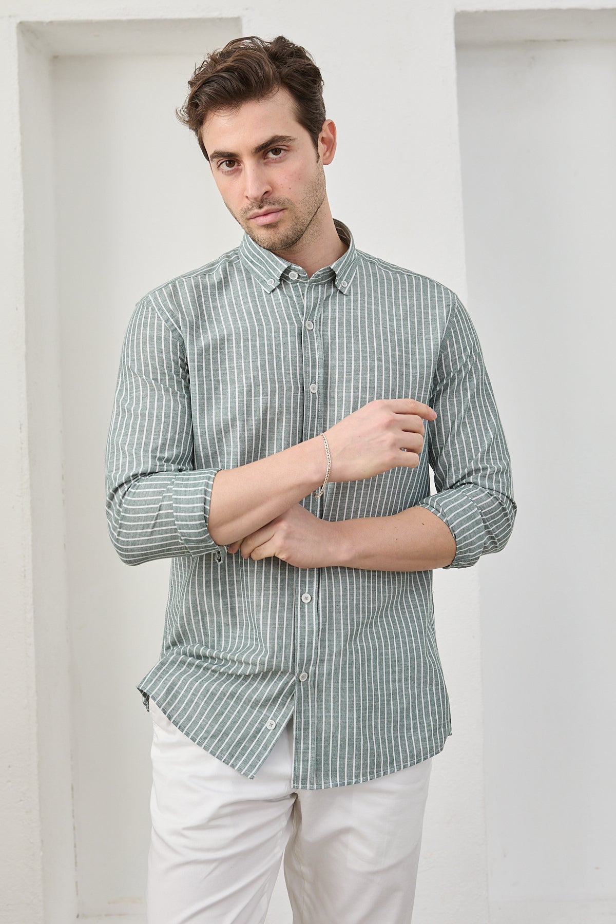 %100 Pamuk Keten Görünümlü Slim Fit Yeşil Beyaz Çizgili Erkek Gömlek