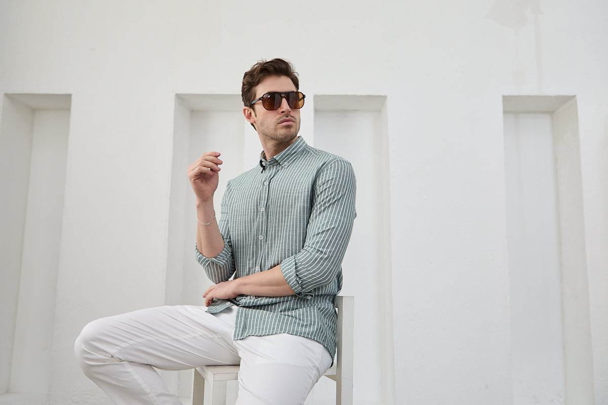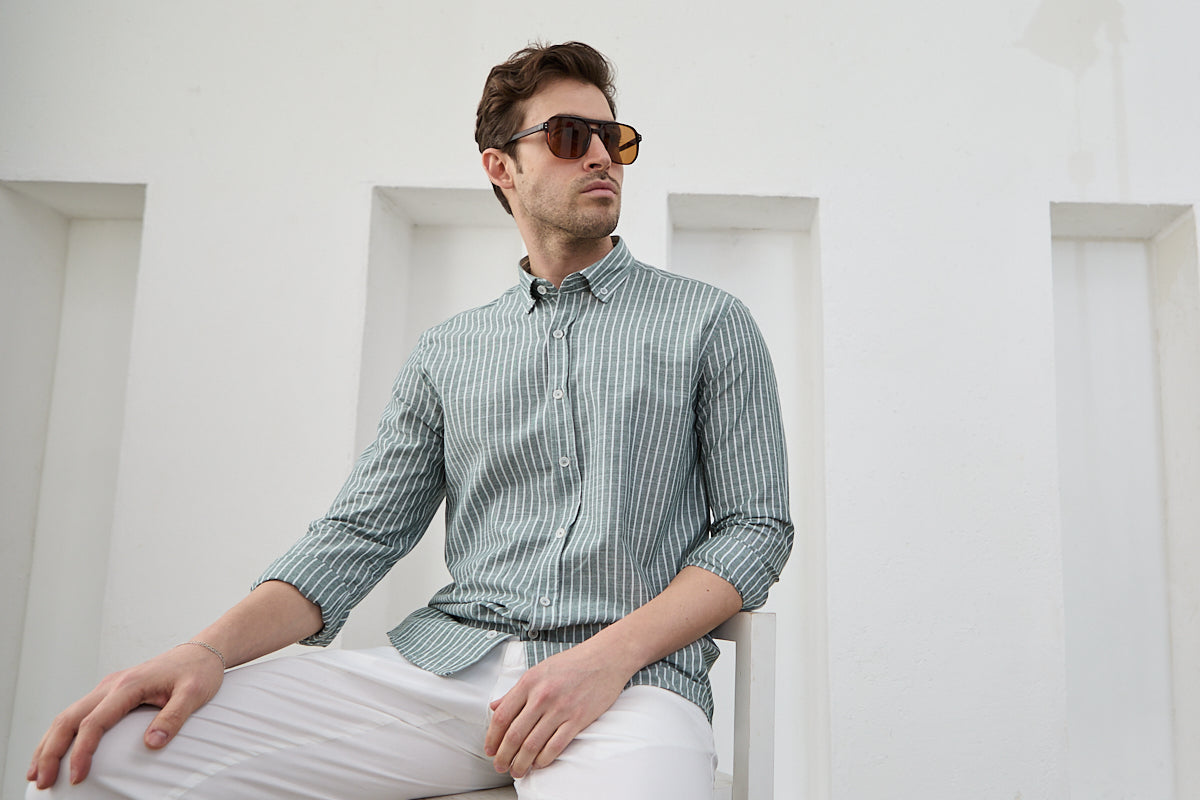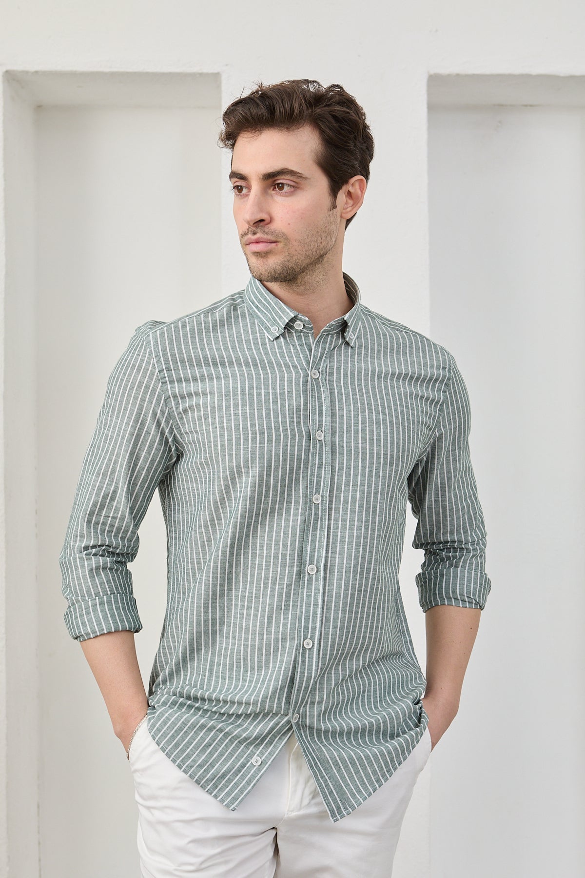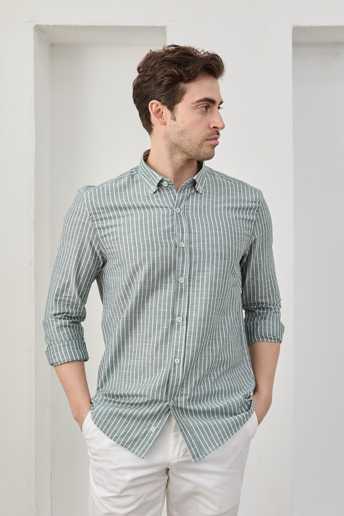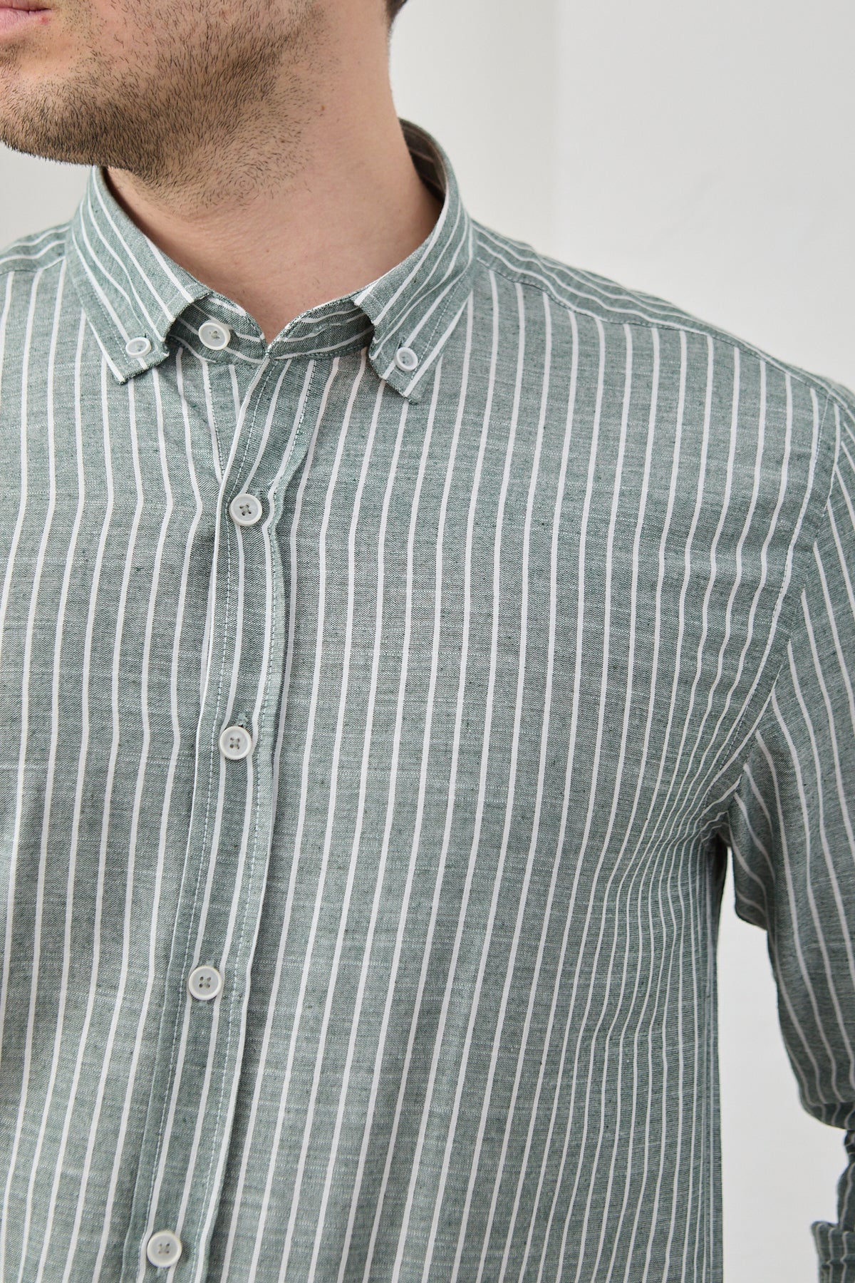 %100 Pamuk Keten Görünümlü Slim Fit Yeşil Beyaz Çizgili Erkek Gömlek