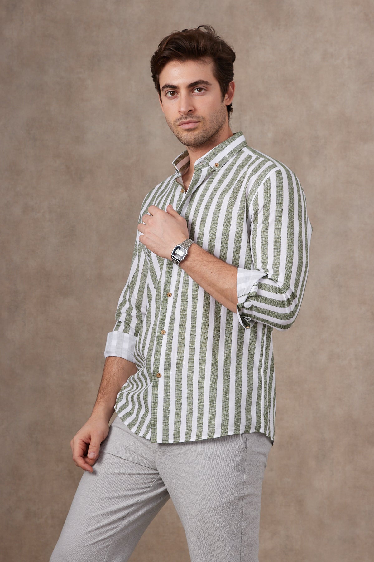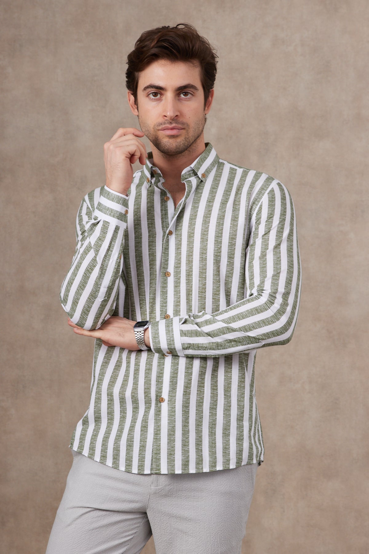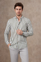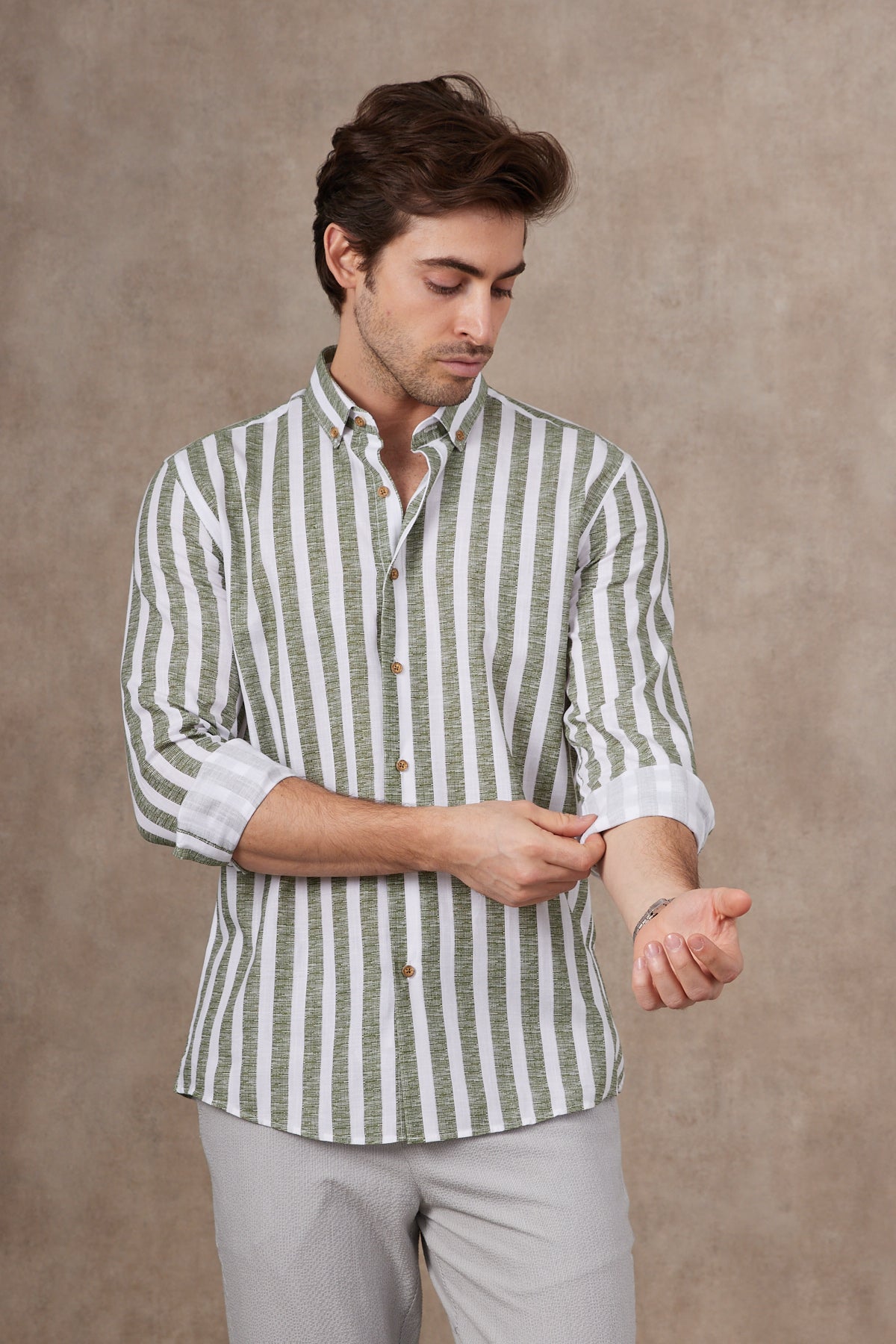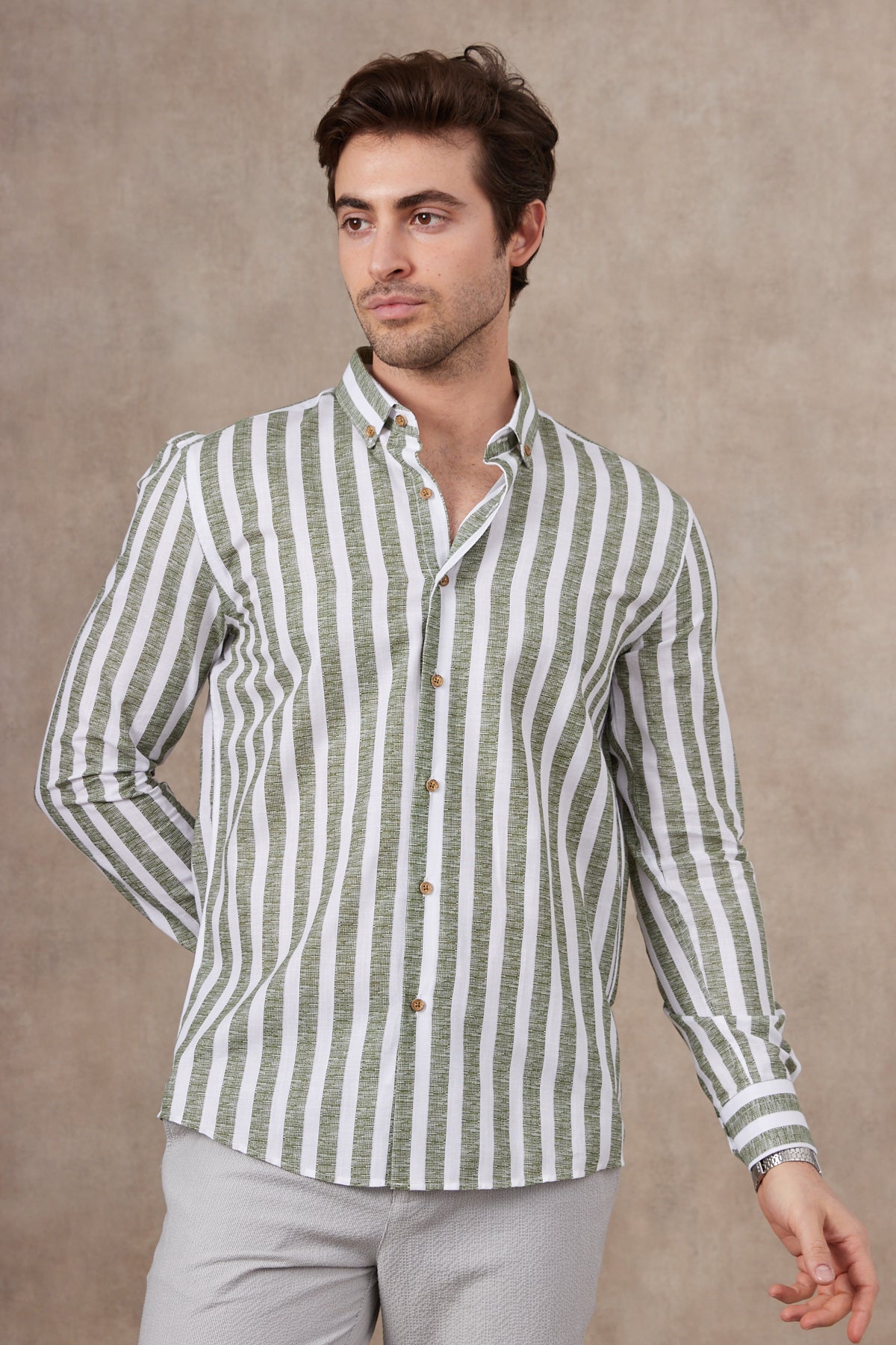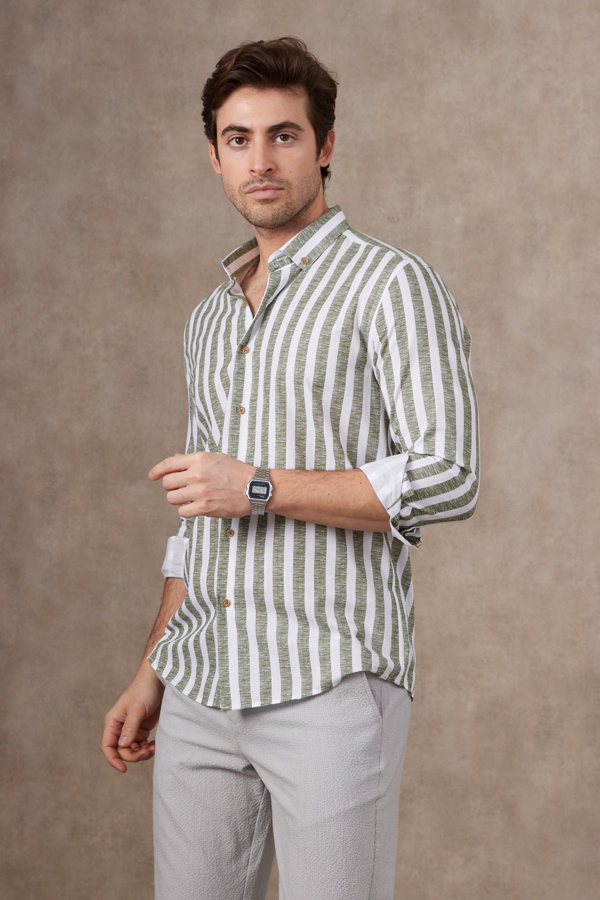 %100 Pamuk Keten Görünümlü Slim Fit Baskılı Haki Erkek Gömlek
