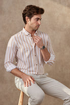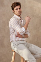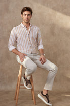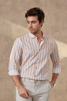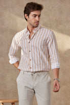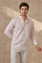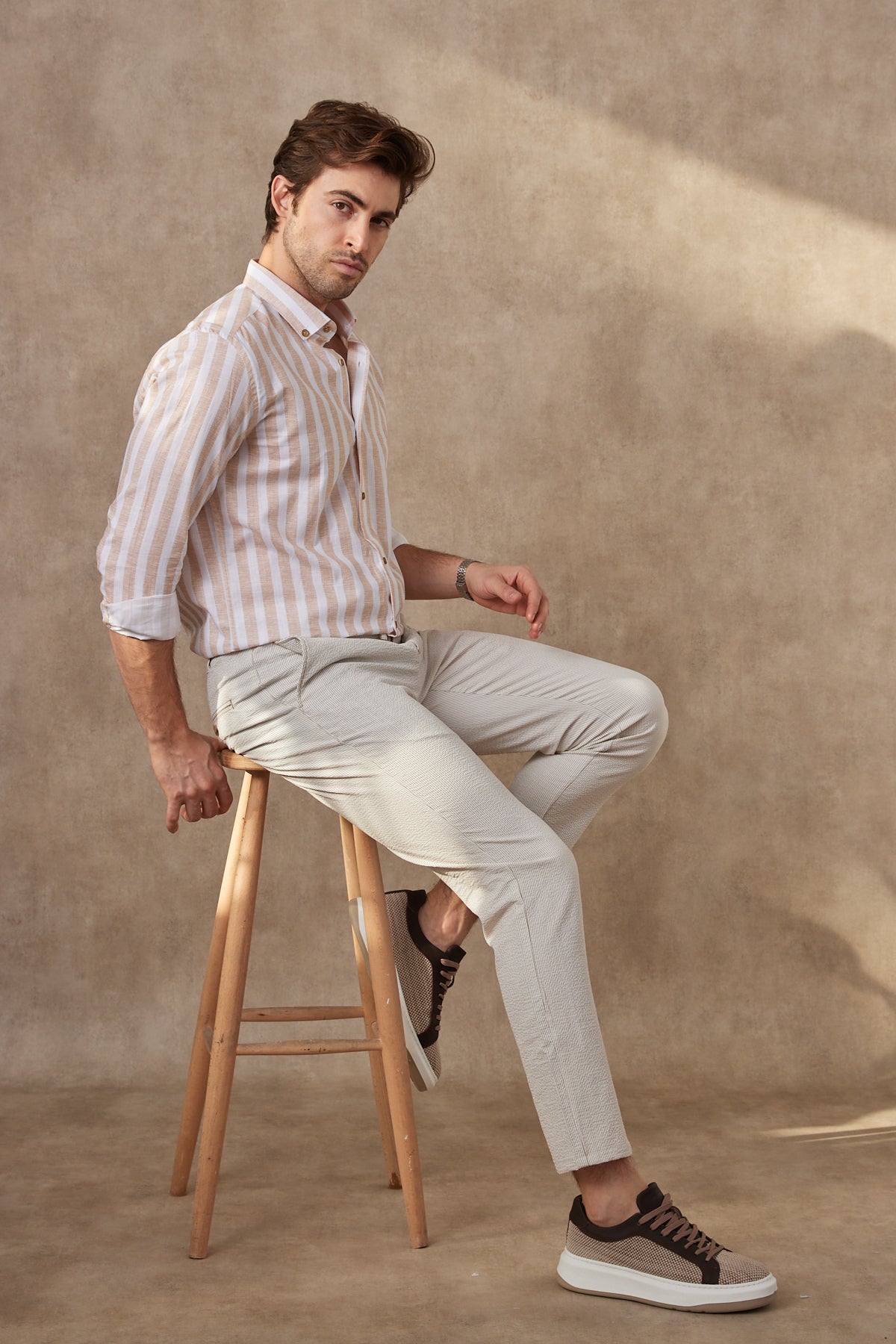 %100 Pamuk Keten Görünümlü Slim Fit Baskılı Bej Erkek Gömlek