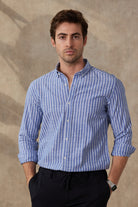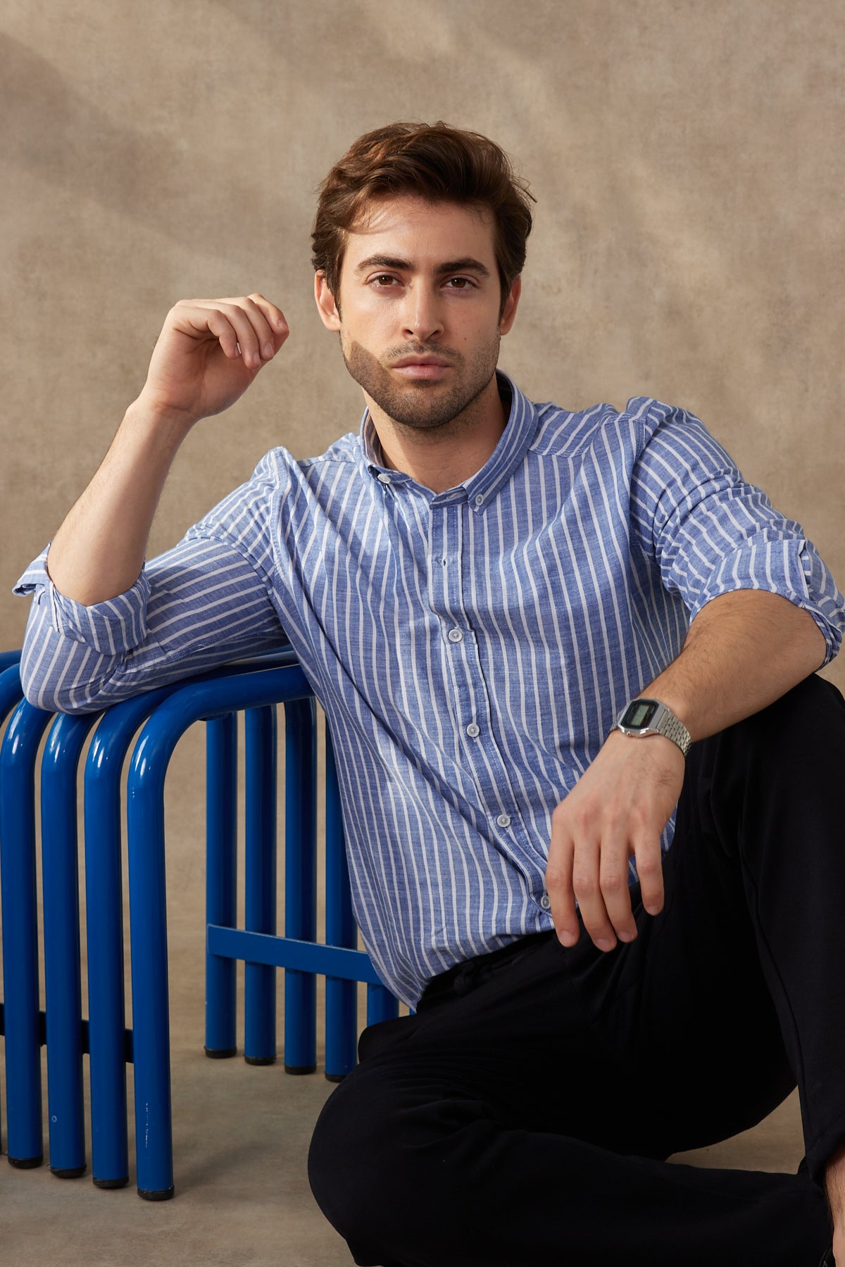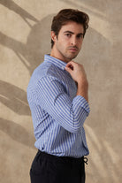 %100 Pamuk Keten Görünümlü Slim Fit Laci İnce Çizgili Erkek Gömlek