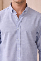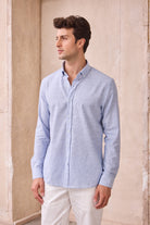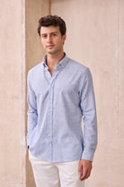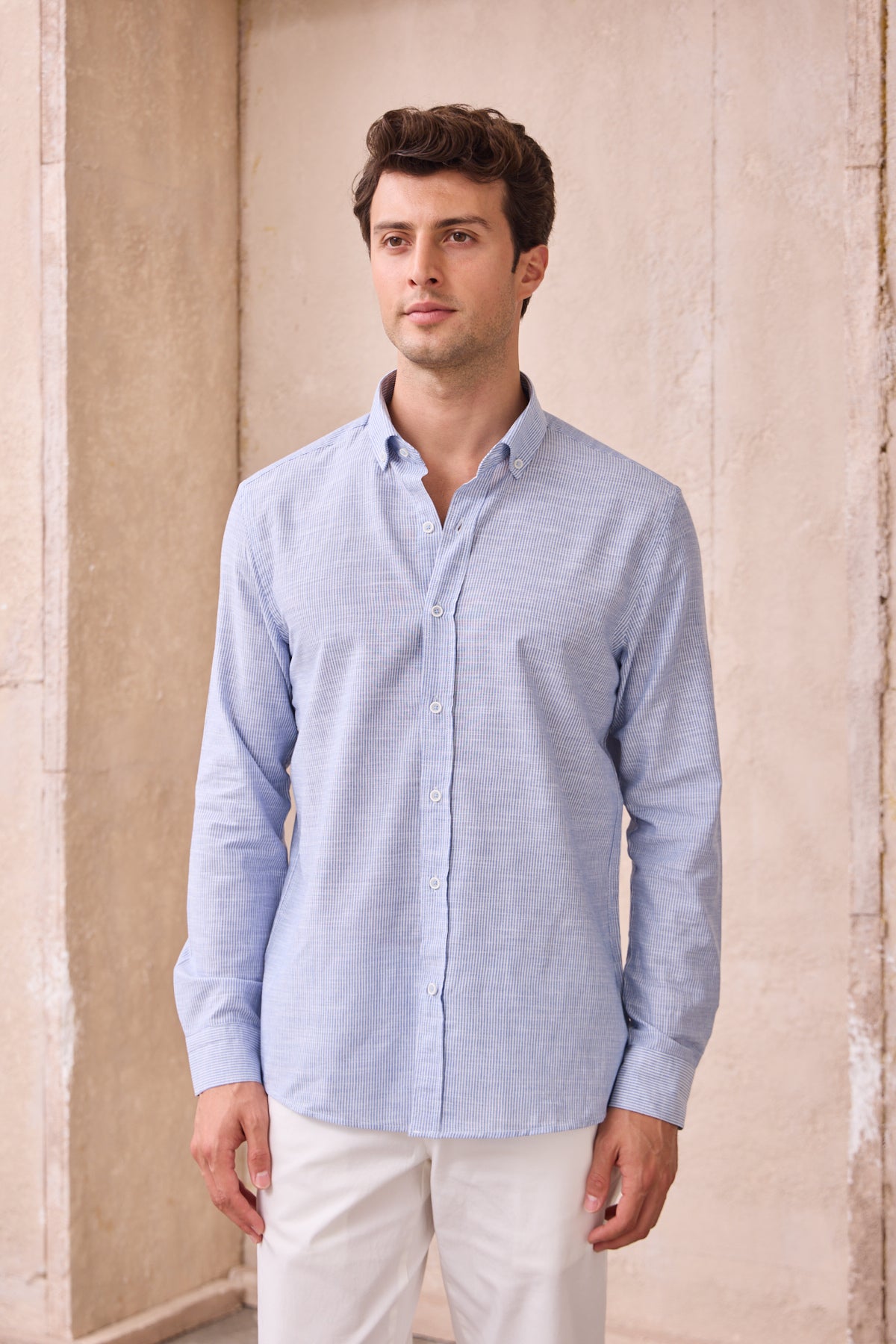 Giza %100 Pamuk Keten Görünümlü Slim Fit Mavi Sık Çizgili Erkek Gömlek