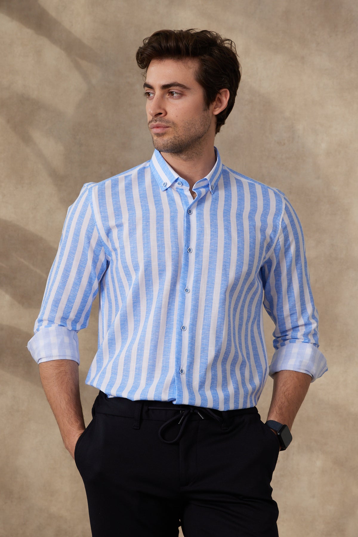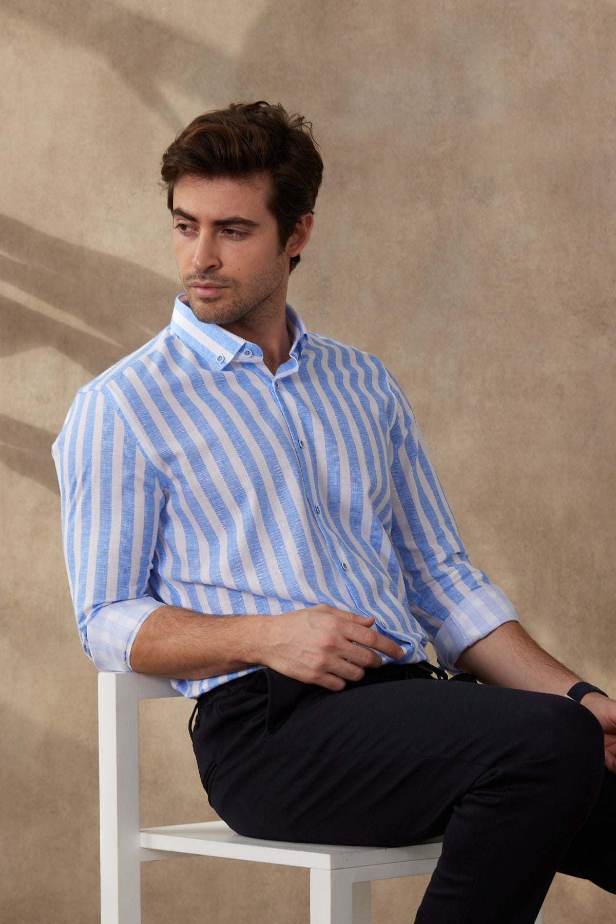 %100 Pamuk Keten Görünümlü Slim Fit Baskılı Mavi Erkek Gömlek