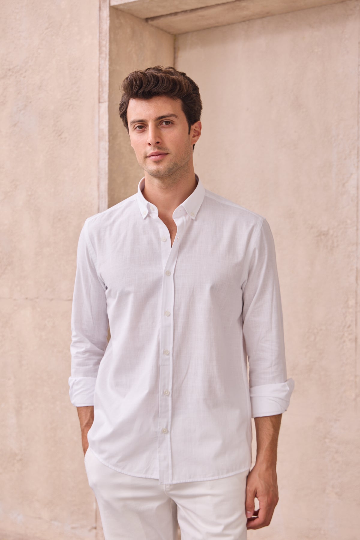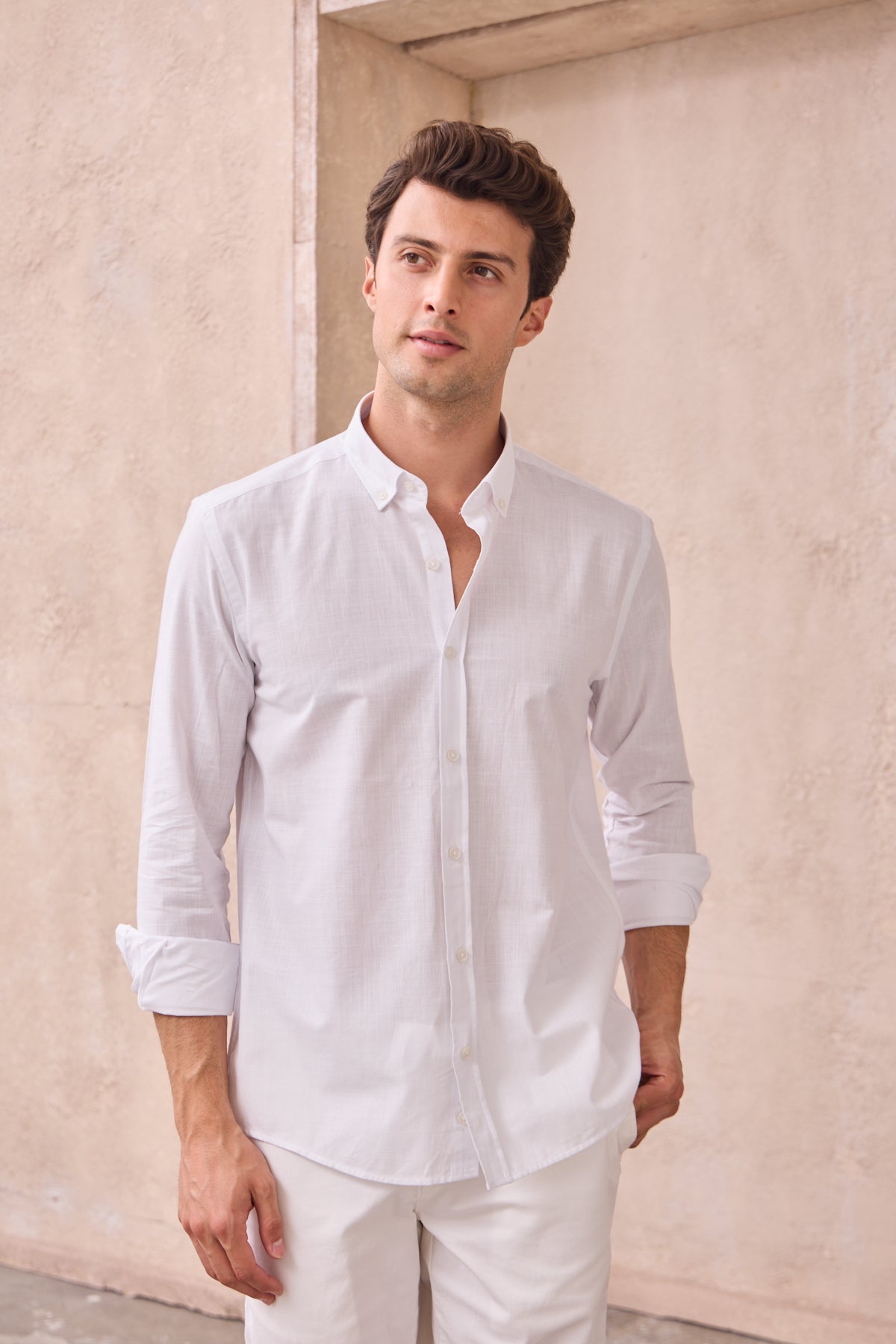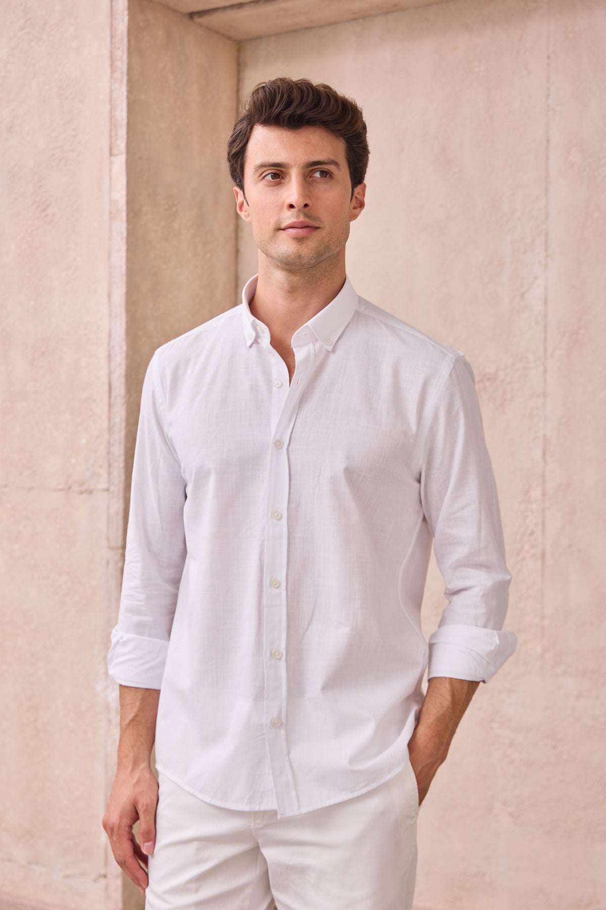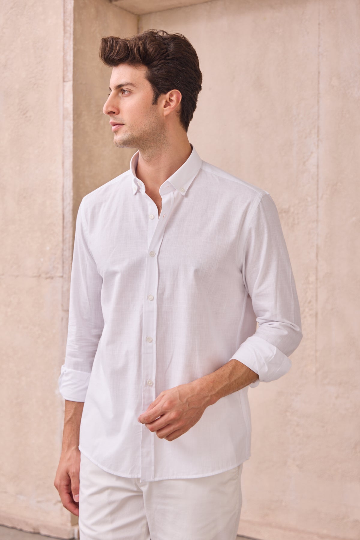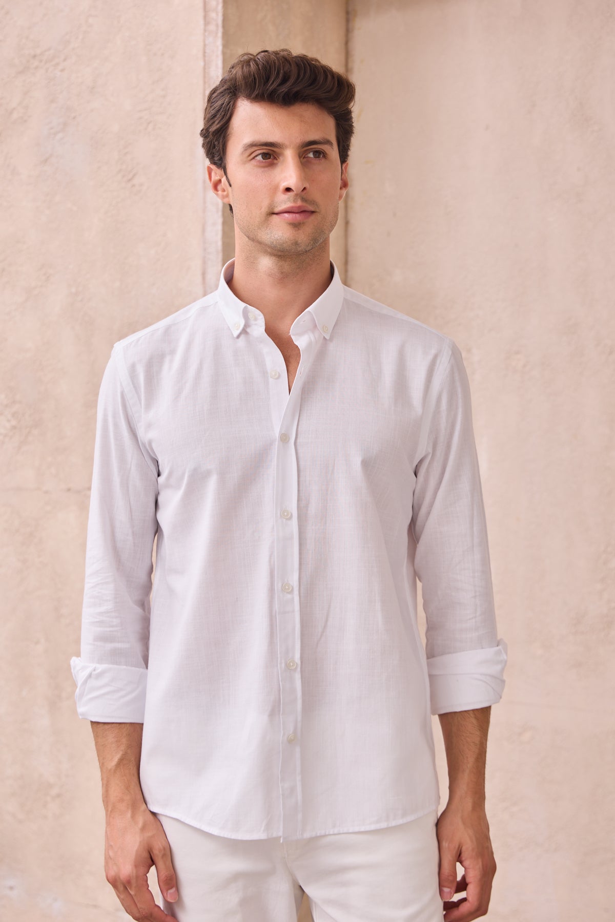%100 Pamuk Keten Görünümlü Slim Fit Flam Beyaz Erkek Gömlek