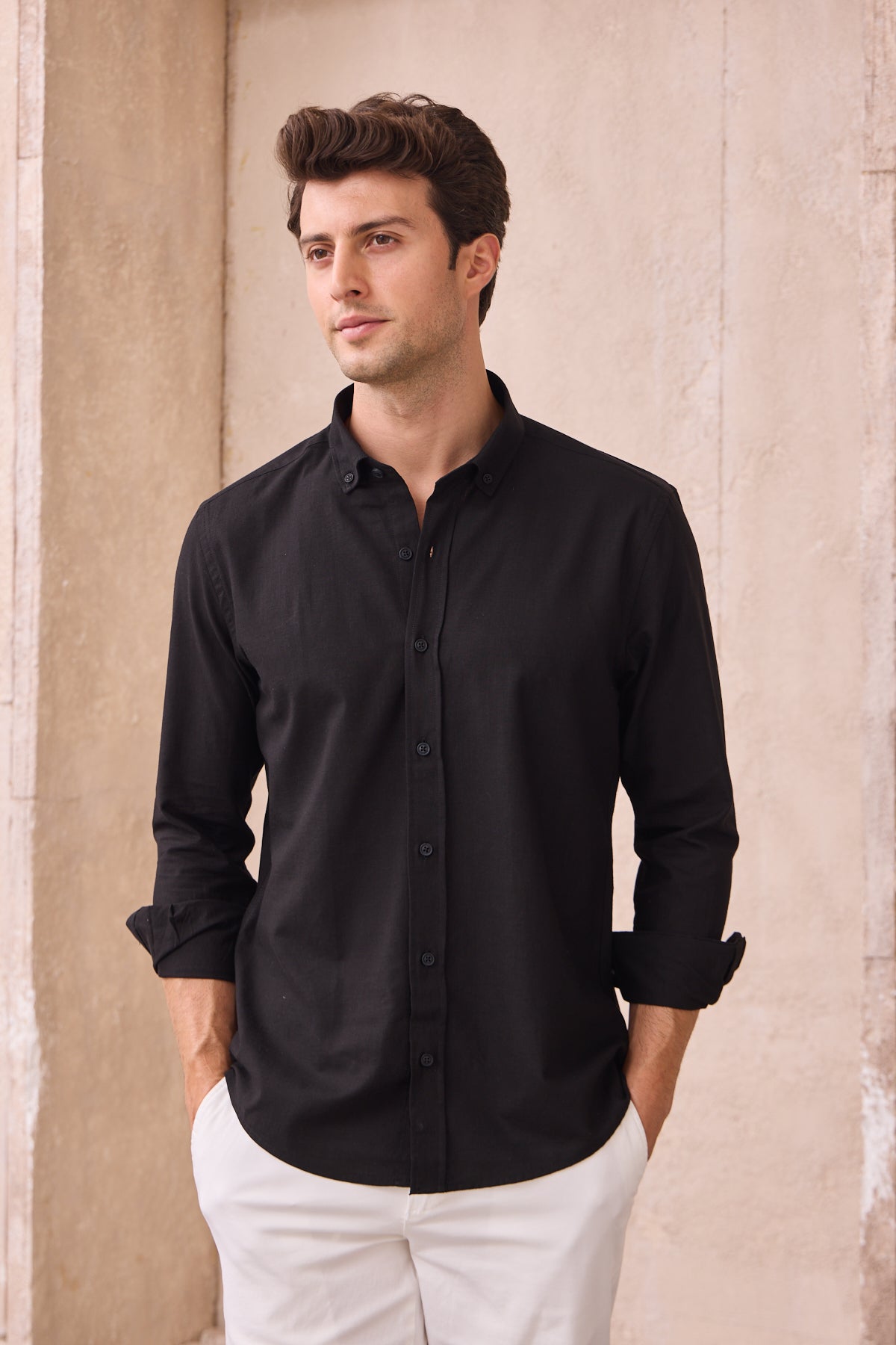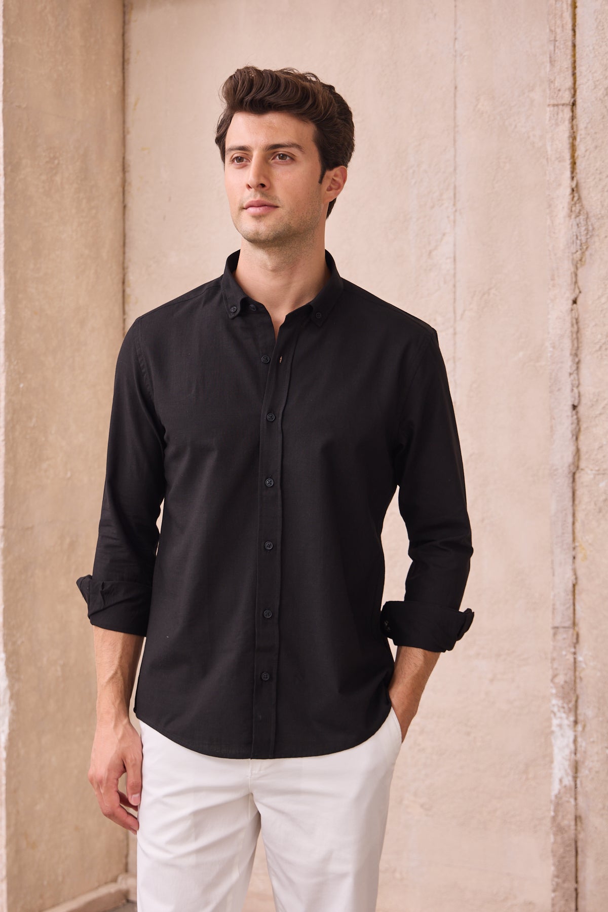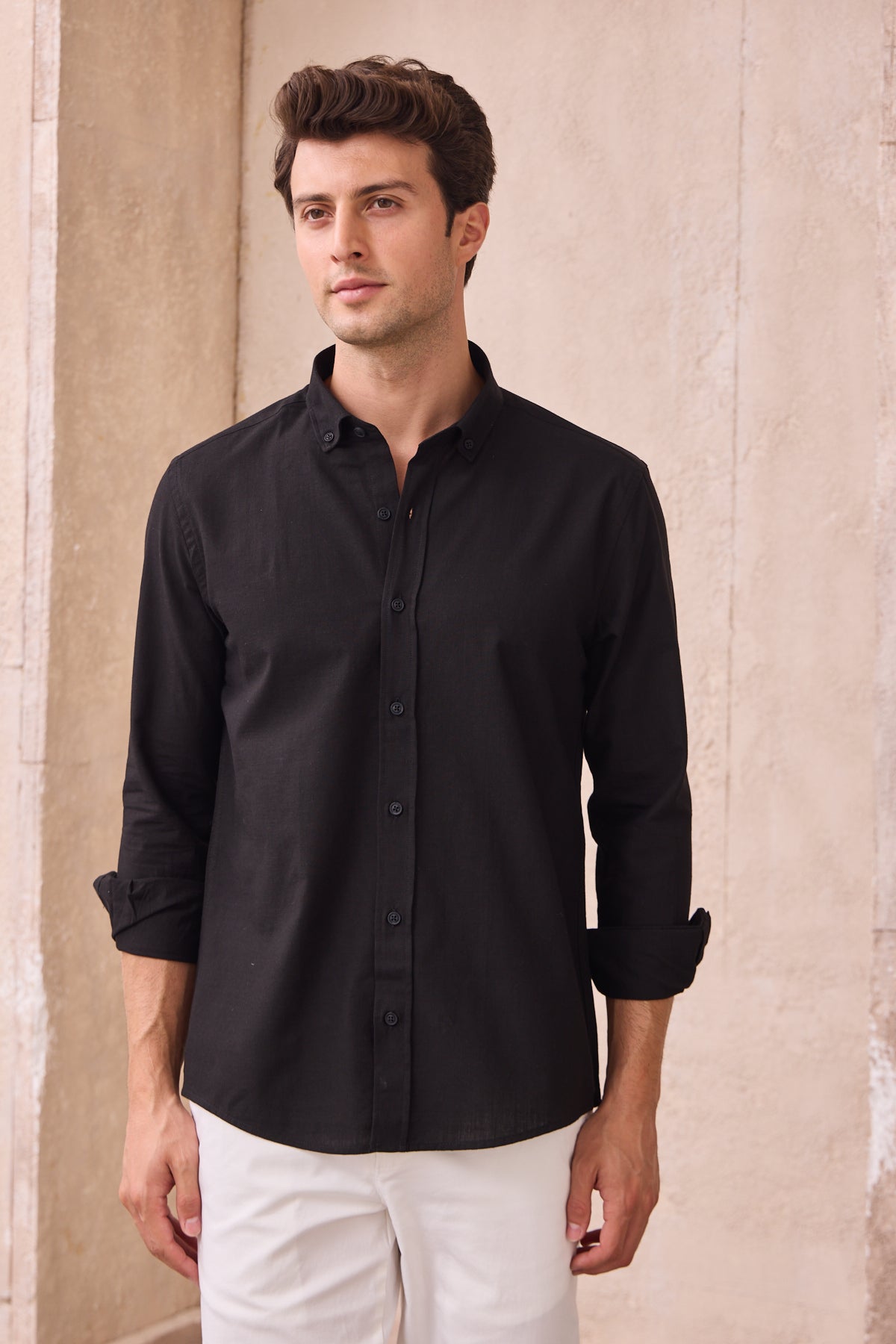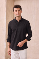 %100 Pamuk Keten Görünümlü Slim Fit Flam Siyah Erkek Gömlek