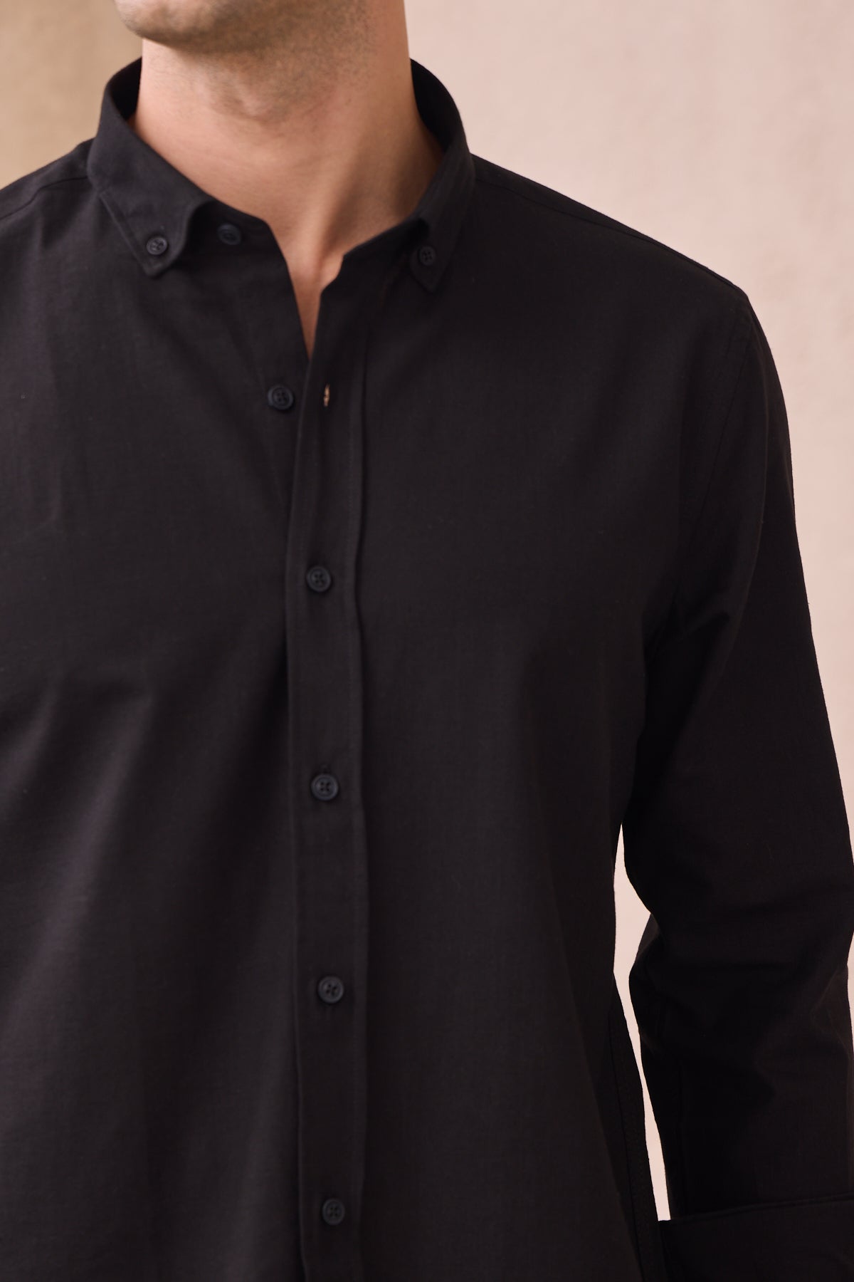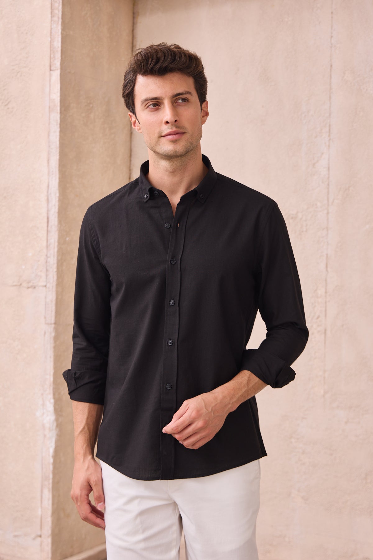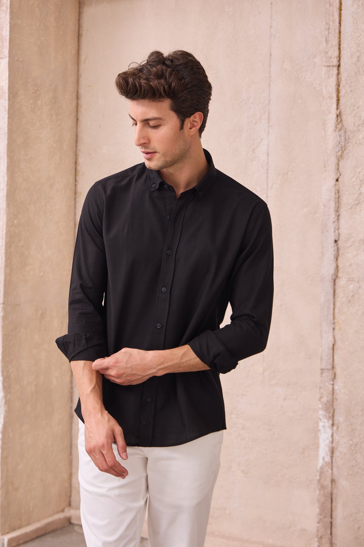 %100 Pamuk Keten Görünümlü Slim Fit Flam Siyah Erkek Gömlek
