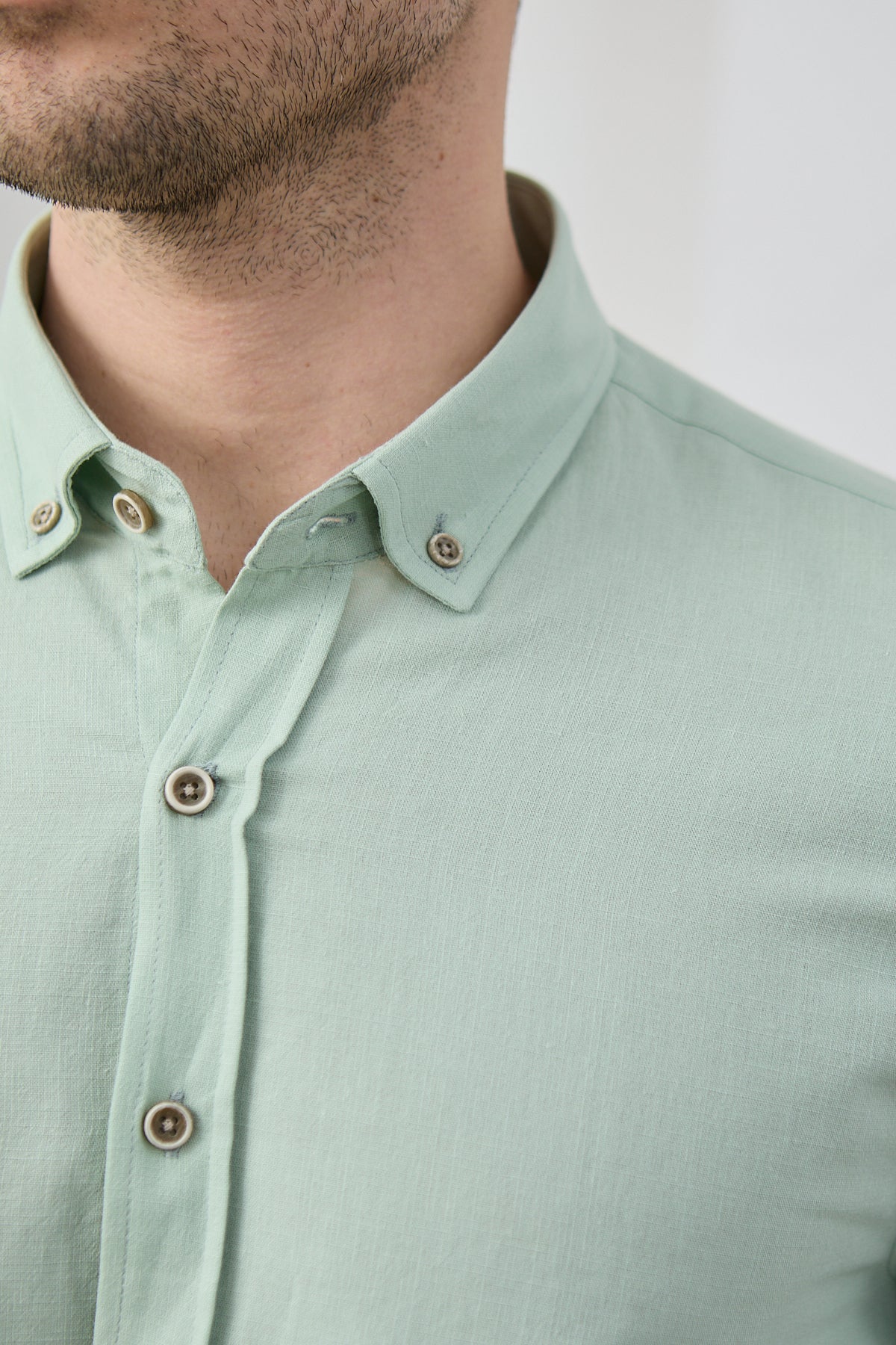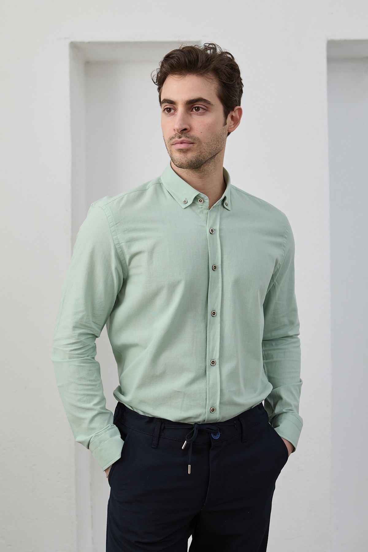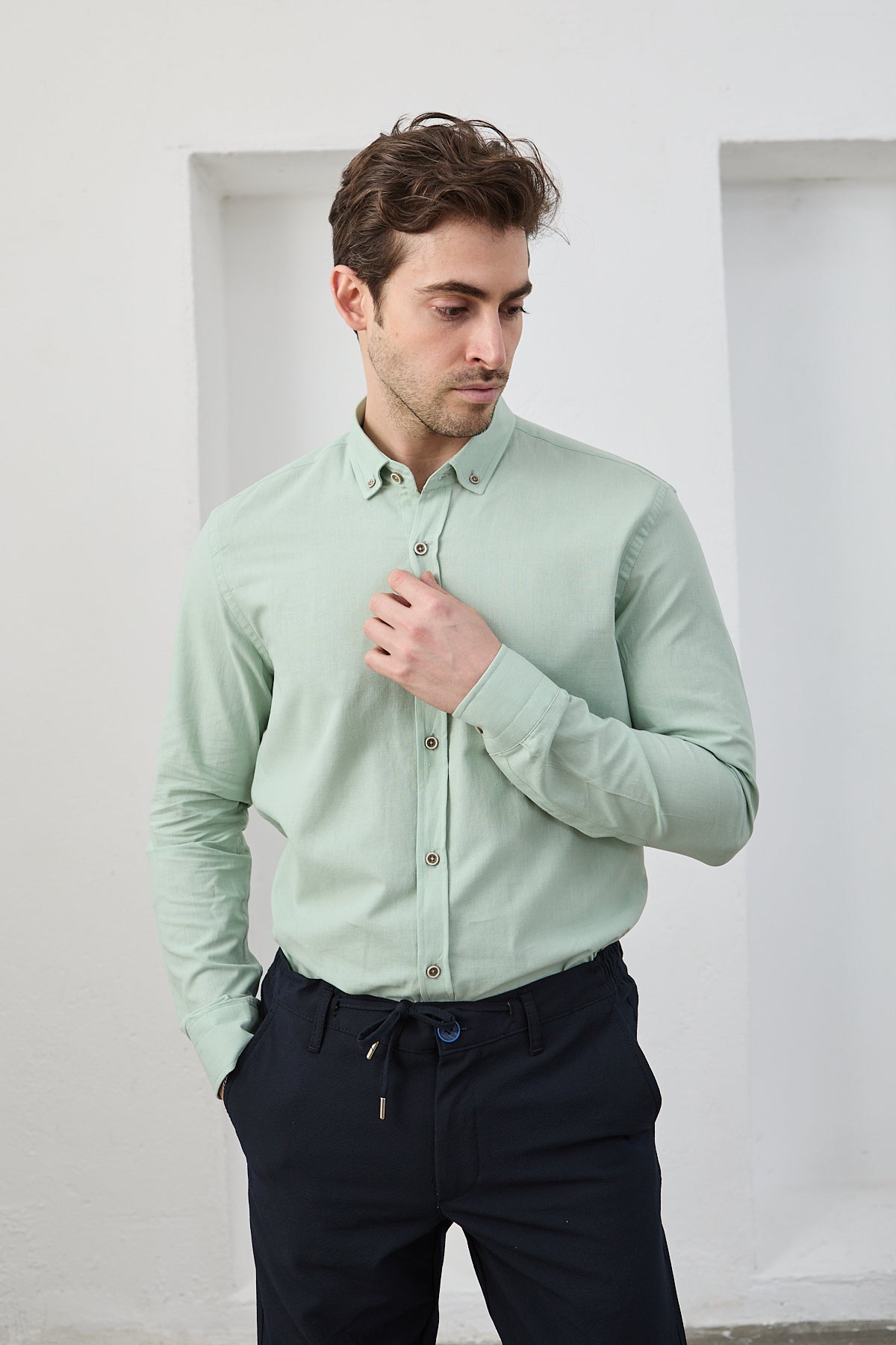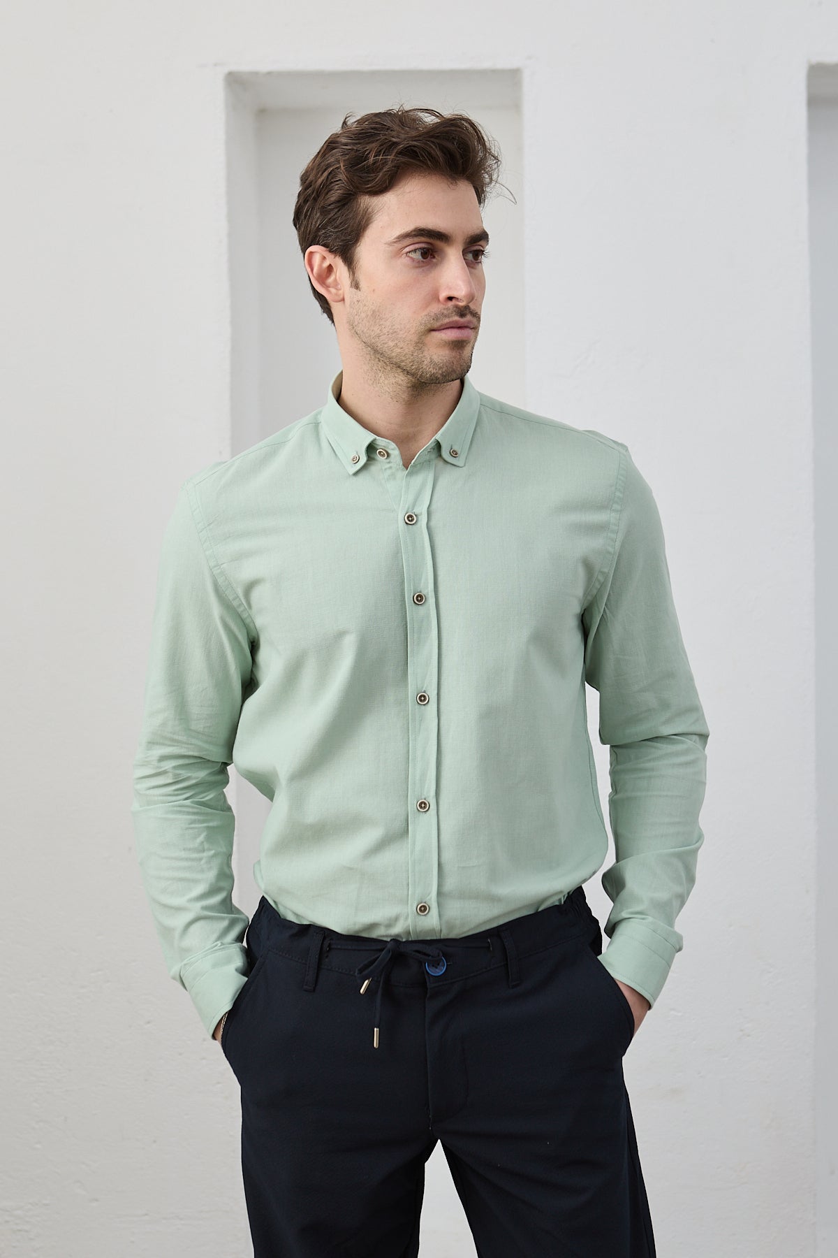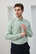 %100 Pamuk Keten Görünümlü Slim Fit Flam Su Yeşili Erkek Gömlek