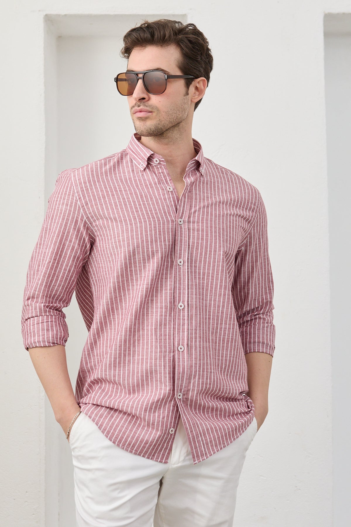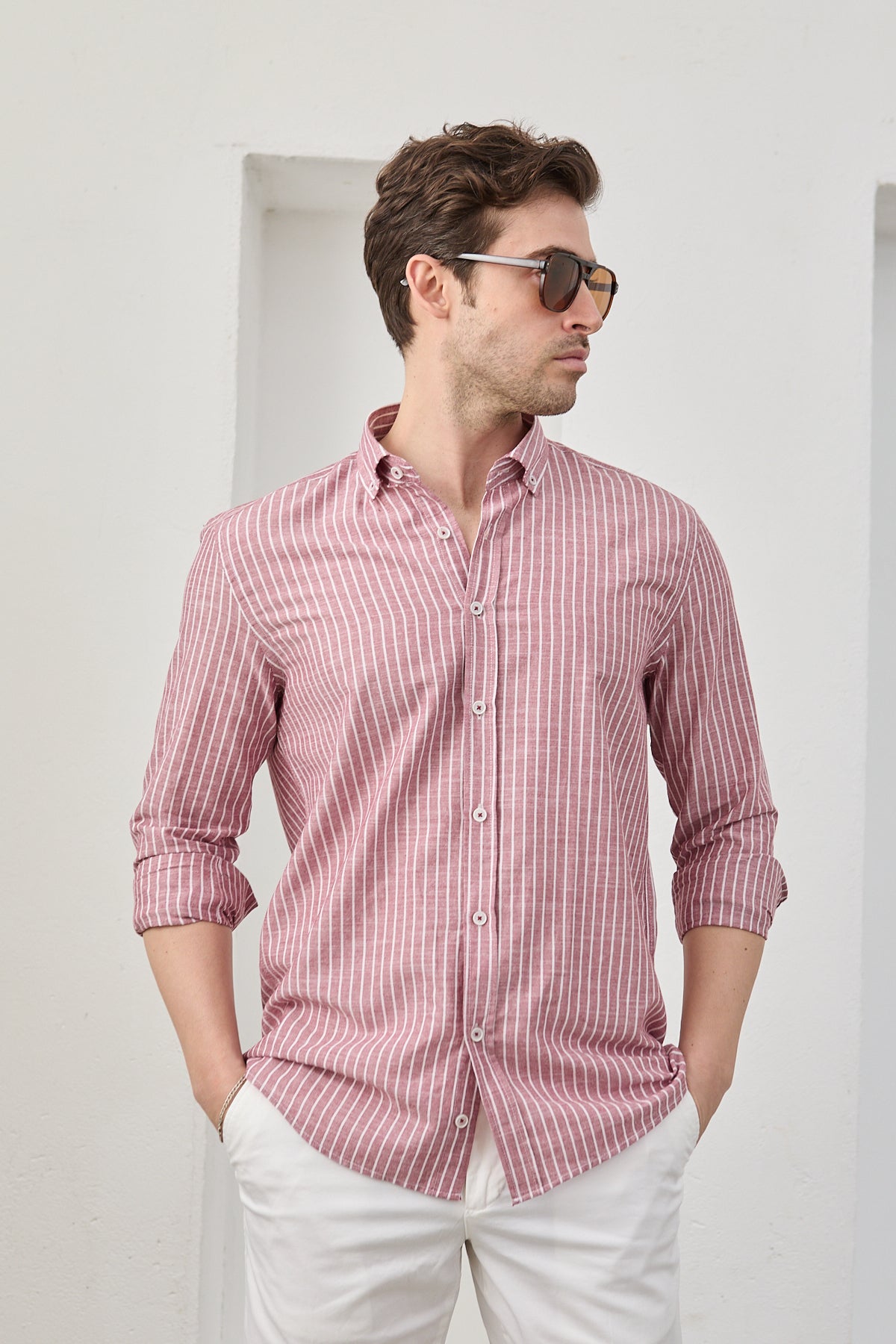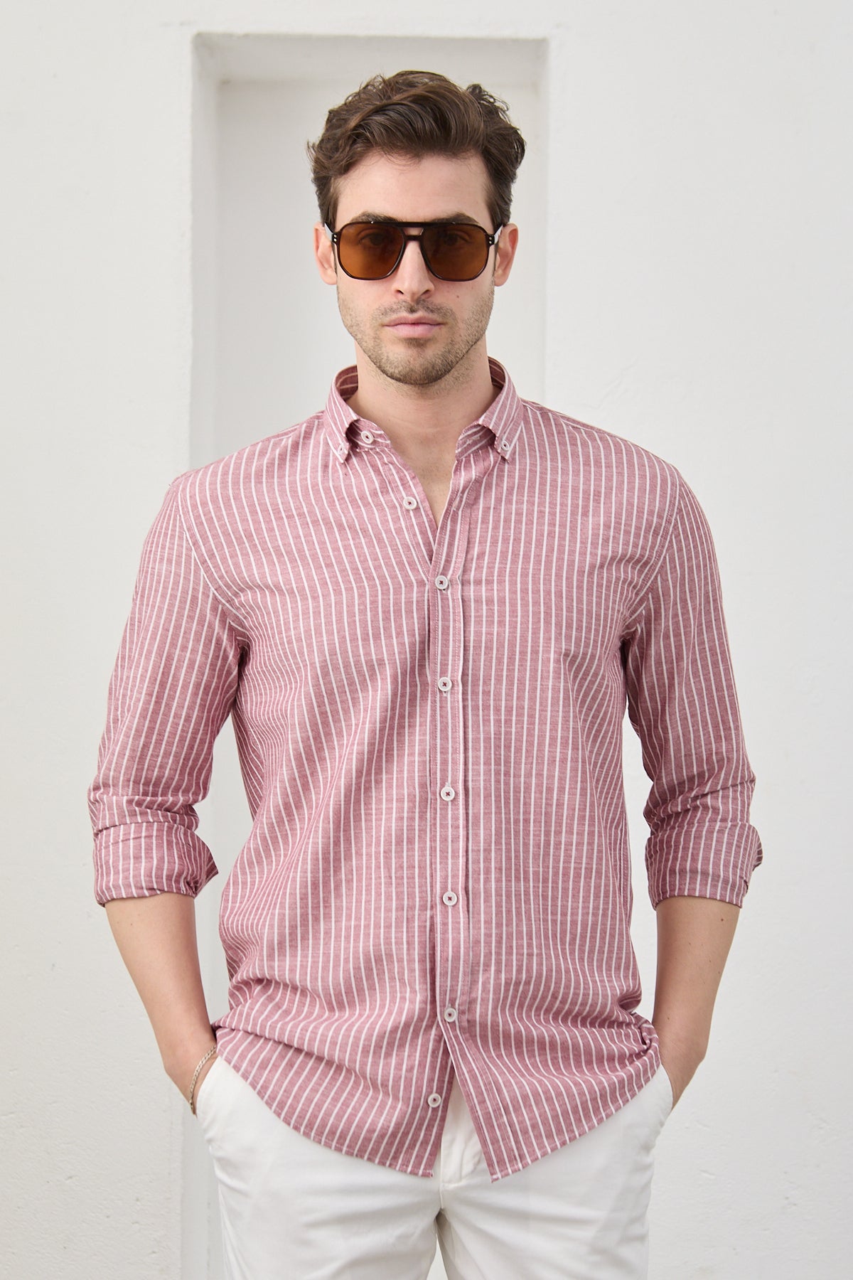 %100 Pamuk Keten Görünümlü Slim Fit Kırmızı Beyaz Çizgili Erkek Gömlek