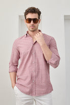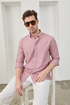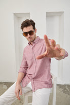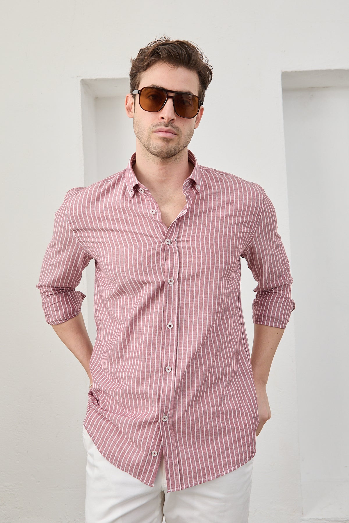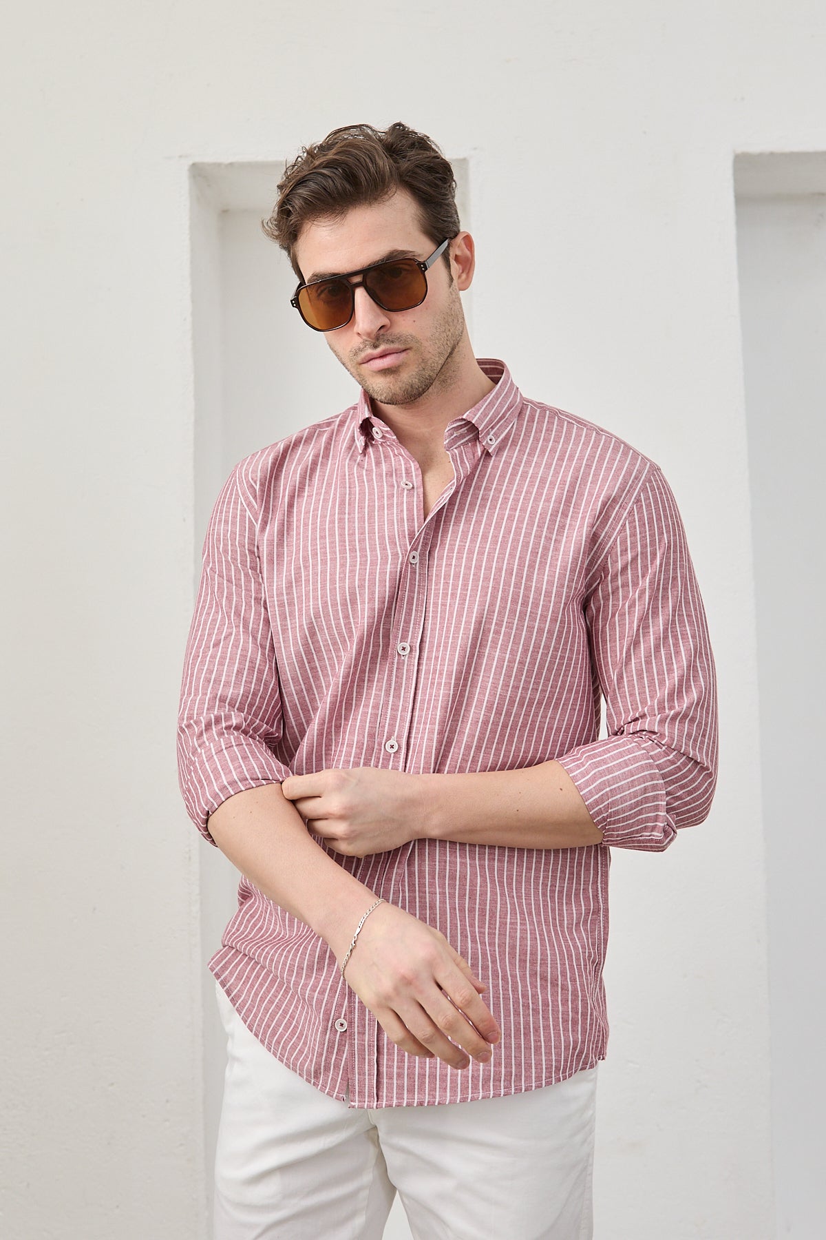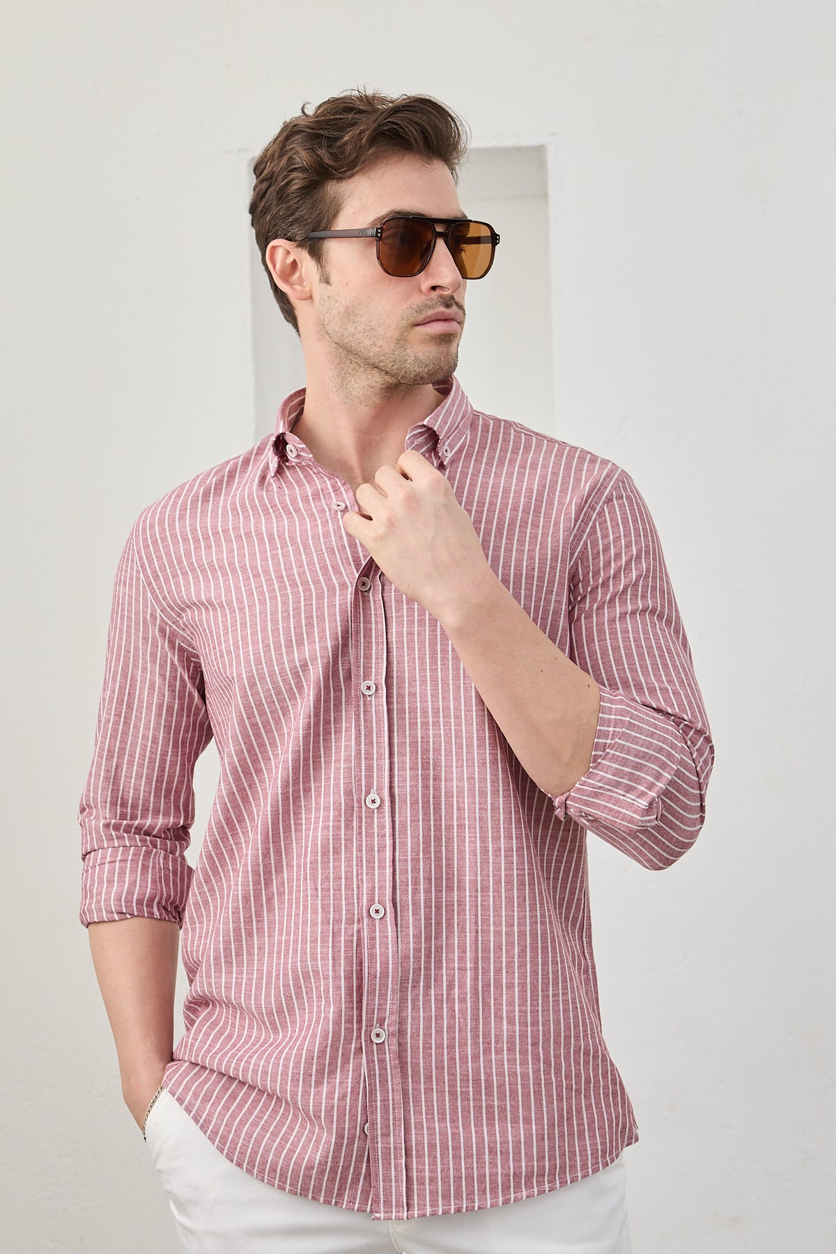 %100 Pamuk Keten Görünümlü Slim Fit Kırmızı Beyaz Çizgili Erkek Gömlek