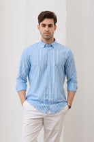 %100 Pamuk Keten Görünümlü Slim Fit Turkuaz İnce Çizgili Erkek Gömlek