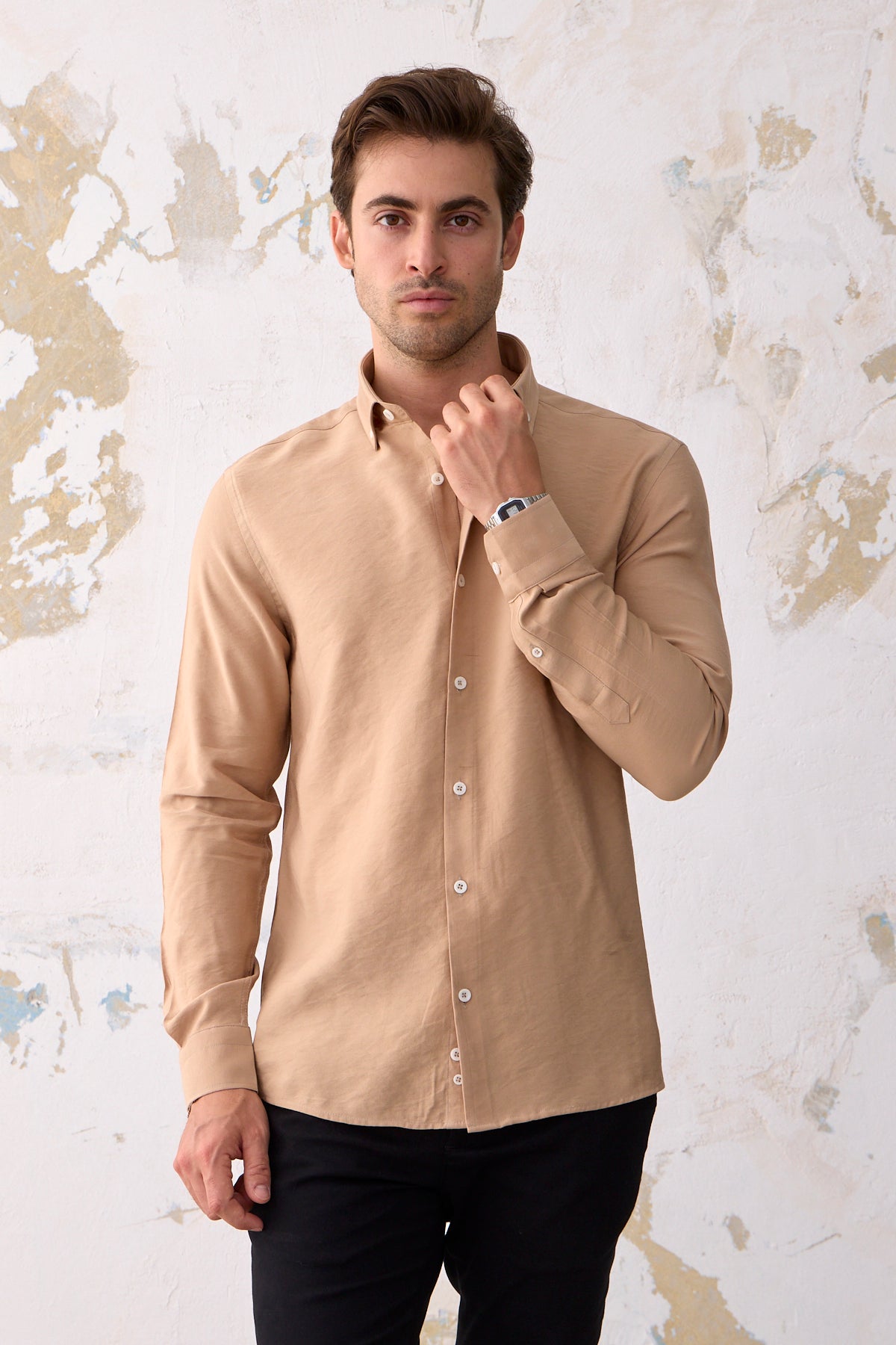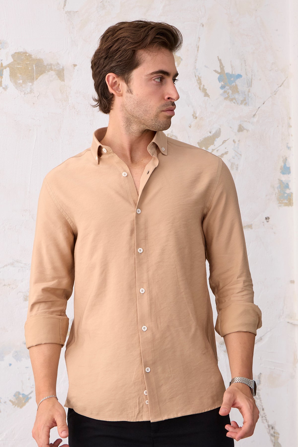 %100 Pamuk Modal Slim Fit Bej Erkek Gömlek