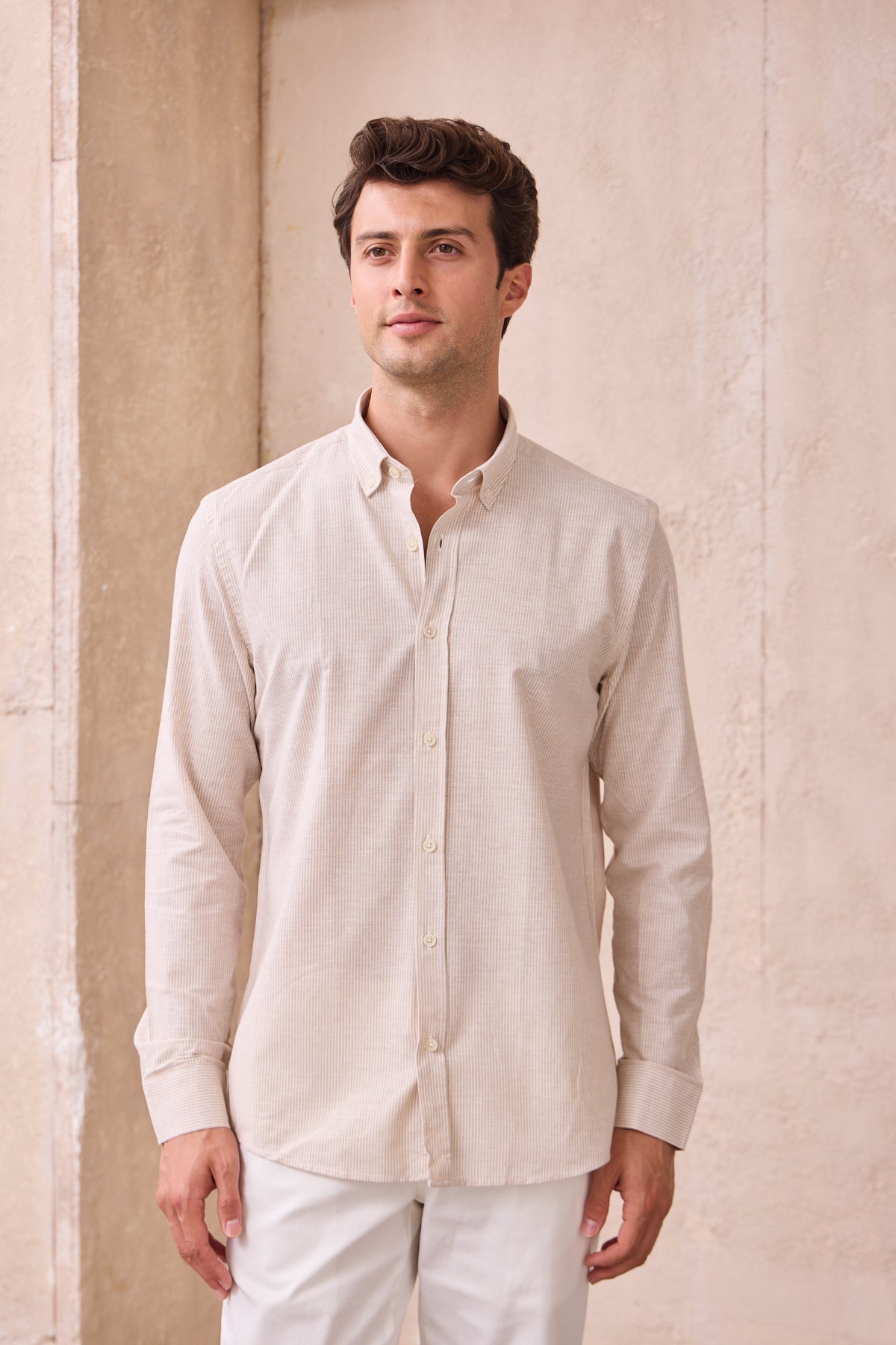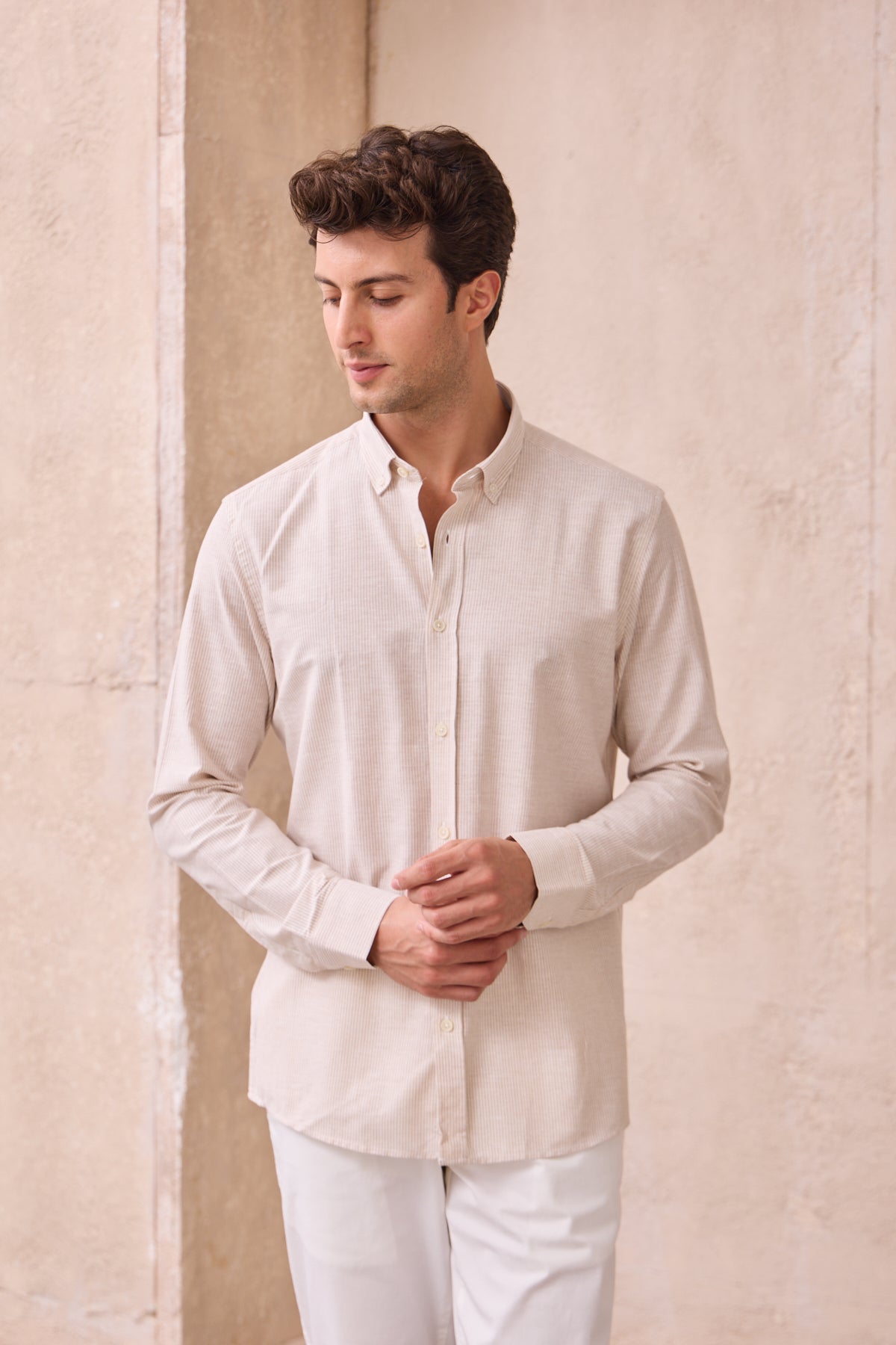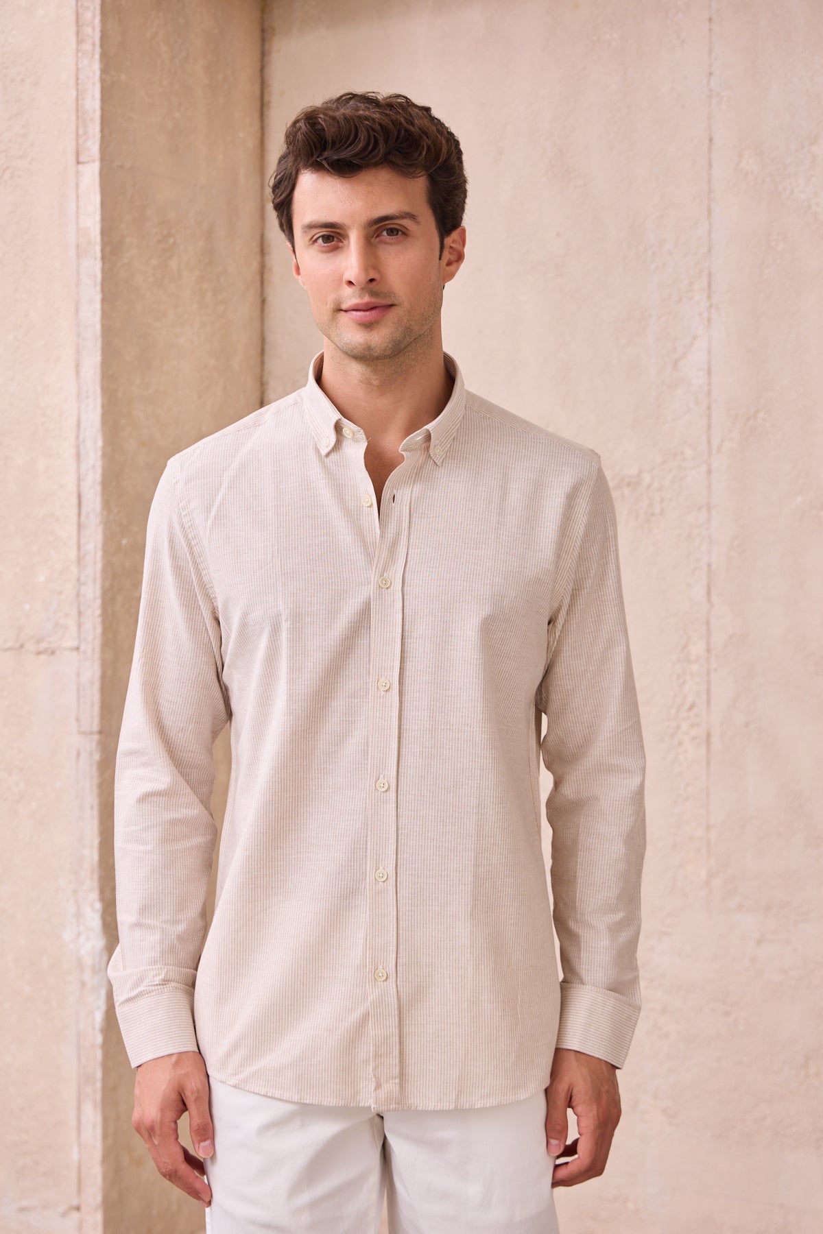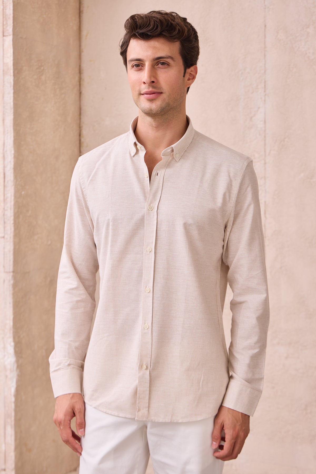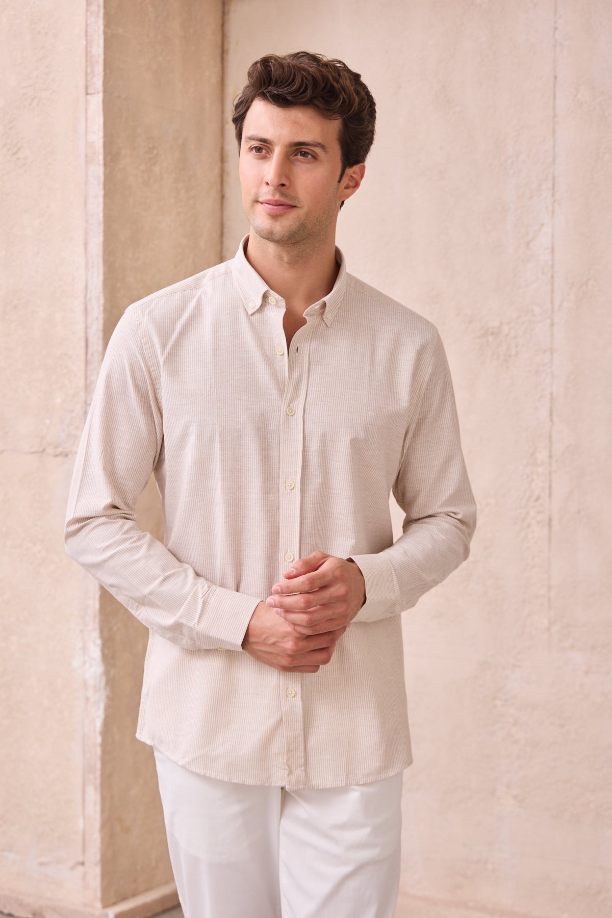 Giza %100 Pamuk Keten Görünümlü Slim Fit Bej Sık Çizgili Erkek Gömlek