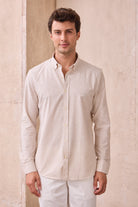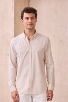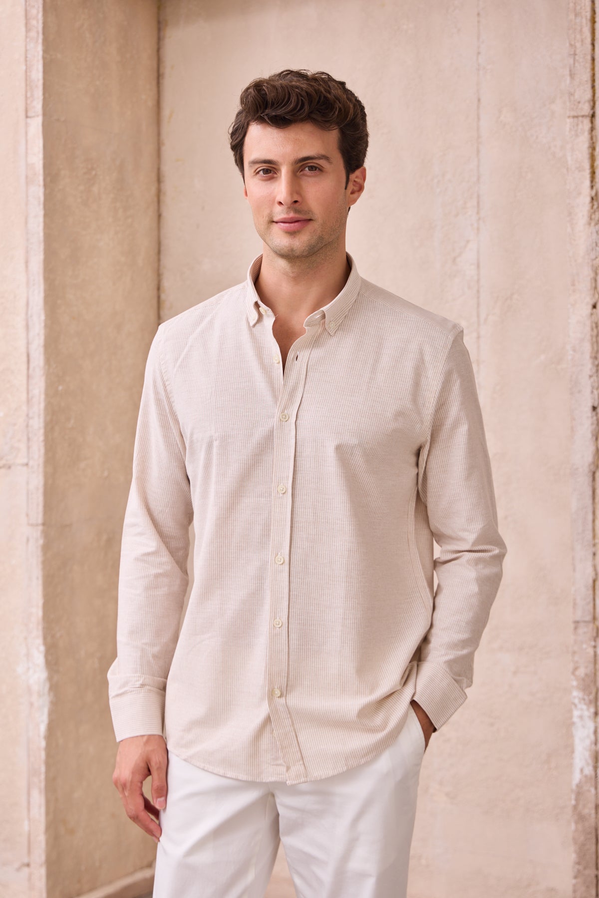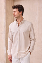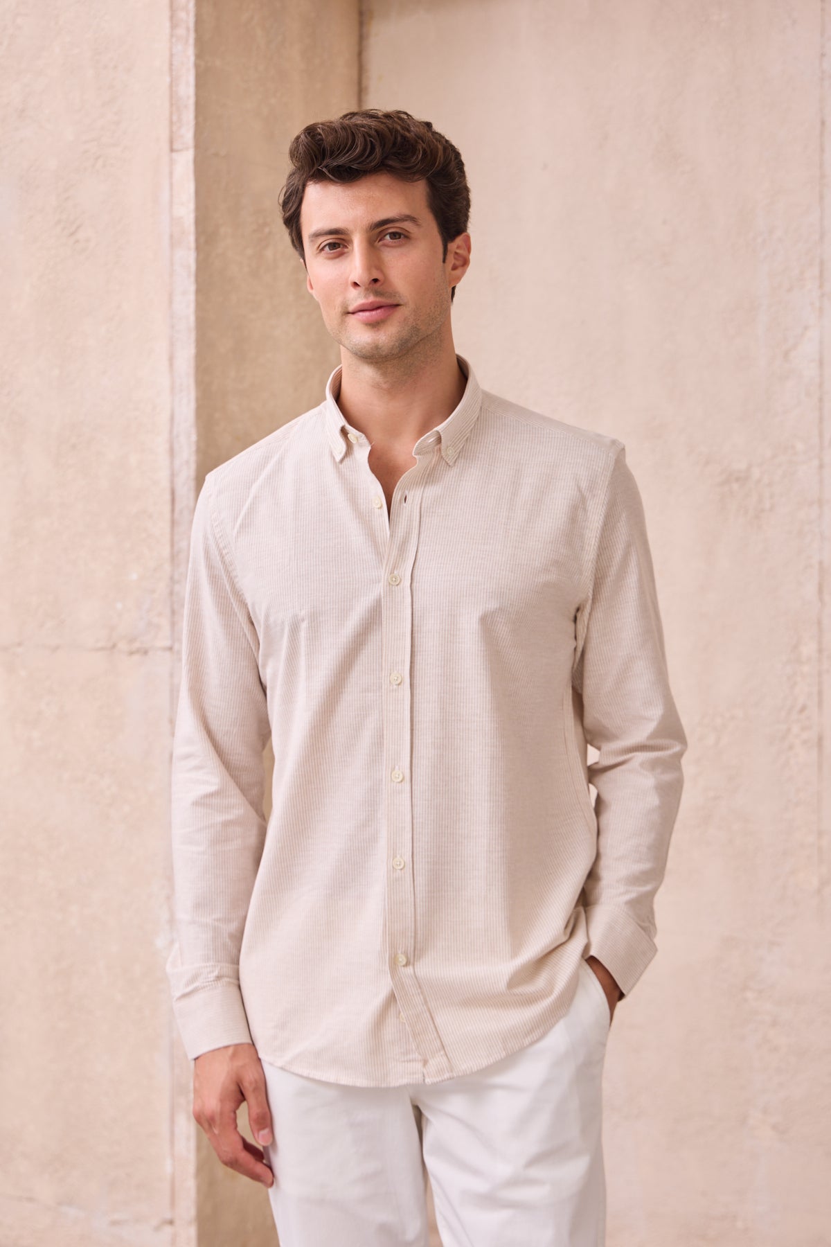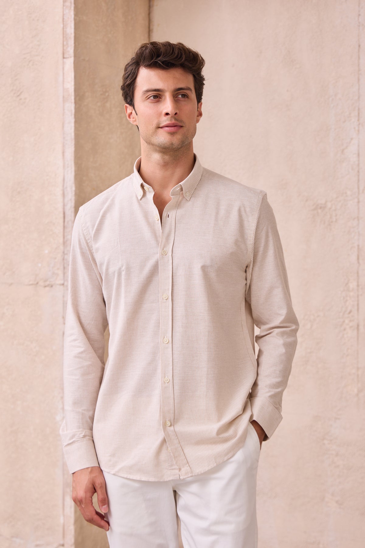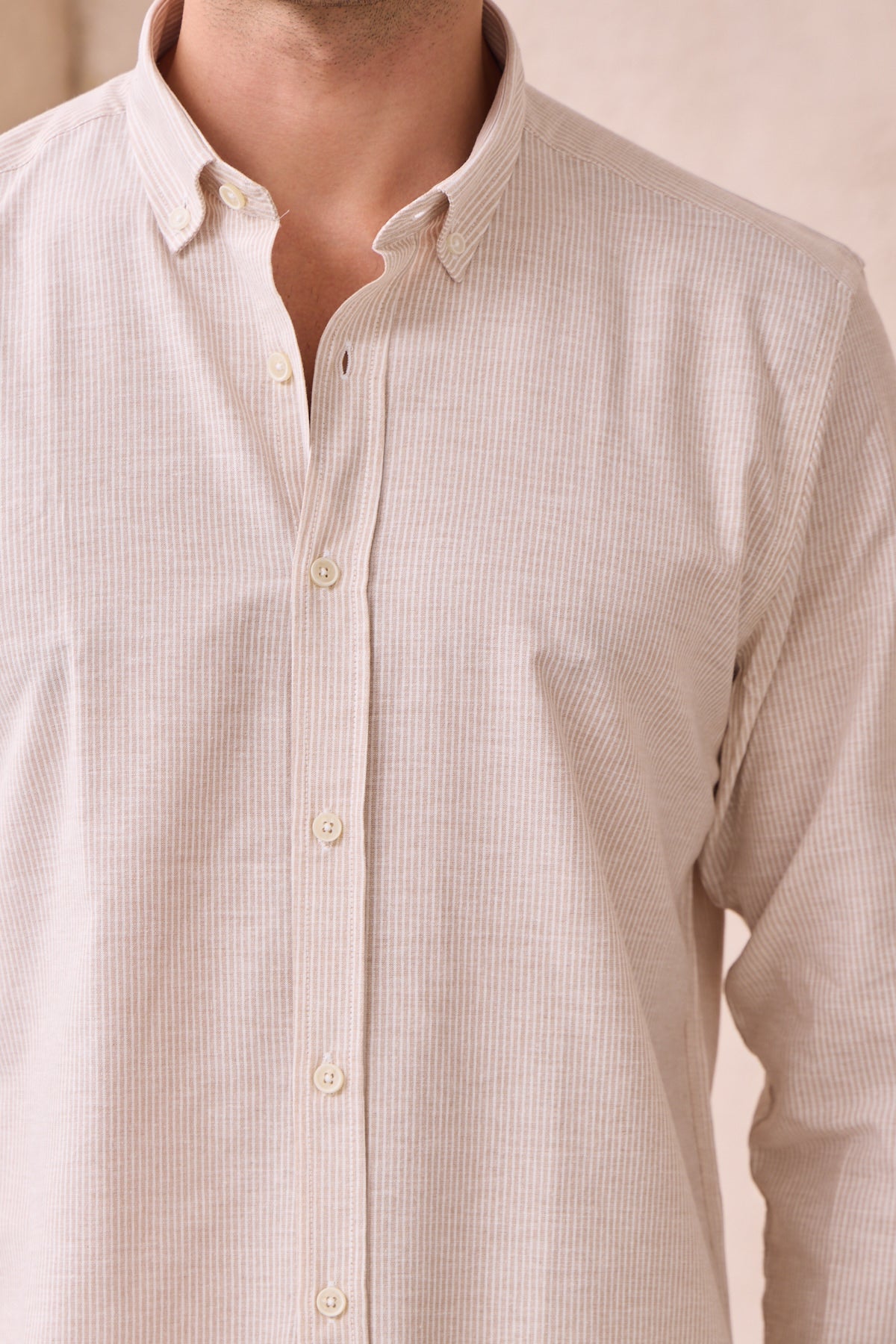 Giza %100 Pamuk Keten Görünümlü Slim Fit Bej Sık Çizgili Erkek Gömlek