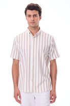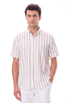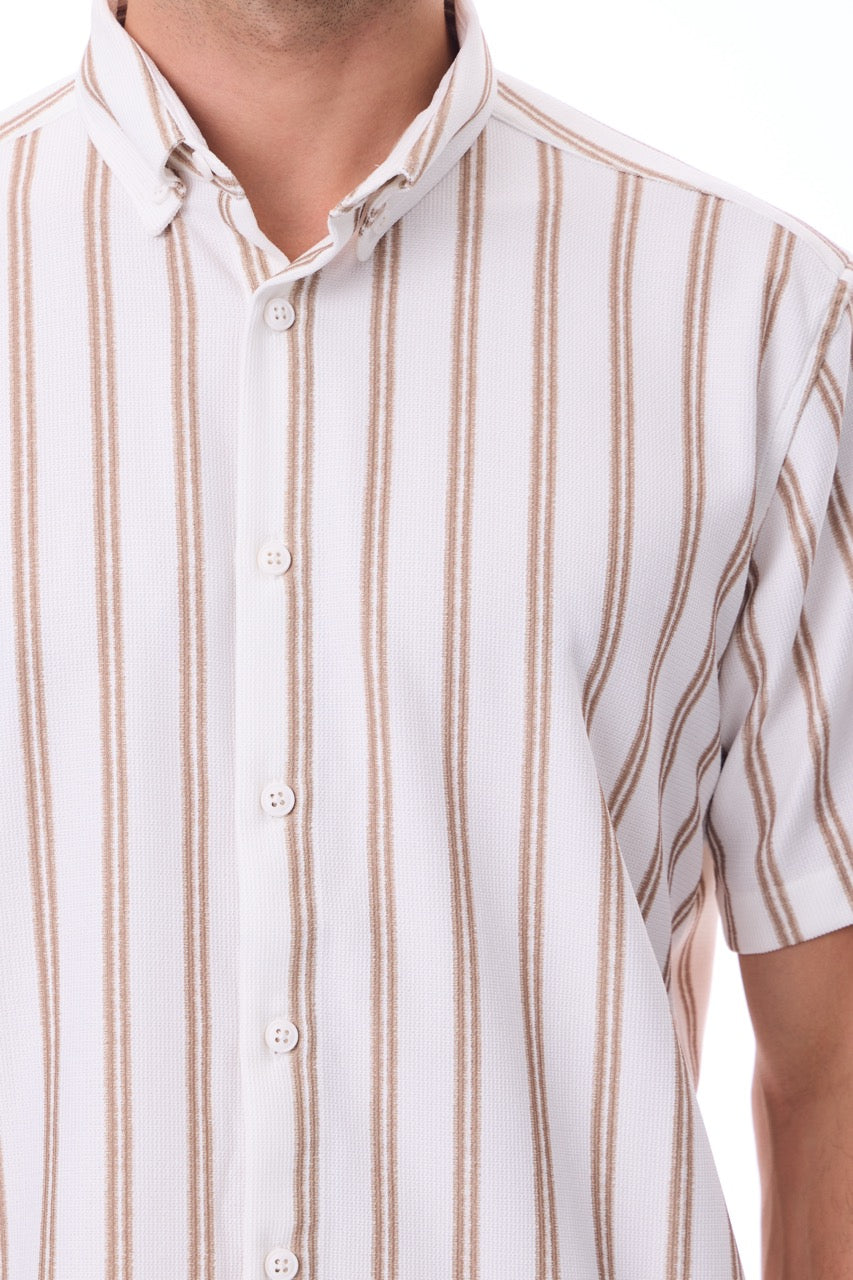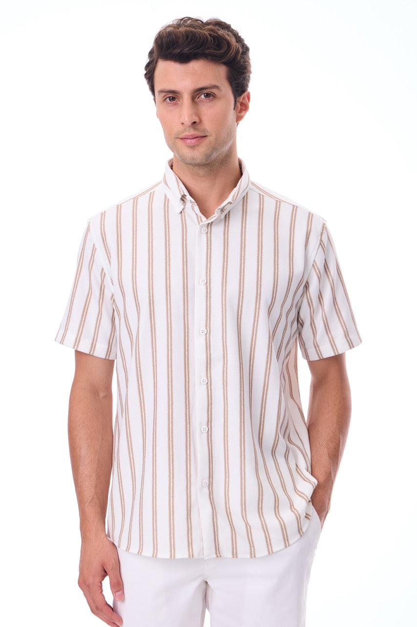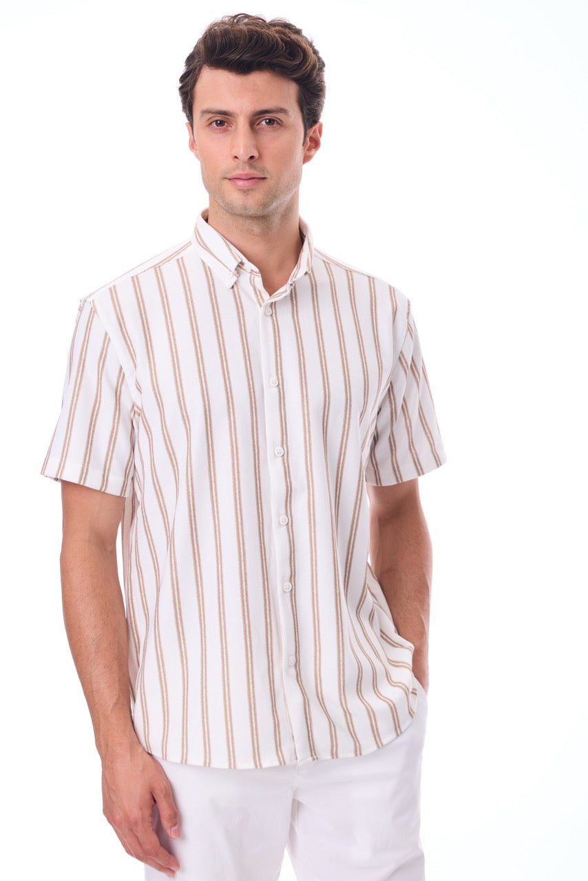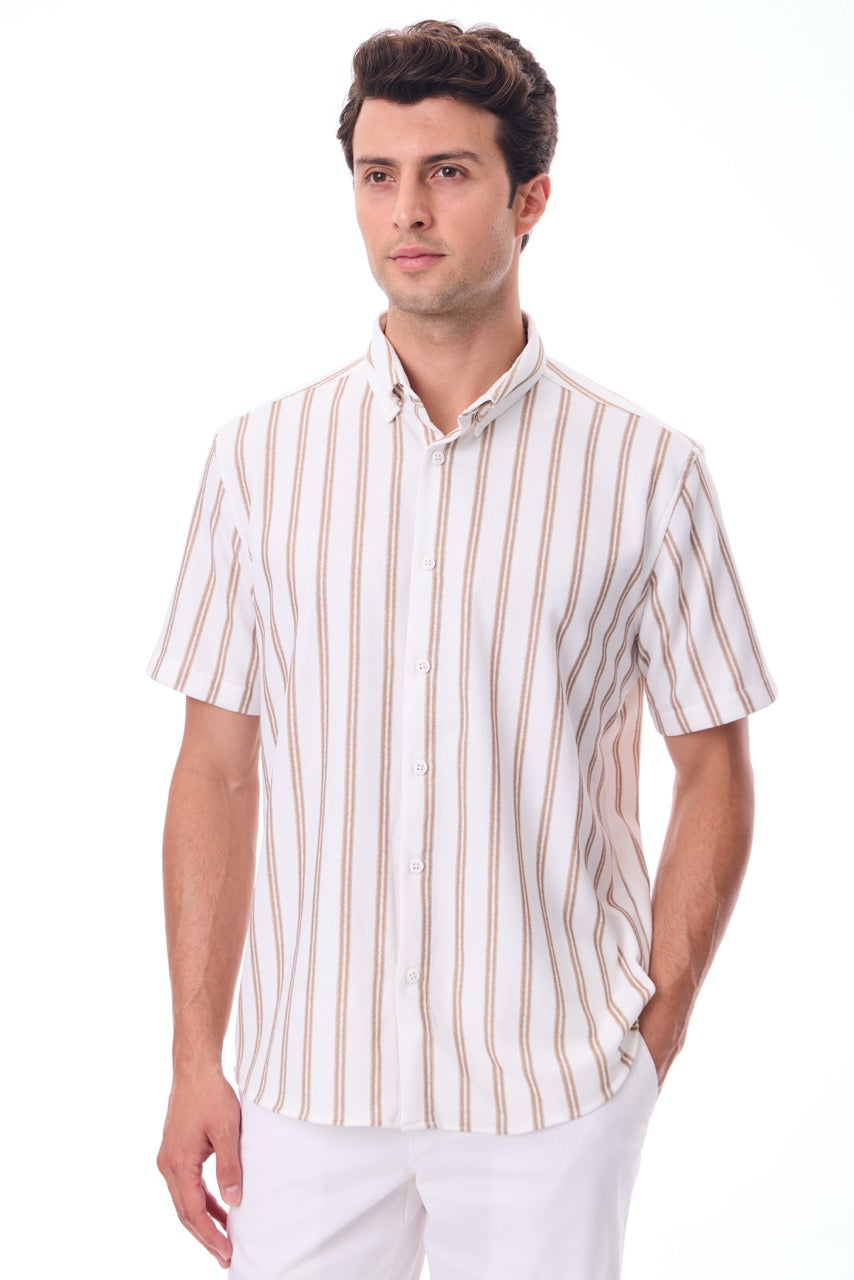 Kısa Kollu Baskılı Çizgili Örme Slim Fit Bej Erkek Gömlek