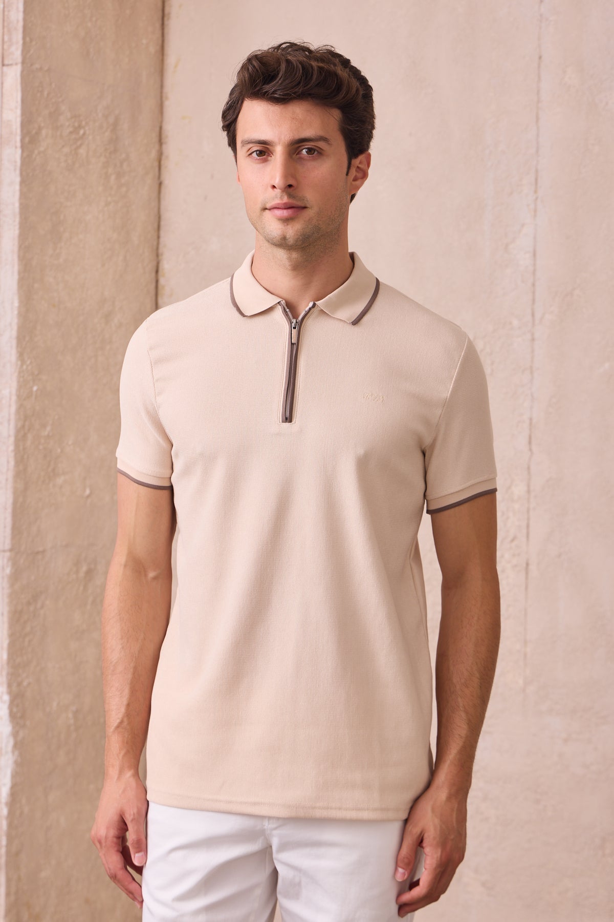Kısa Kollu Örme Slim Fit Fermuarlı Bej Erkek Polo Tişört