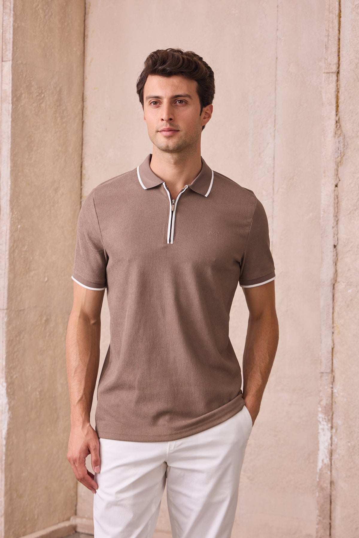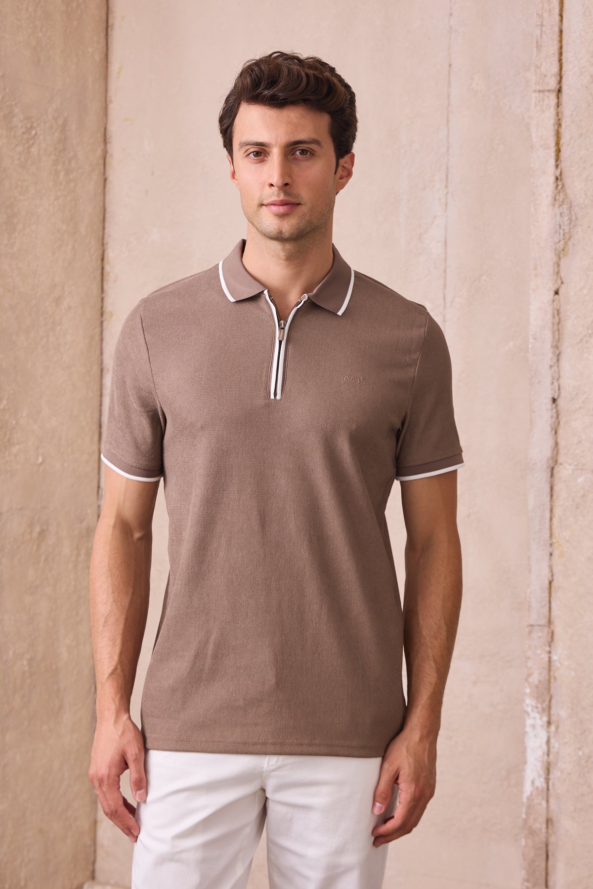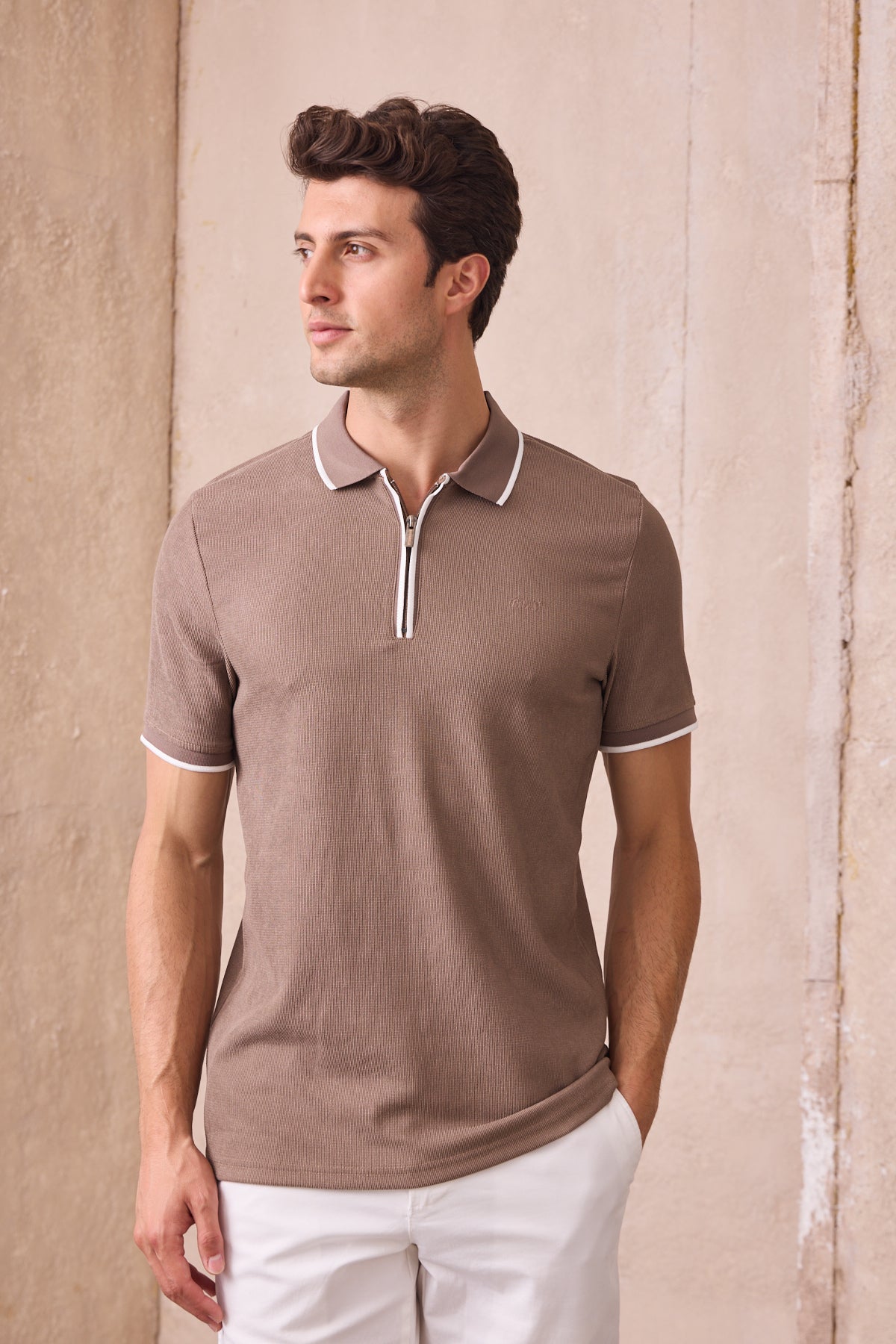 Kısa Kollu Örme Slim Fit Fermuarlı Toprak Erkek Polo Tişört