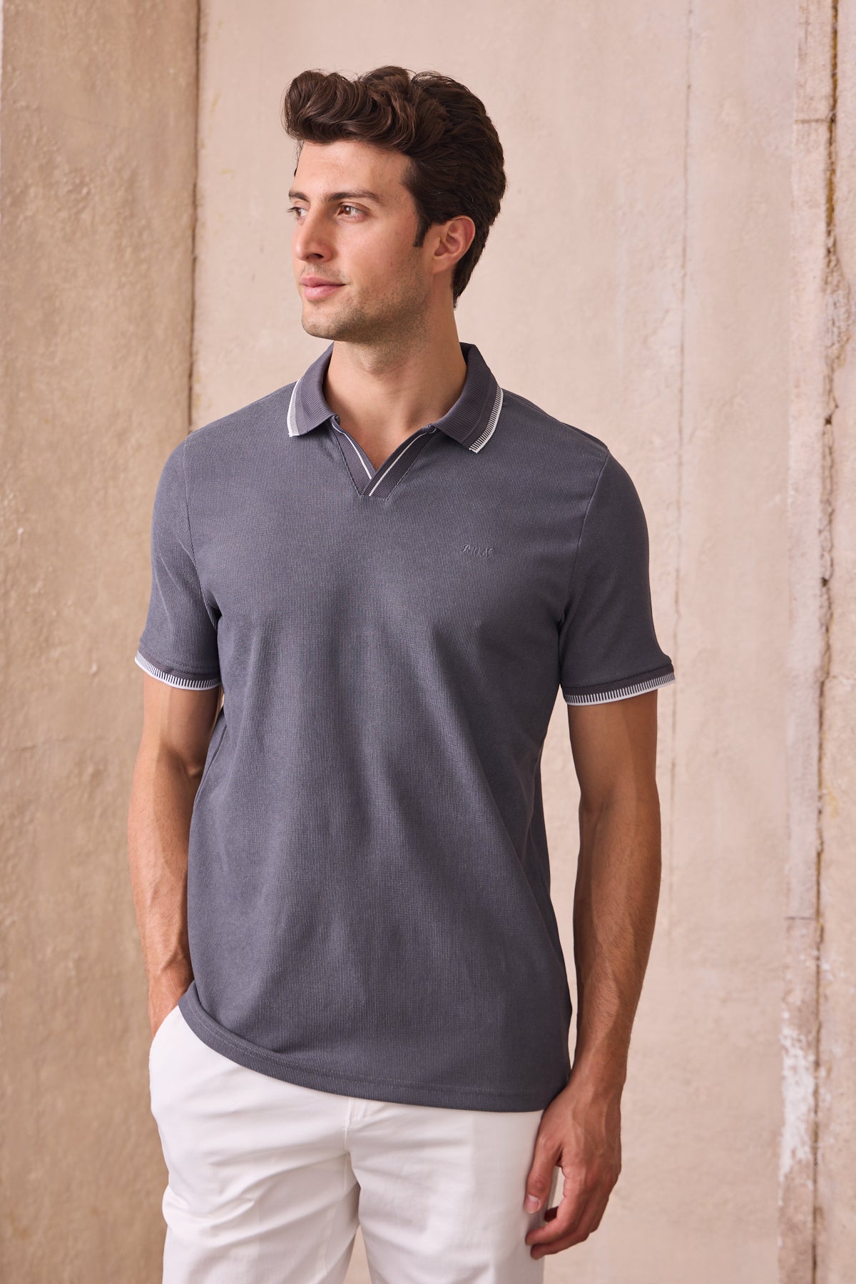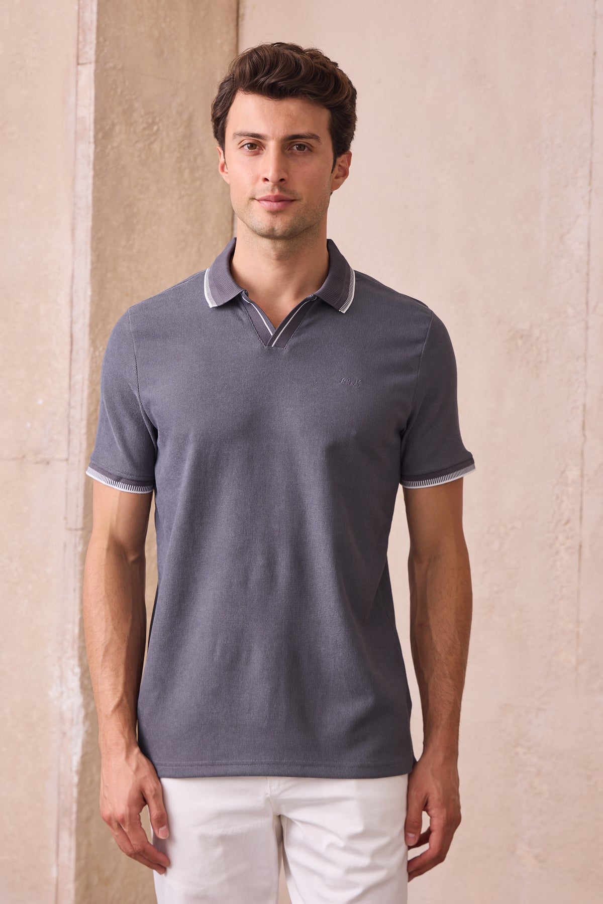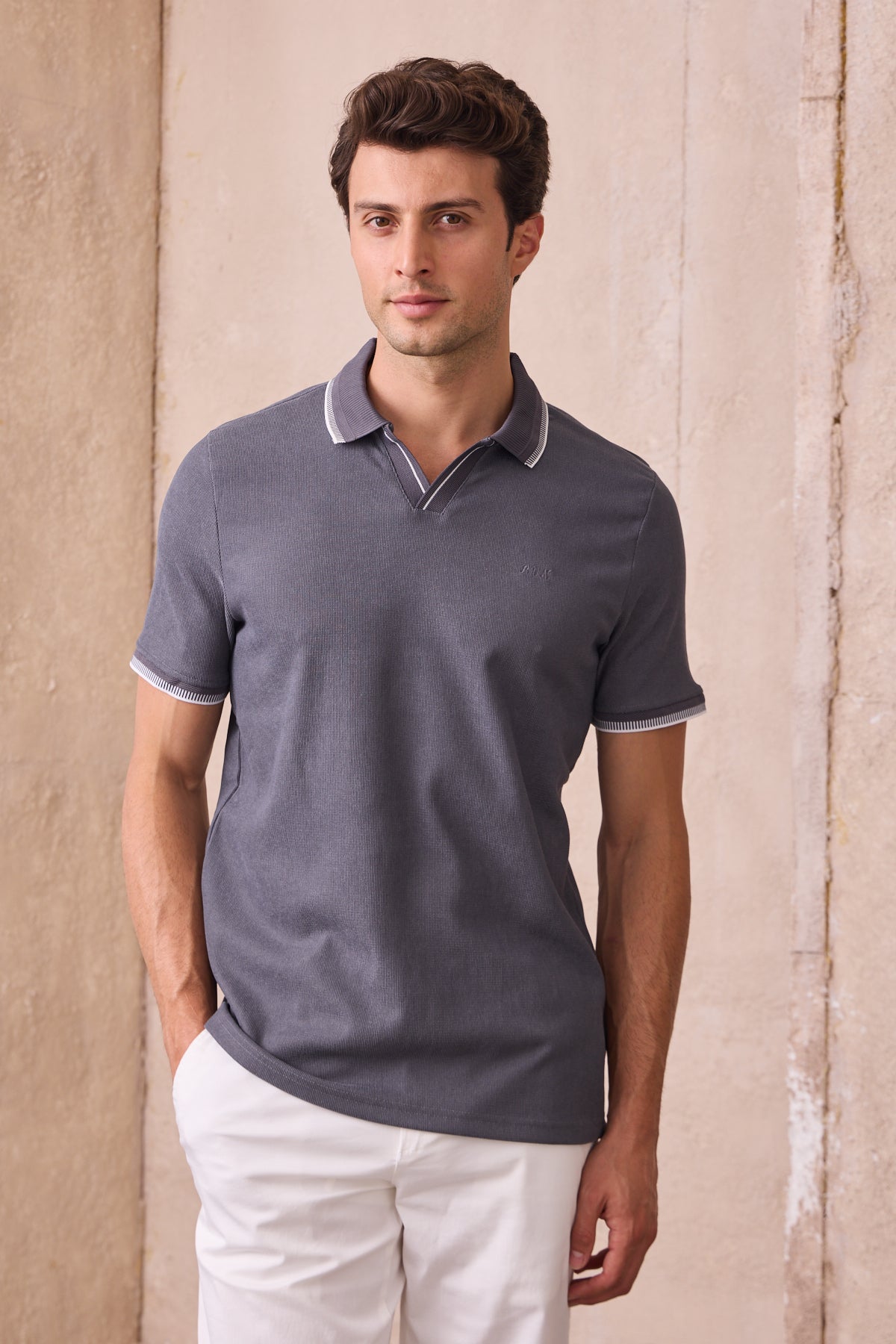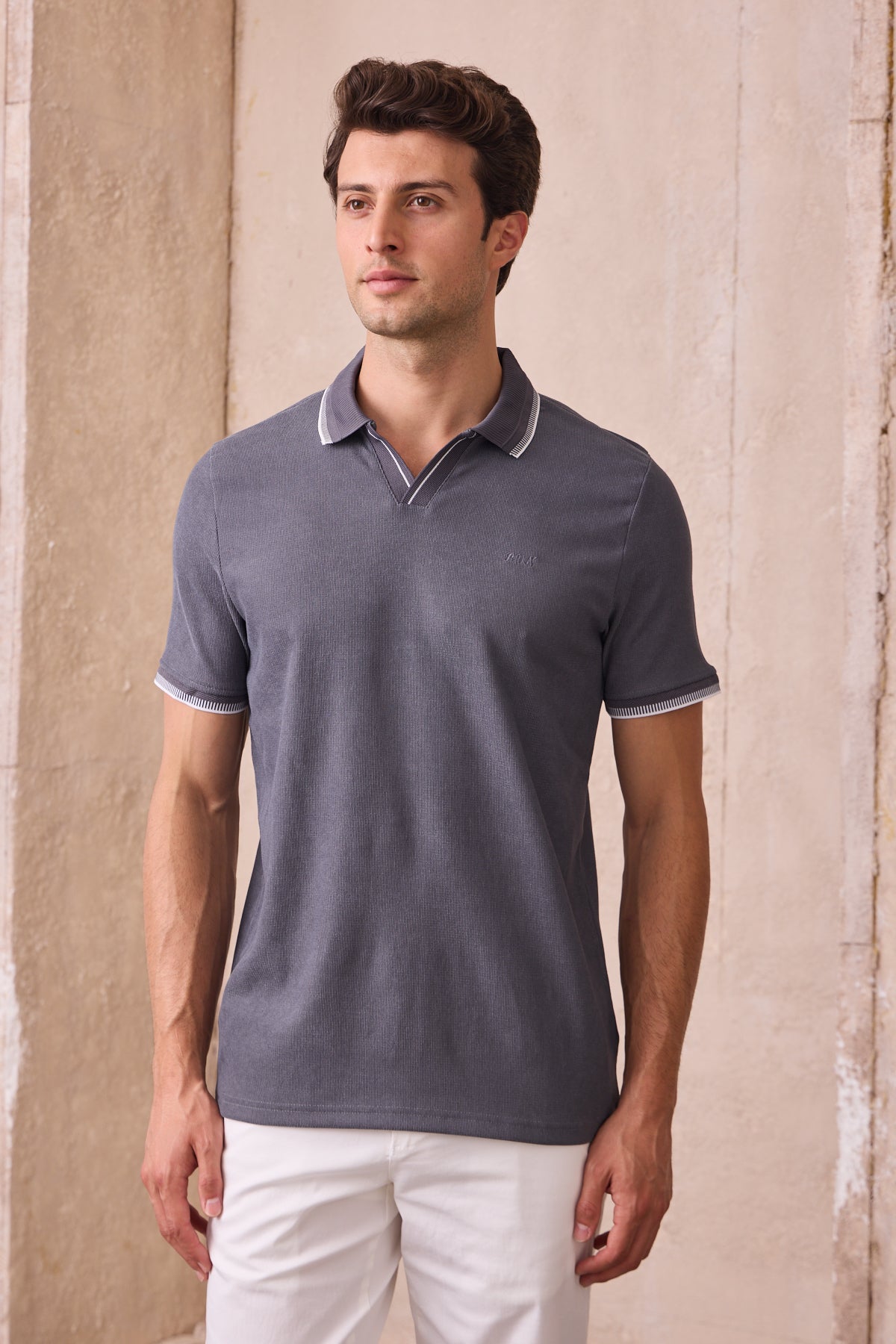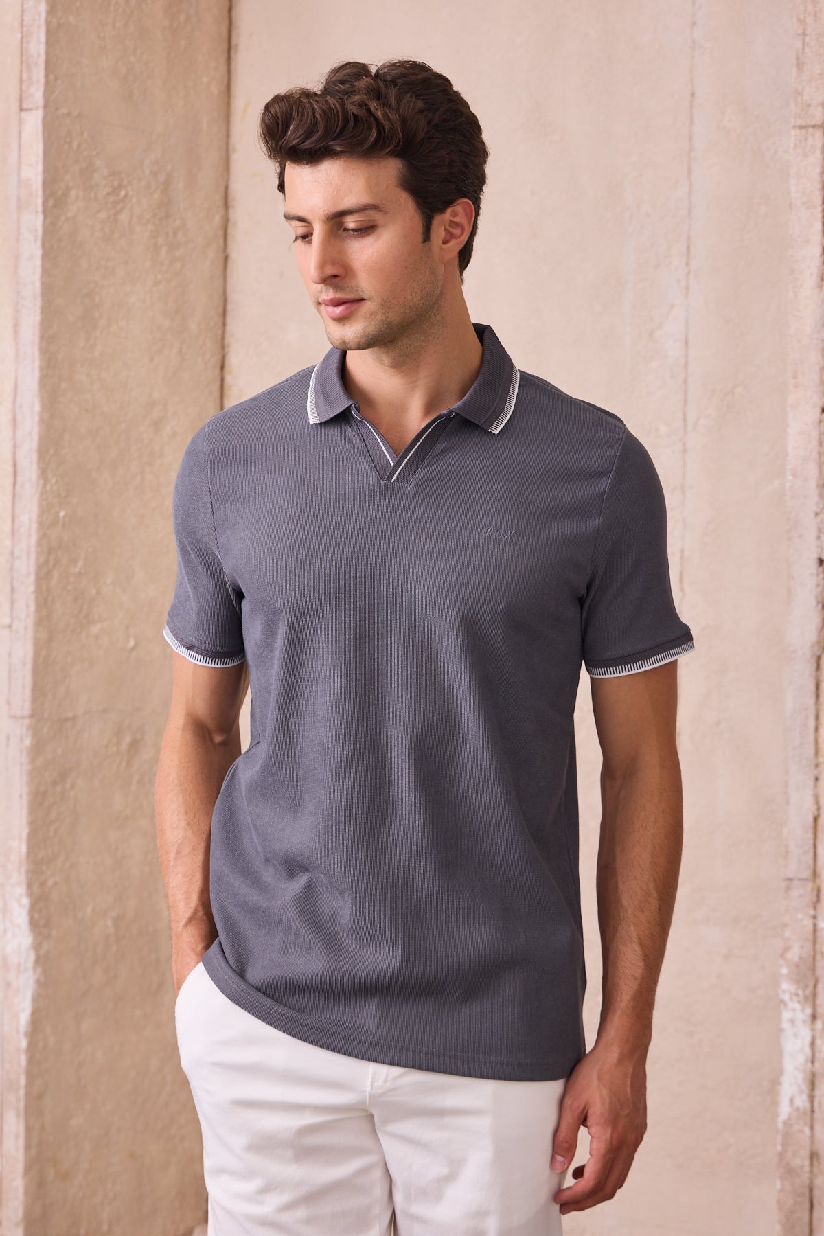 Kısa Kollu Örme Slim Fit Gri Erkek Polo Tişört