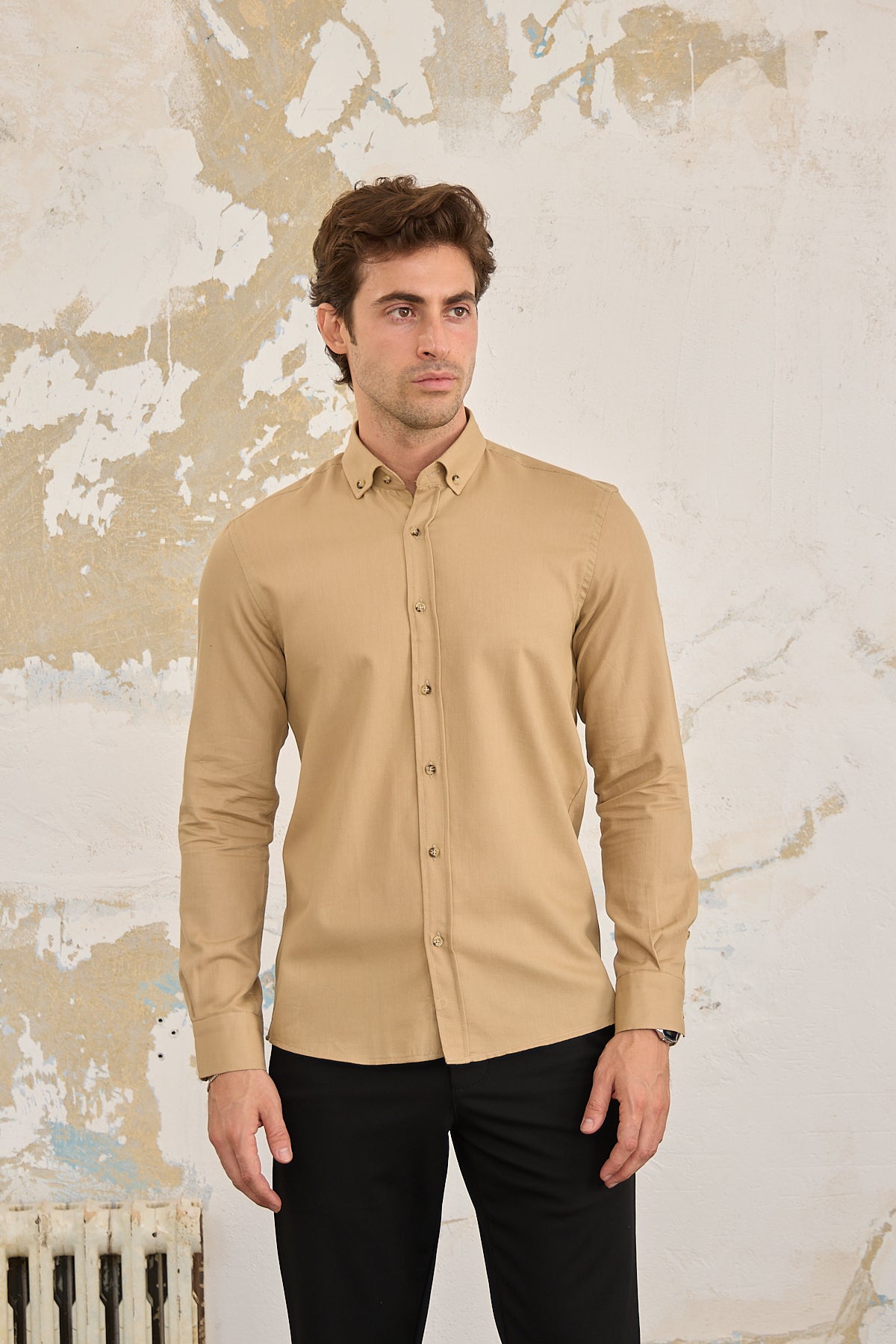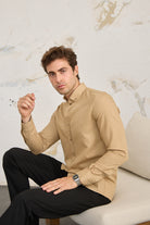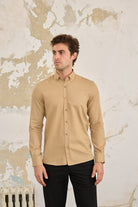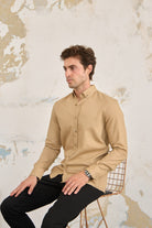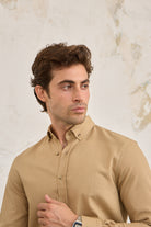 Pamuk Fitilli Kadife Düğmeli Slim Fit Bej Erkek Gömlek