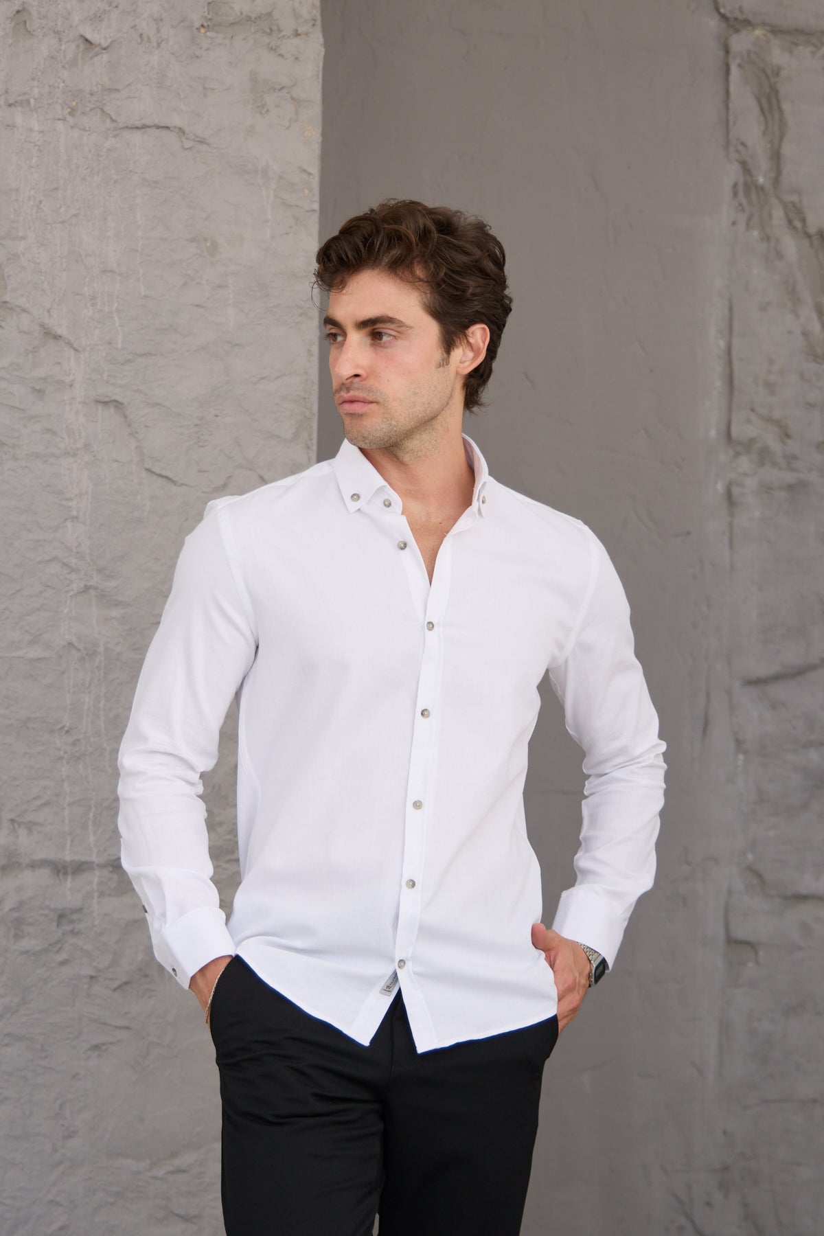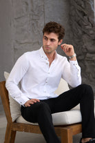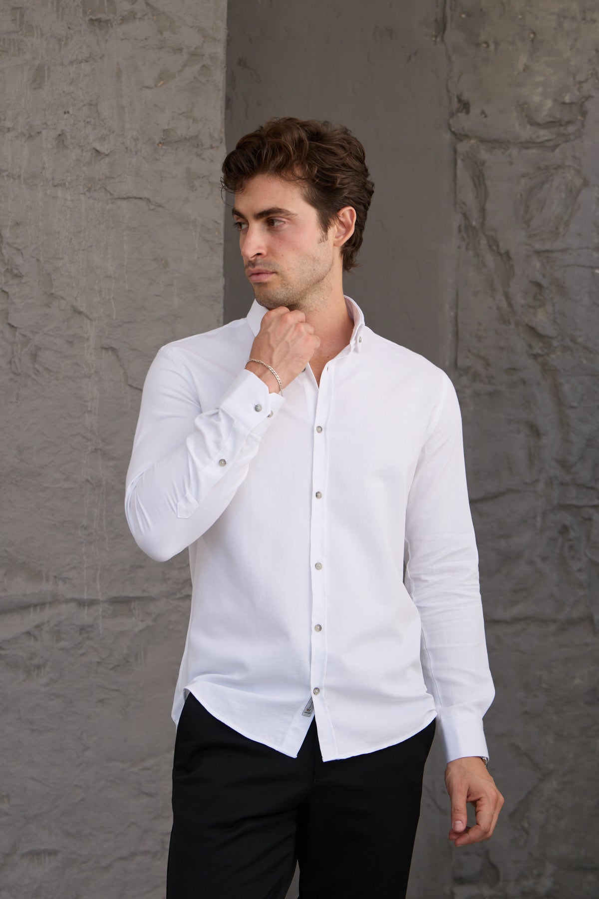 Pamuk Fitilli Kadife Düğmeli Slim Fit Beyaz Erkek Gömlek